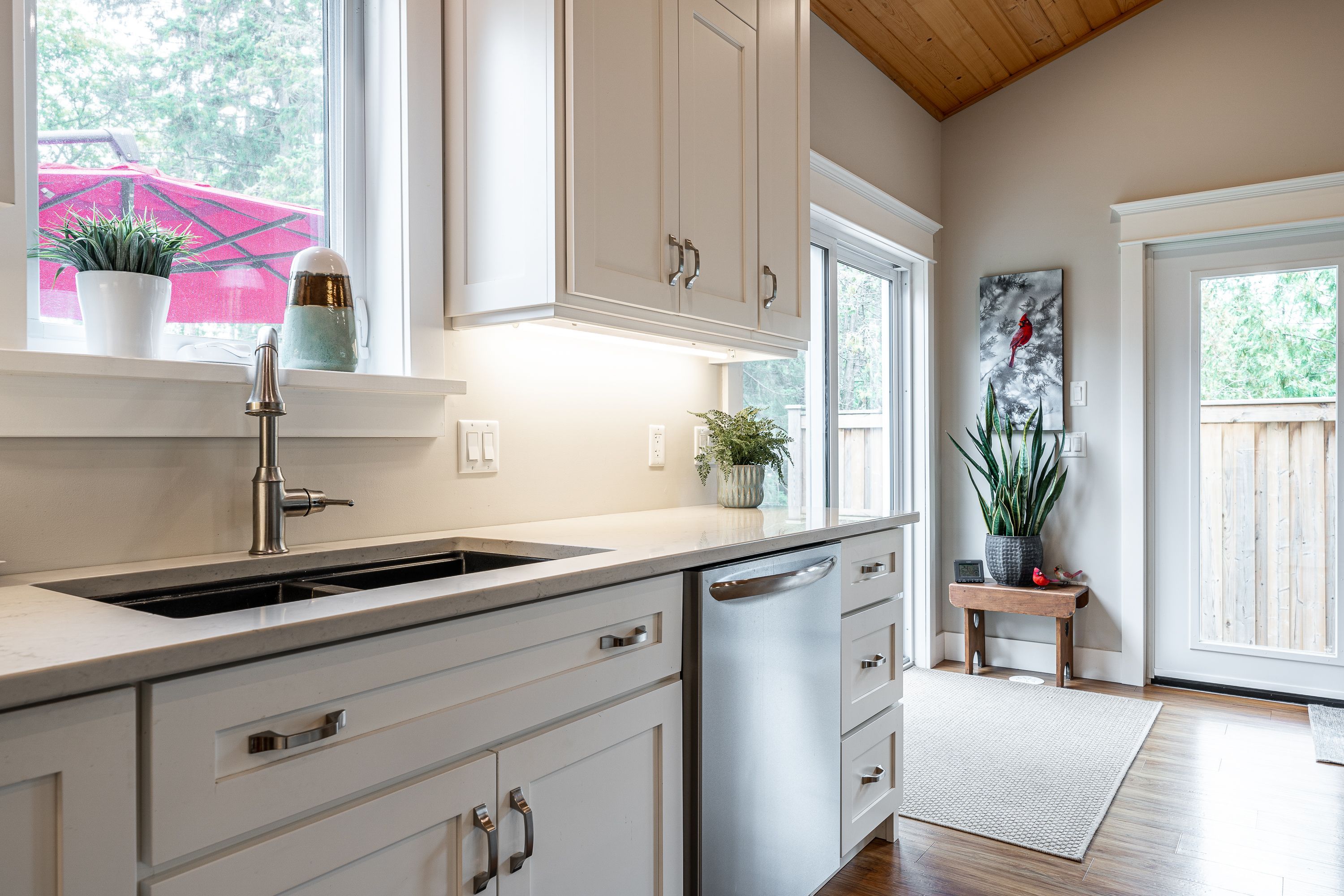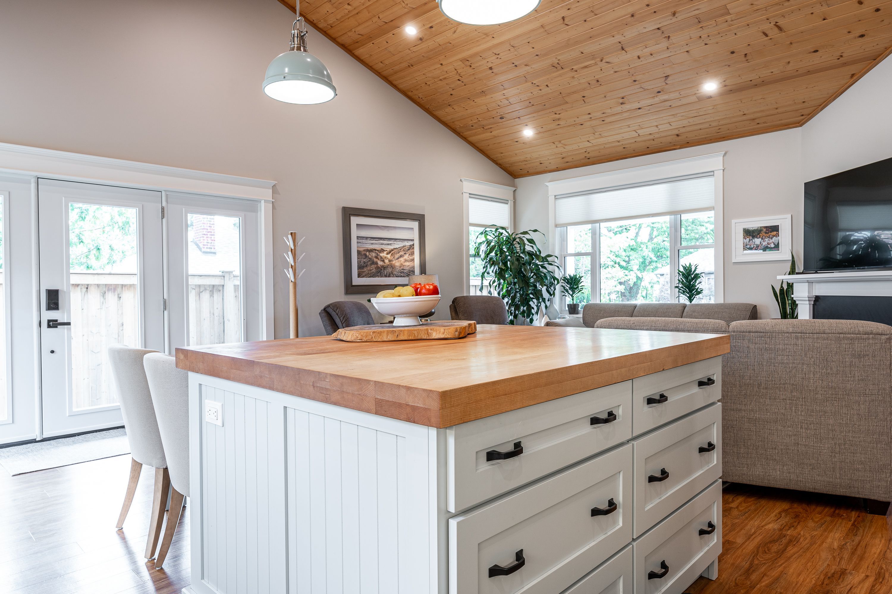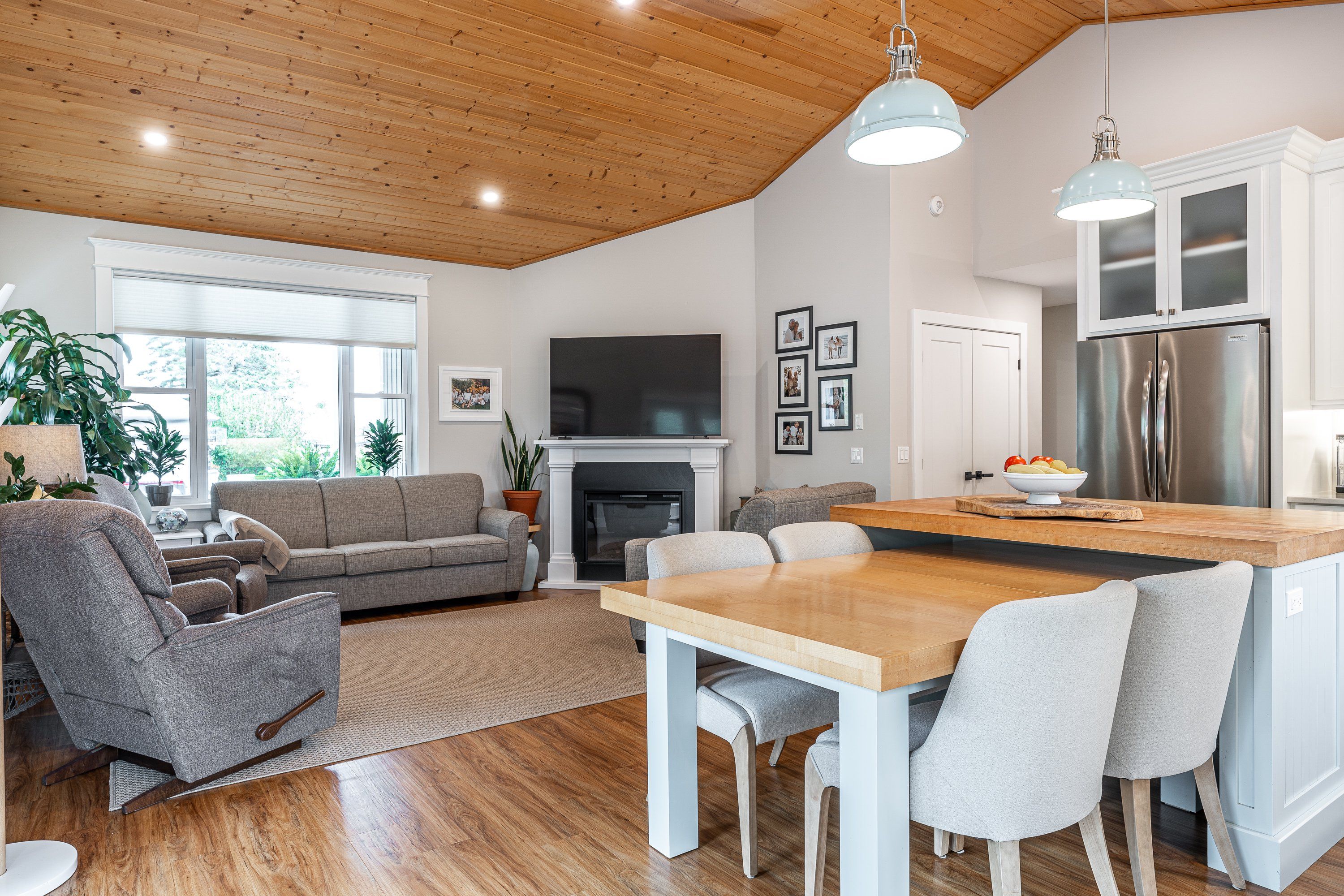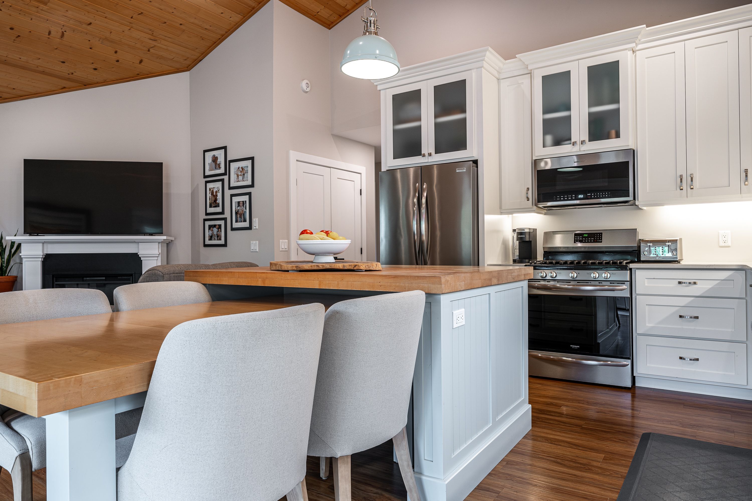 • Open concept living area with cathedral ceilings and a spacious quartz kitchen.