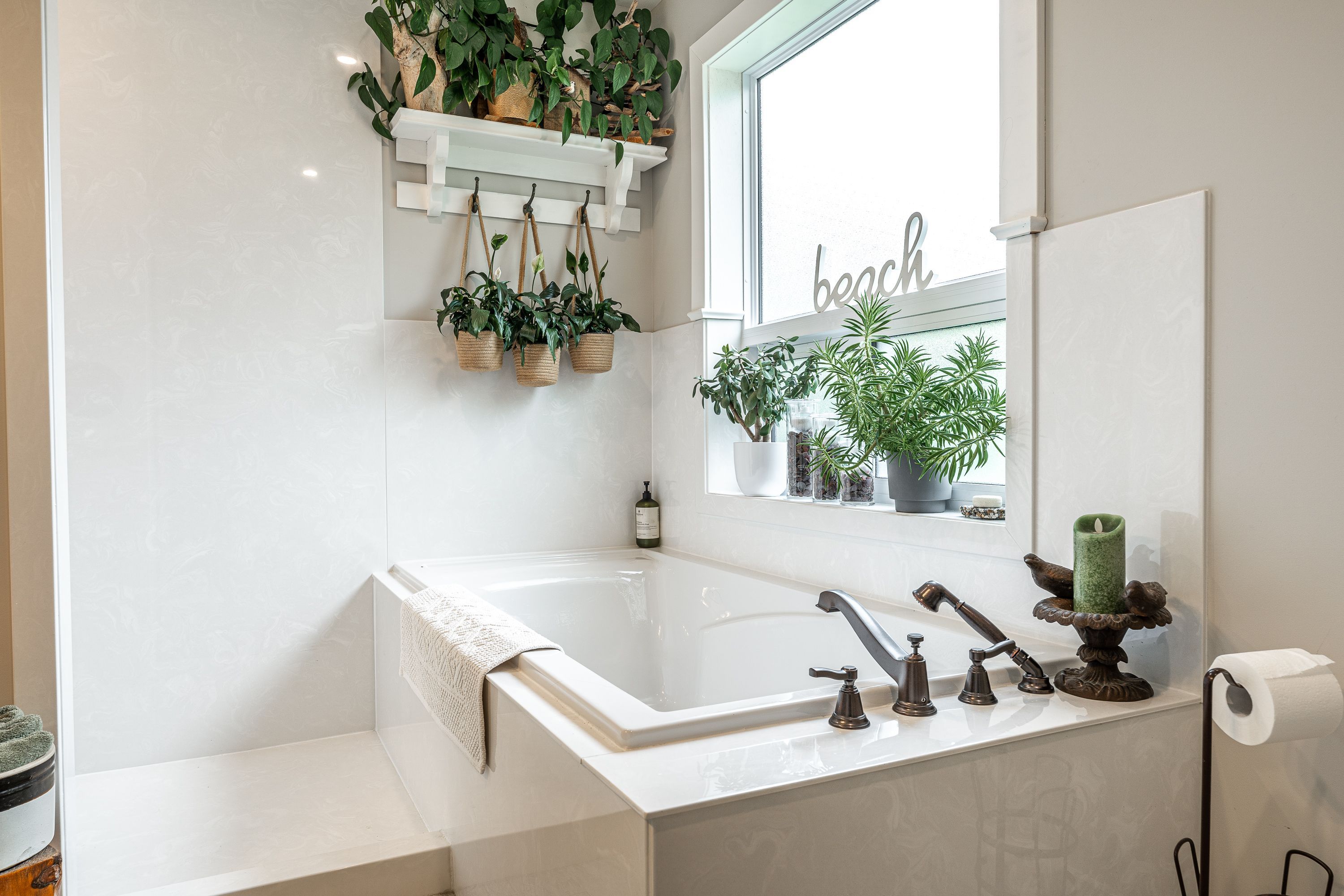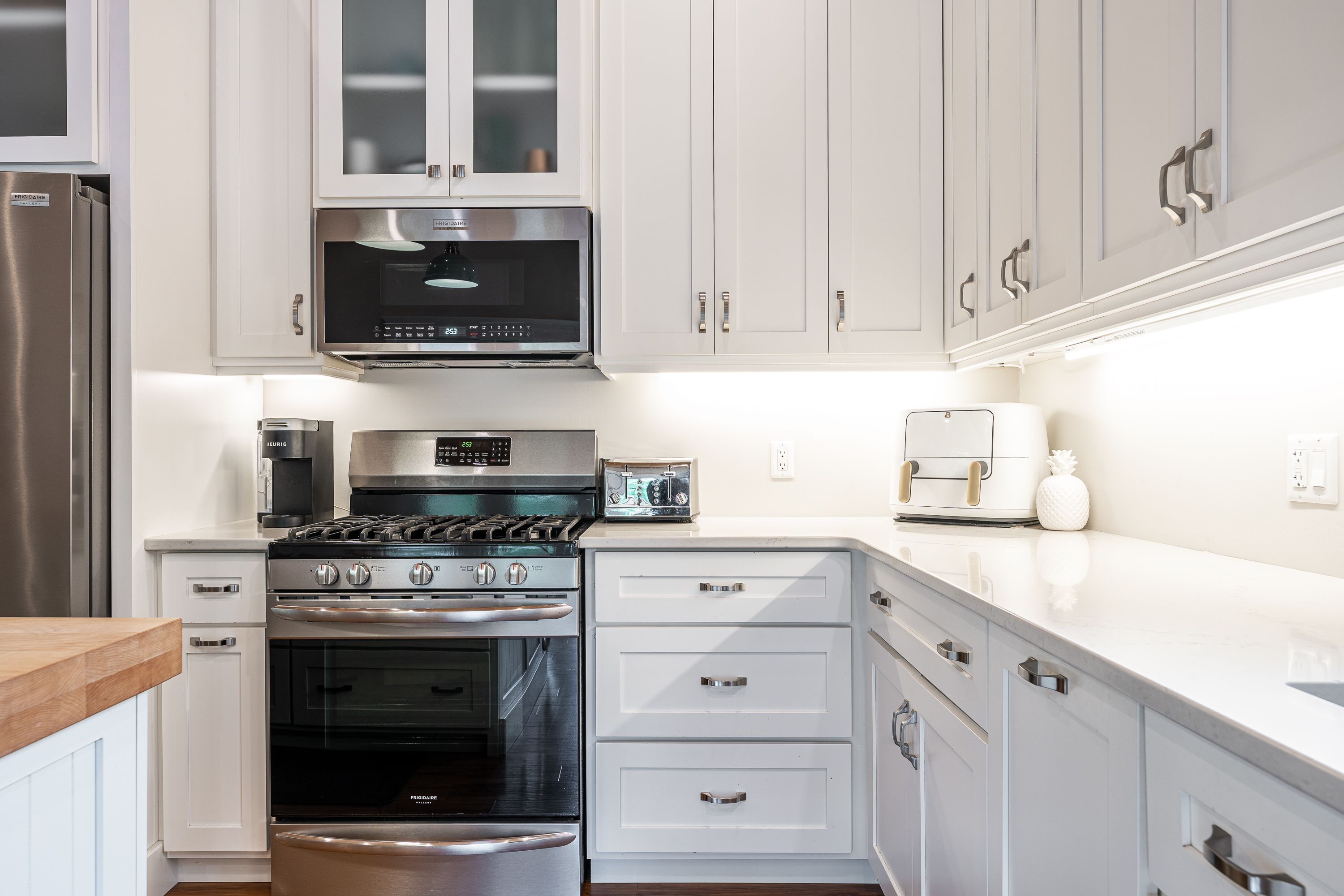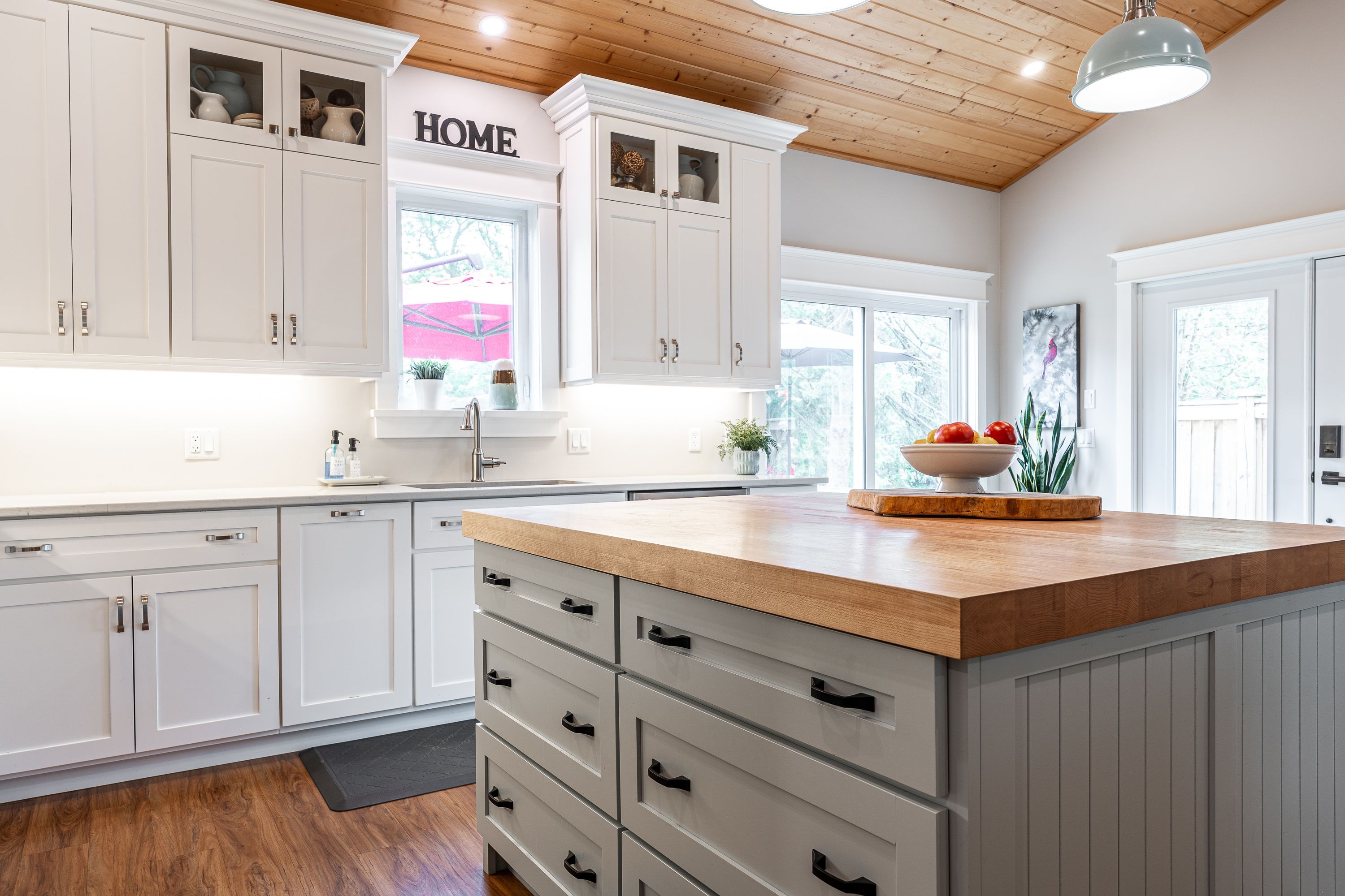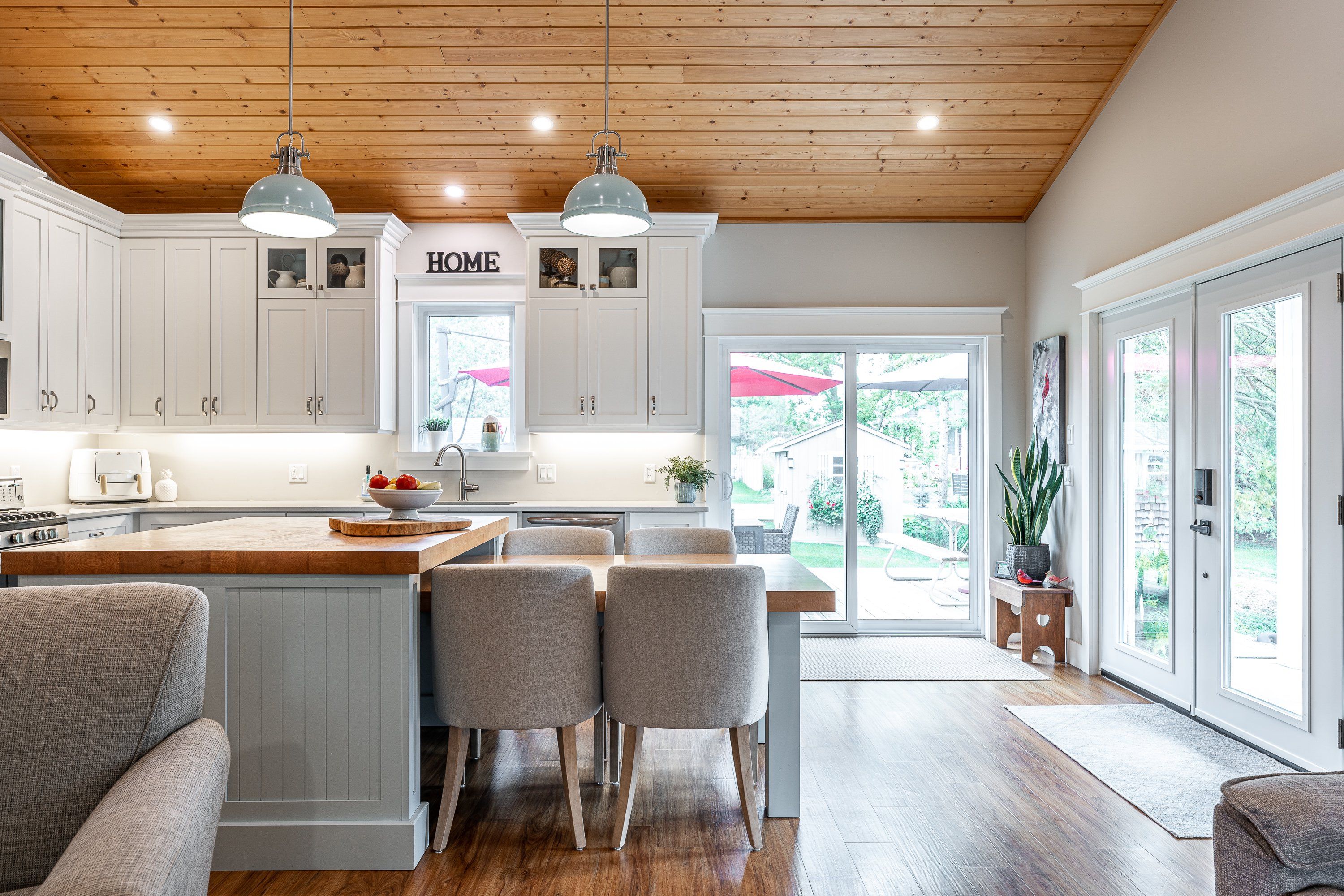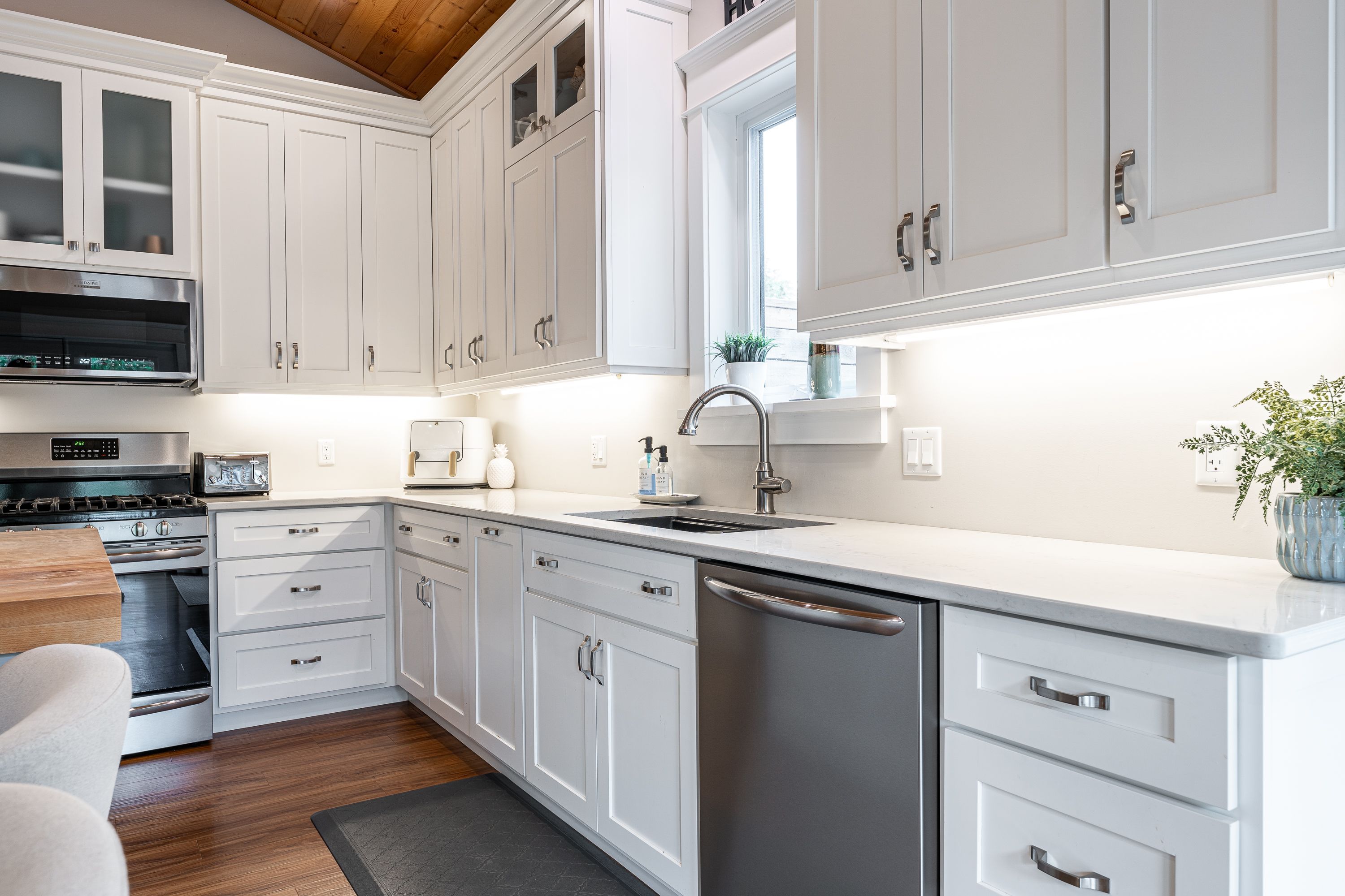 • Open concept living area with cathedral ceilings and a spacious quartz kitchen.