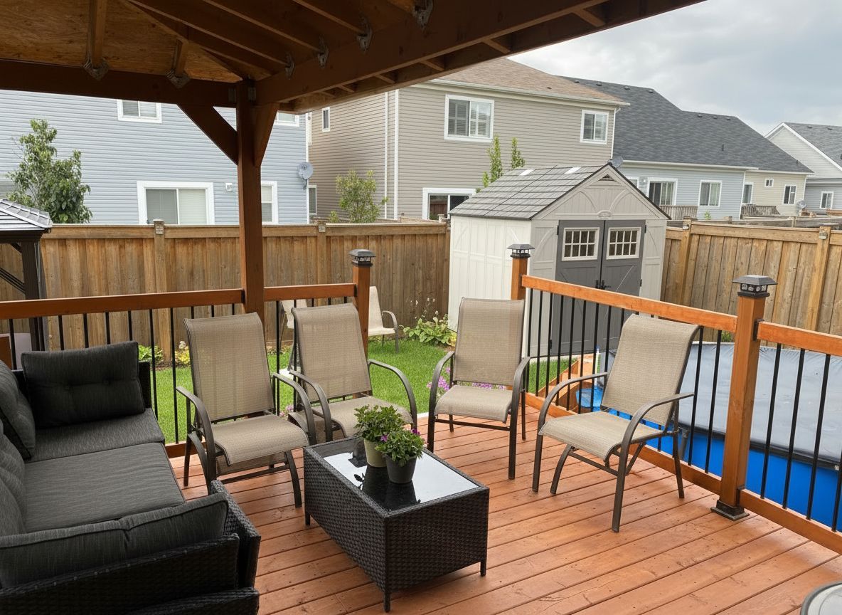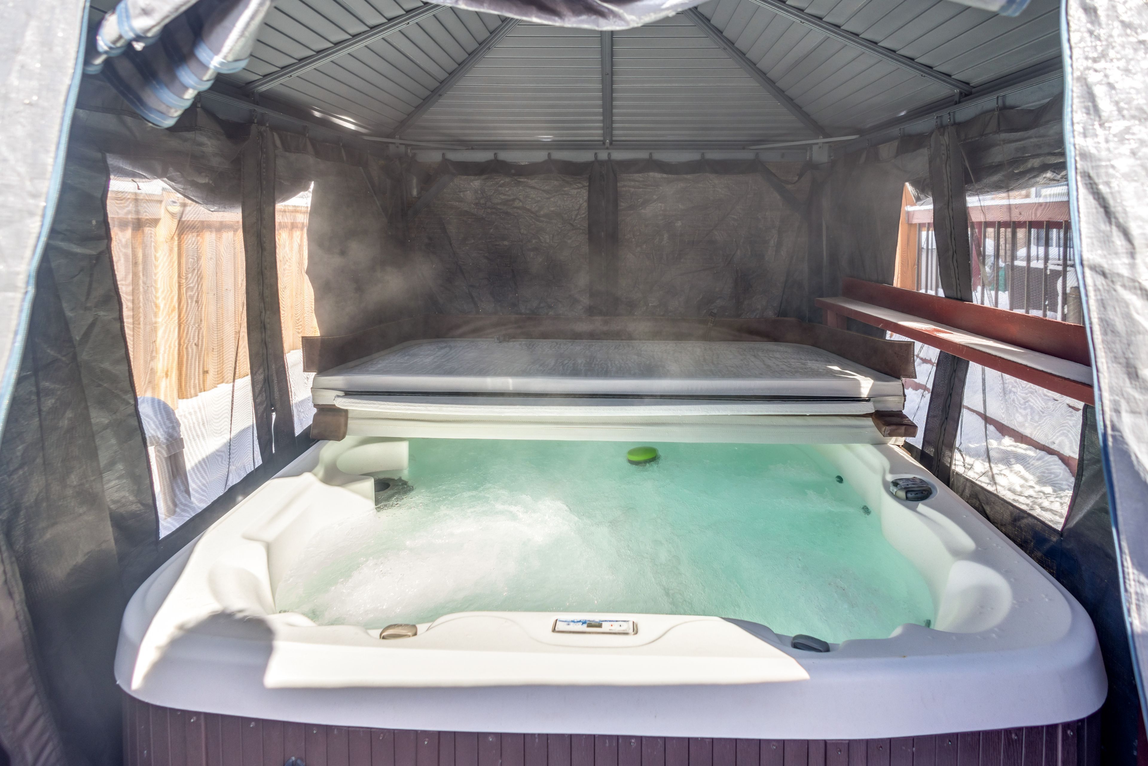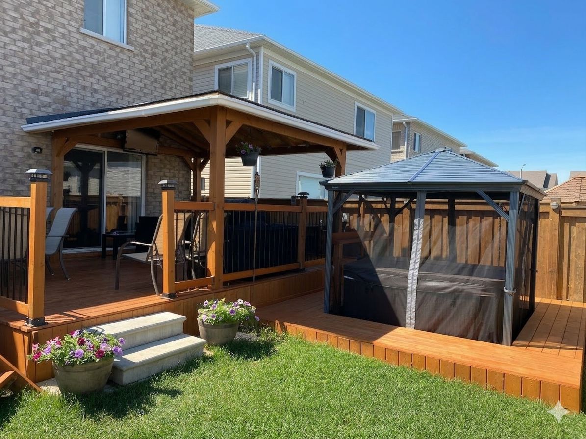 • Private backyard with a large deck, above-ground pool, and hot tub.