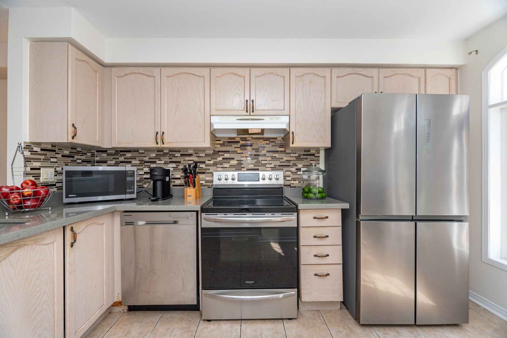 • Spacious kitchen with new quartz countertops and stainless steel appliances.