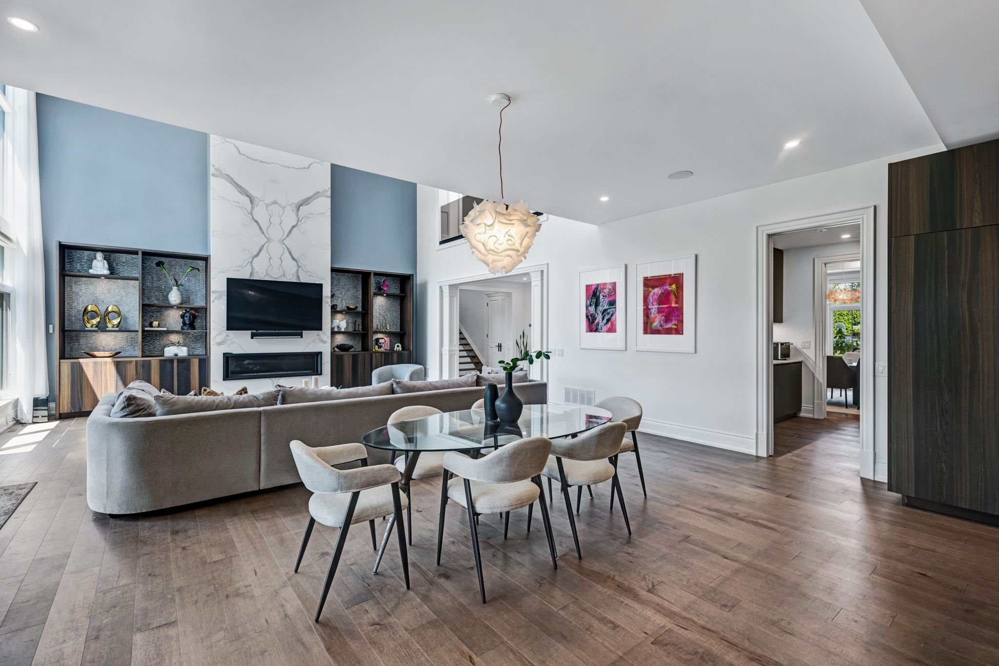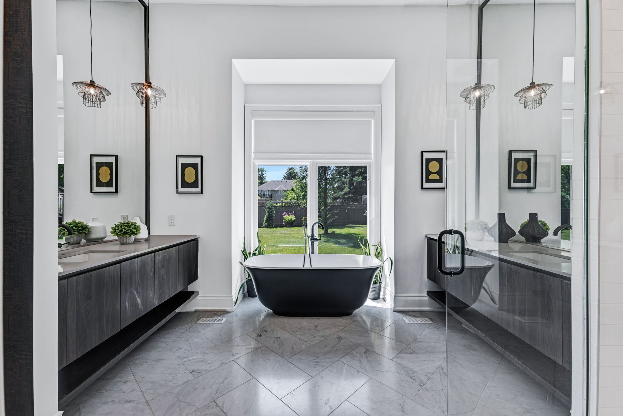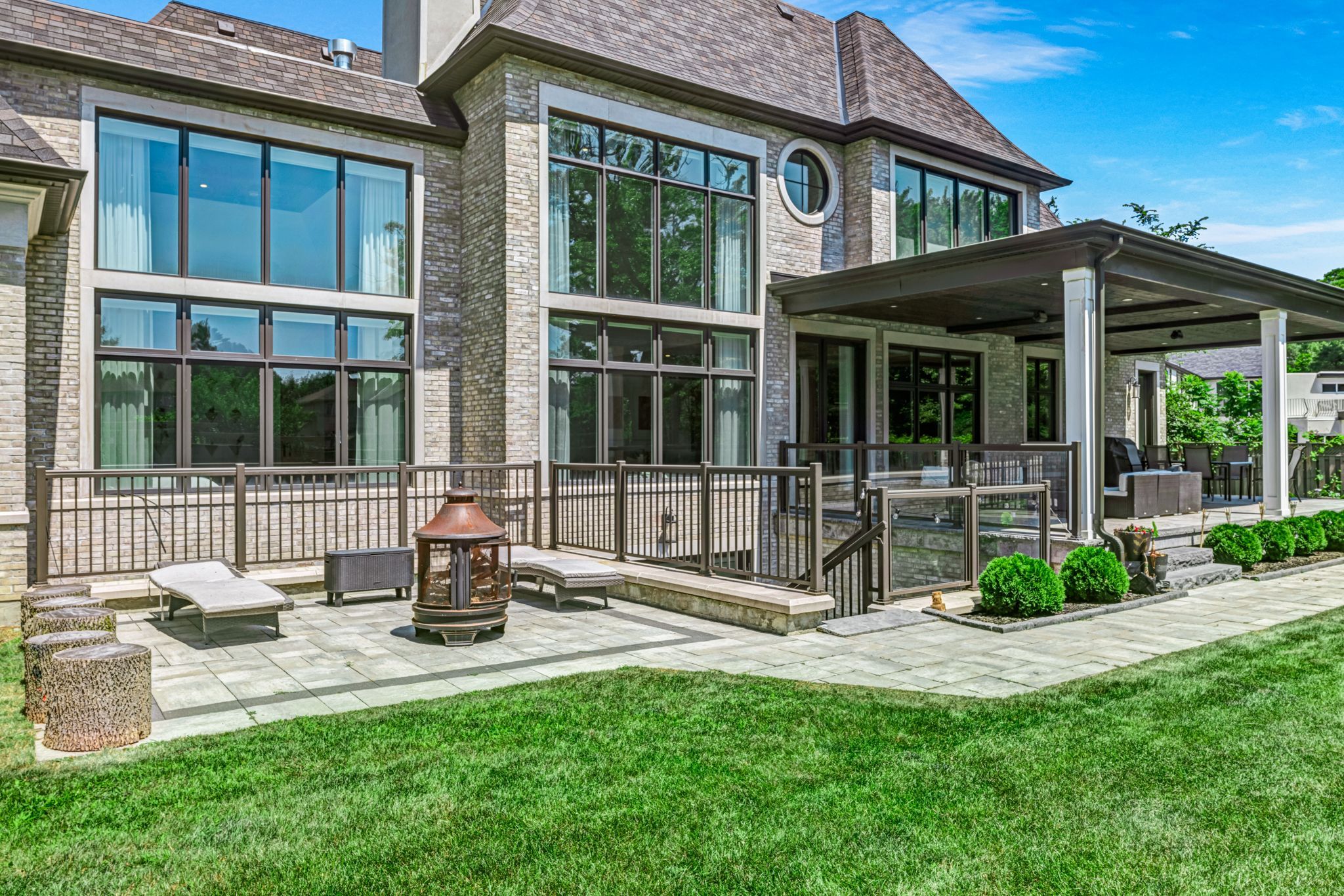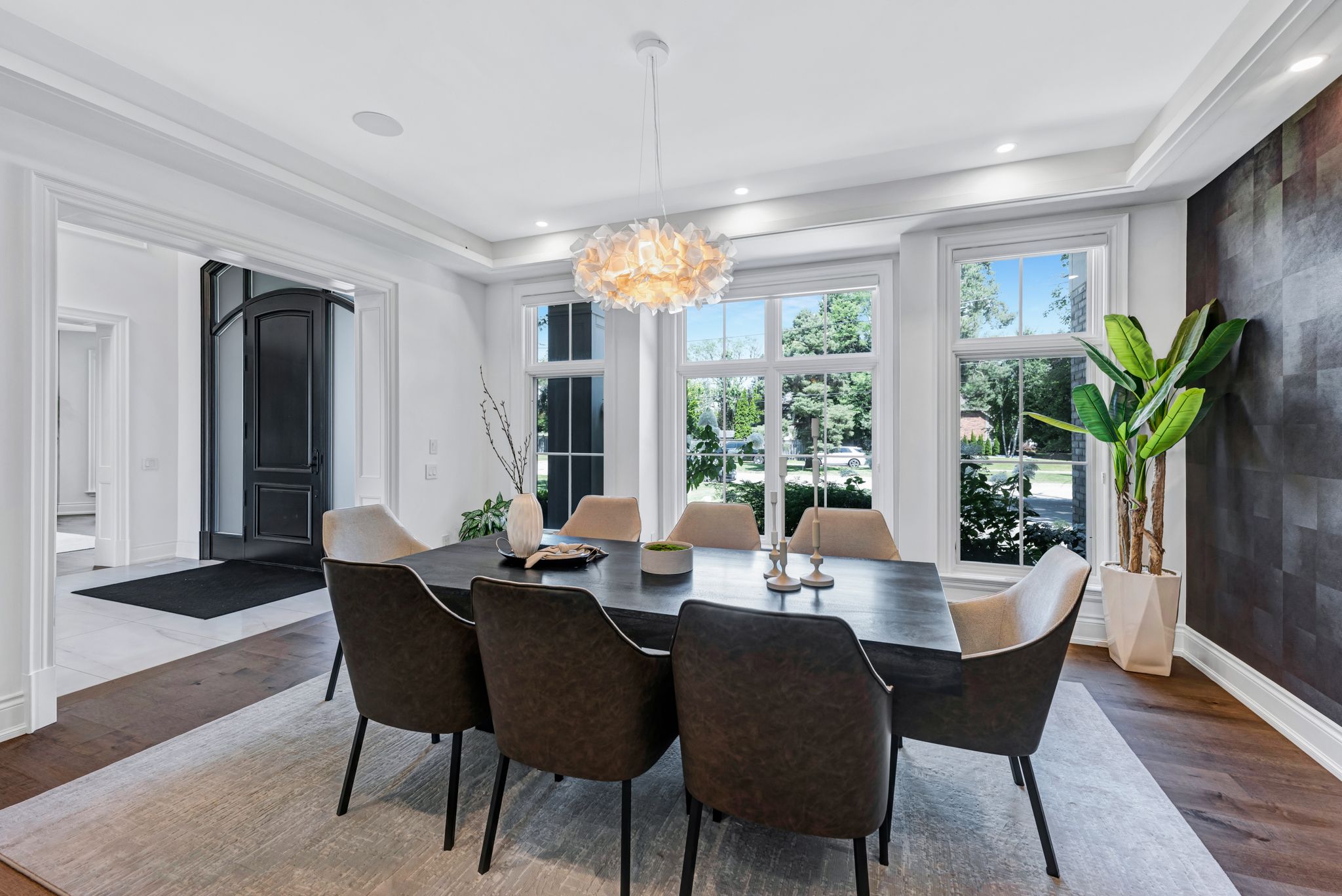 Set on a rare 172 ft wide pie-shaped lot, this magnificent custom-built french transitional château estate offers an extraordinary sense of space, privacy, and presence, expanding into a breathtaking backyard setting seldom found. A striking limestone facade, steep rooflines, and refined architectural detailing create a timeless, estate-like impression, surrounded by mature trees and landscaped grounds that enhance both privacy and curb appeal. Inside, the home is defined by grand scale and thoughtful design, beginning with a dramatic two-storey foyer and continuing into a breathtaking great room with soaring 24 ft ceilings and expansive windows that flood the space with natural light. At the heart of the home, the designer muti kitchen is crafted for both performance and style, featuring sleek european-inspired cabinetry, quartz surfaces, and a full-height backsplash. An oversized waterfall island anchors the space with generous seating and prep area, complemented by integrated panelled appliances, a dedicated coffee and bar station, and a walk-in pantry, all seamlessly connected to the surrounding living and dining areas for effortless entertaining. The upper level offers a luxurious primary retreat with vaulted ceilings, a custom walk-in closet, and a spa-inspired ensuite, alongside generously sized bedrooms, each complete with hardwood flooring, custom closets, and private ensuites. The lower level extends the home's lifestyle offering with a dedicated home theatre, custom bar and lounge, private bedroom, and a fully equipped fitness room, delivering a complete luxury living experience designed for comfort, flexibility, and elevated everyday living.