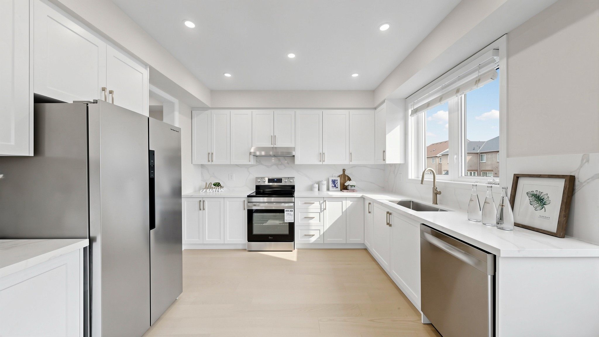 • Newly renovated kitchen features quartz countertops and stainless steel appliances.