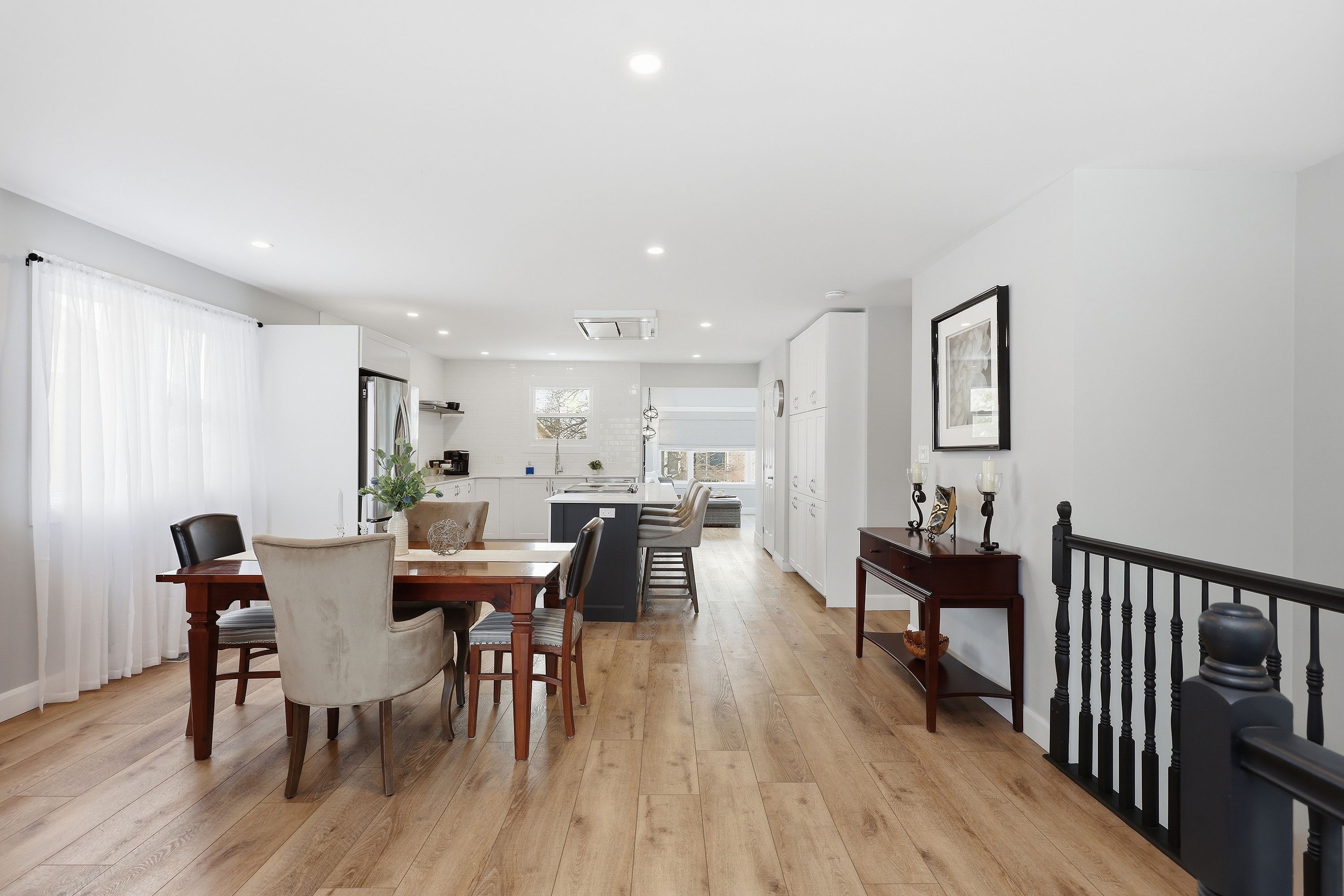 • Open layout connects living, dining, and custom kitchen for a bright space.