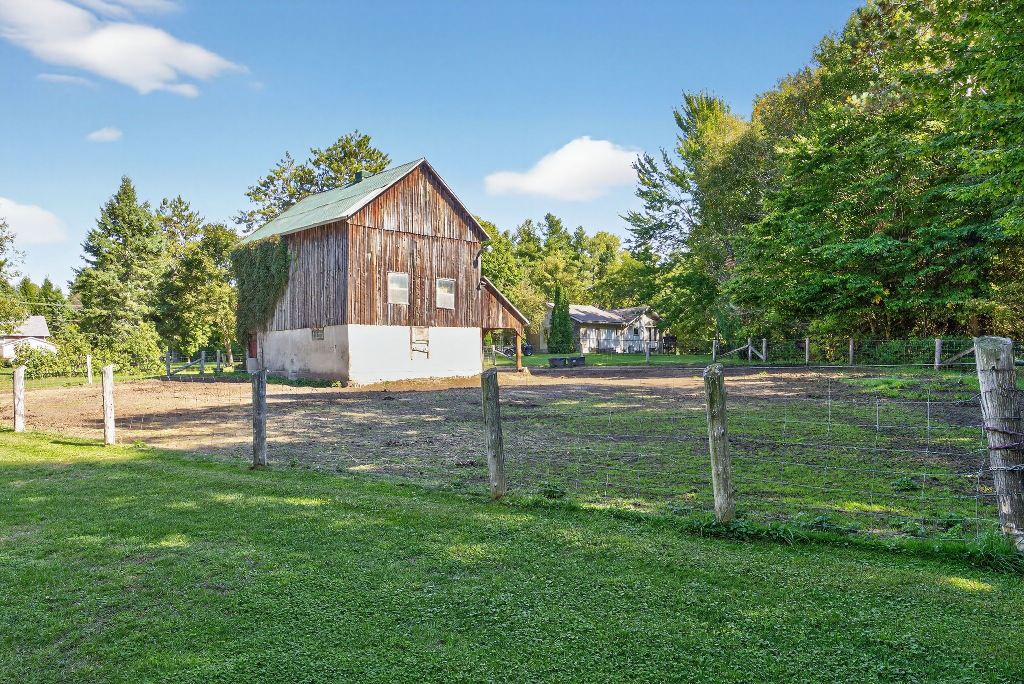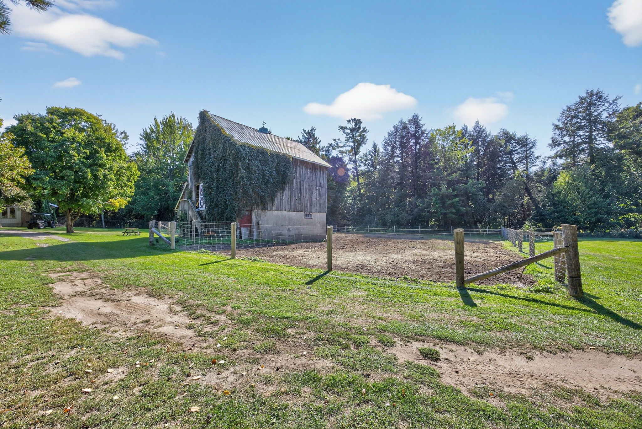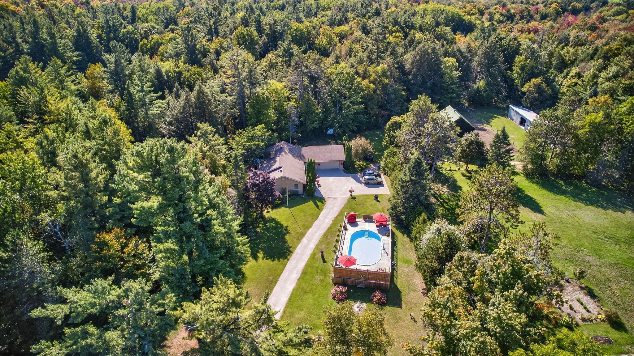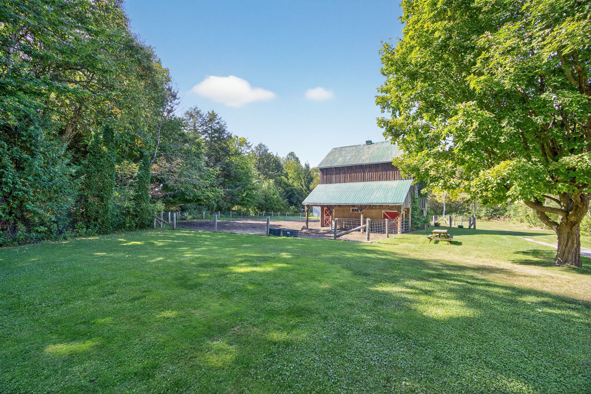Welcome to your private 48. 39-acre sanctuary - a rare opportunity to escape the city and embrace a simpler, more fulfilling way of life. As you wind down the secluded driveway, three majestic old-growth white pines, known as the three sisters, stand as timeless guardians of this serene retreat. The custom-built bungalow offers generous living space with cathedral ceilings, a double-sided gas fireplace, and triple-pane windows framing stunning views of the pond, creek, and landscaped grounds. The main level features a spacious kitchen with walkout to the deck, a primary bedroom with ensuite, main-floor laundry, and inviting family spaces designed for comfort and connection. The finished lower level adds incredible versatility with a large recreation room and wood-burning fireplace, two additional bedrooms, an updated bathroom, and two flexible grooming rooms that can easily be tailored to your needs - ideal for hobbies, multi-generational living, or a home business. A walkout to the backyard and garage completes the space. Outdoors, the possibilities are endless. A century barn with hay loft, two paddocks with direct trail access, a sugar shack, chicken coop, and fenced area for pets create the perfect setting for hobby farming or equestrian pursuits. An expansive four-bay drive-in shed with oversized doors provides ample storage for boats, tractors, or collector cars. Trails wind through a beautiful blend of old-growth forest and open meadows, perfect for riding, hiking, or exploring nature. In summer, enjoy the 18x33 above-ground pool with full deck and tiki bar for effortless entertaining; in winter, cozy up by the fire and watch snow fall across your private oasis. With numerous updates and the option of a forest management plan for potential tax savings, this remarkable property is both practical and inspiring - a true retreat ready for its next chapter.