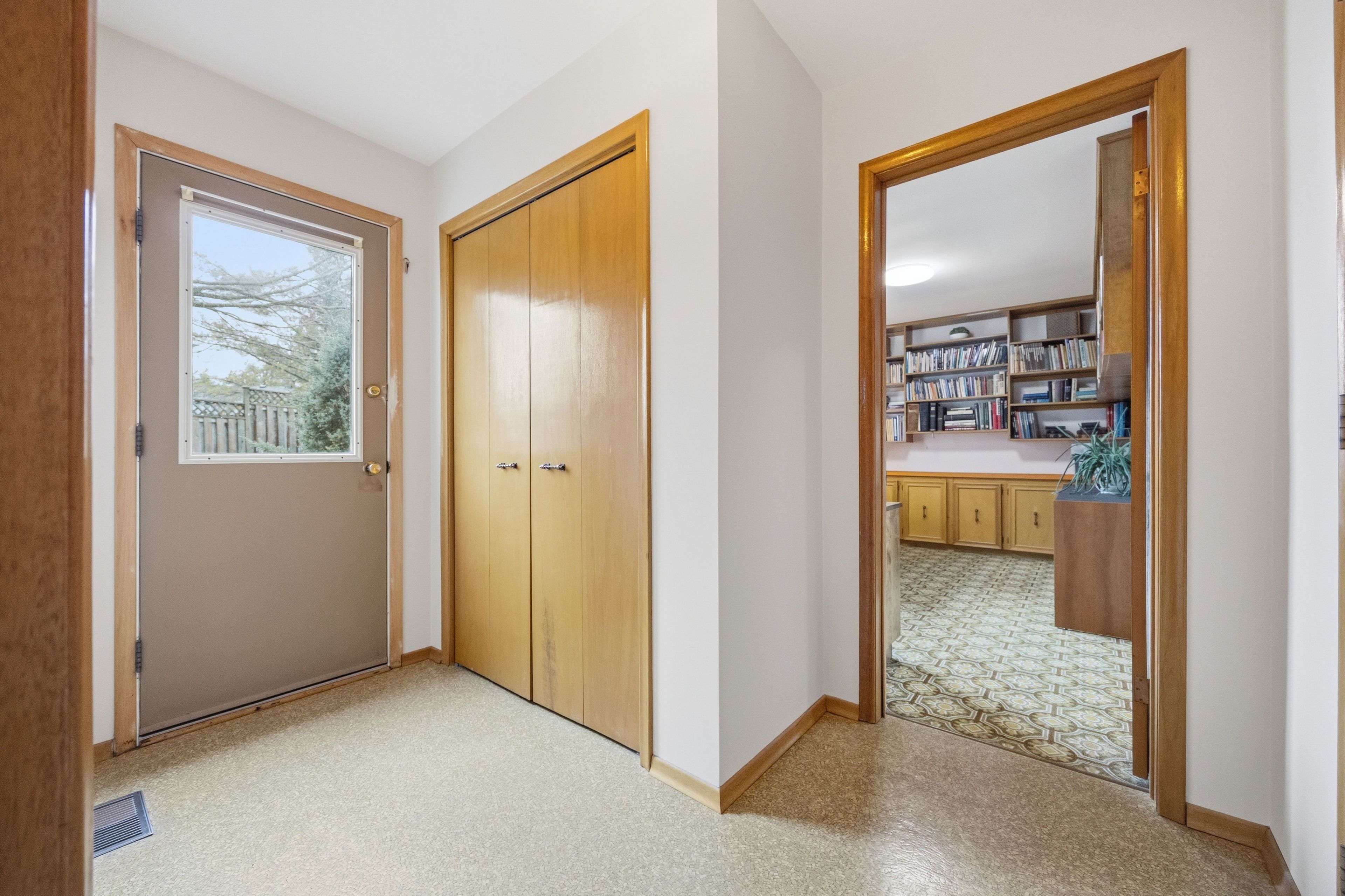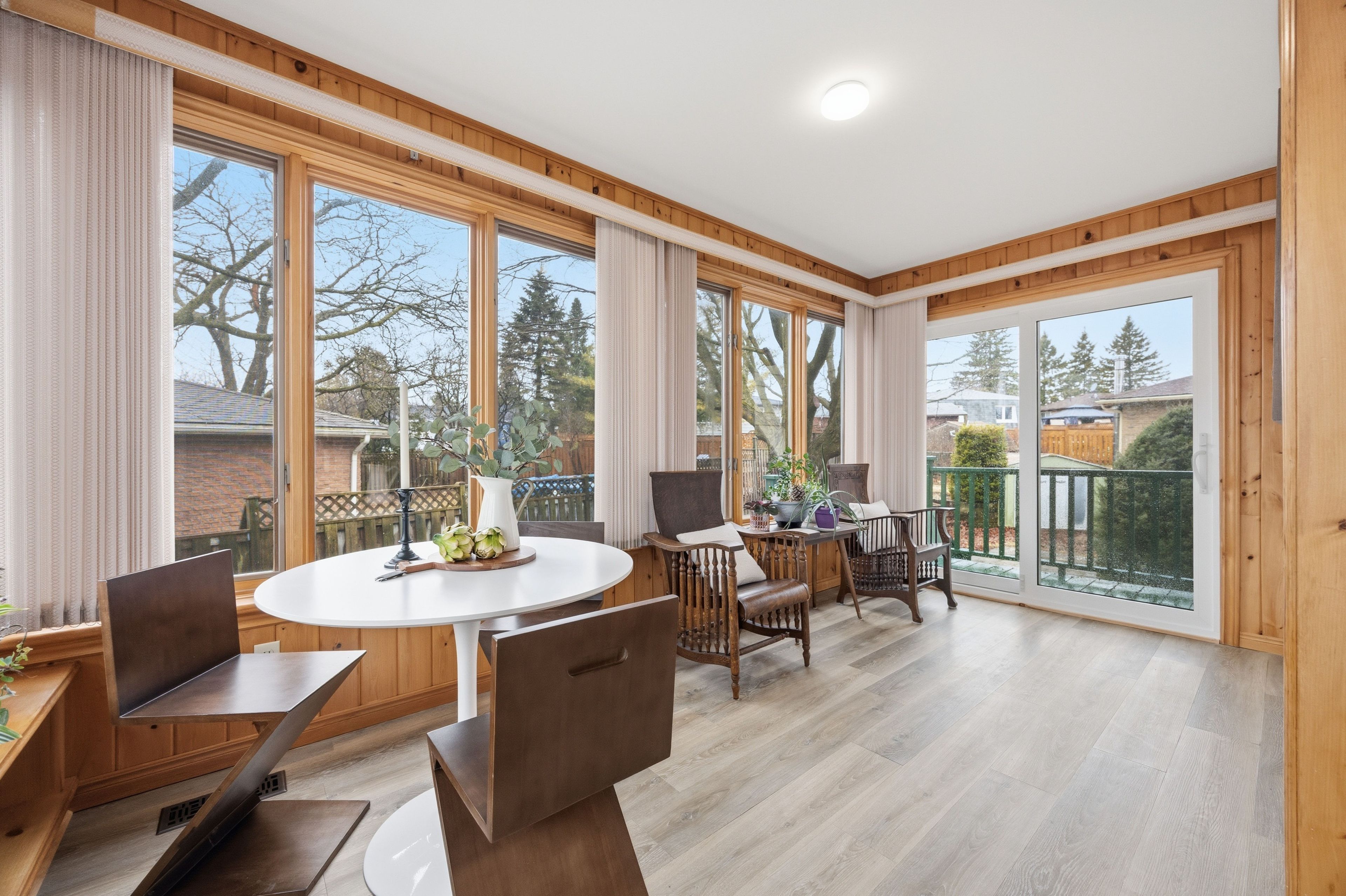 • Sunny enclosed sunroom leading to a private backyard with a patio.