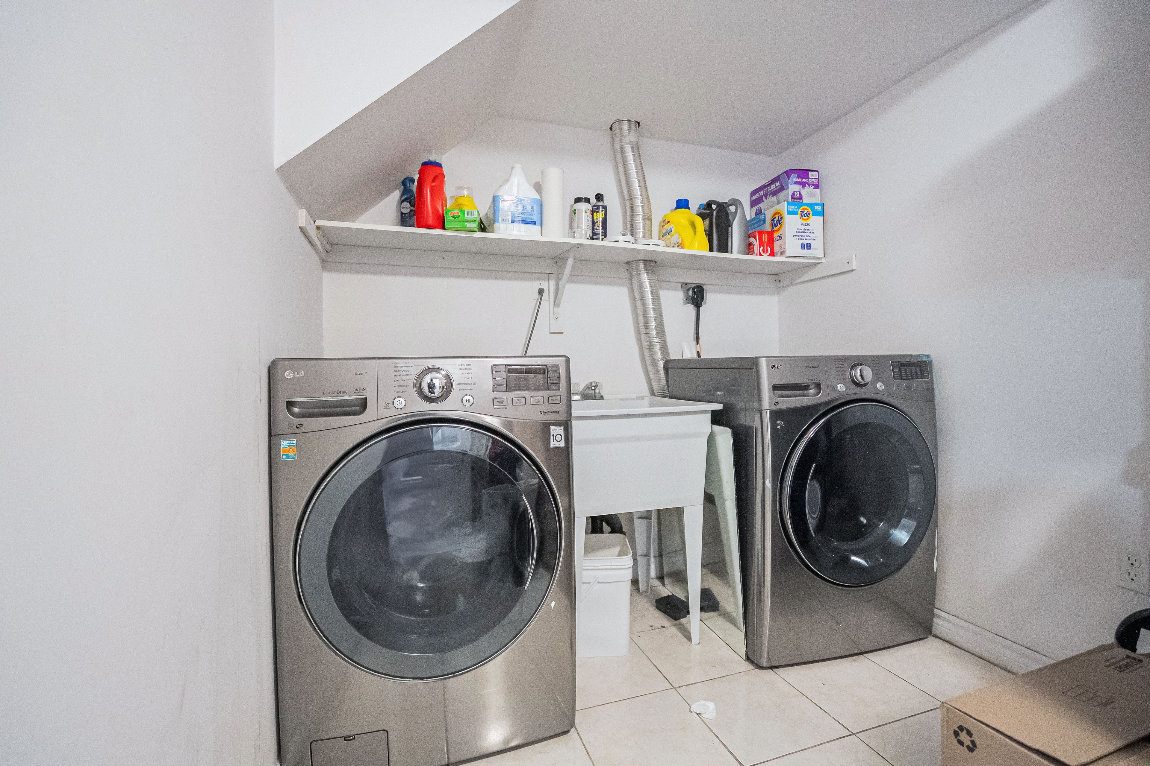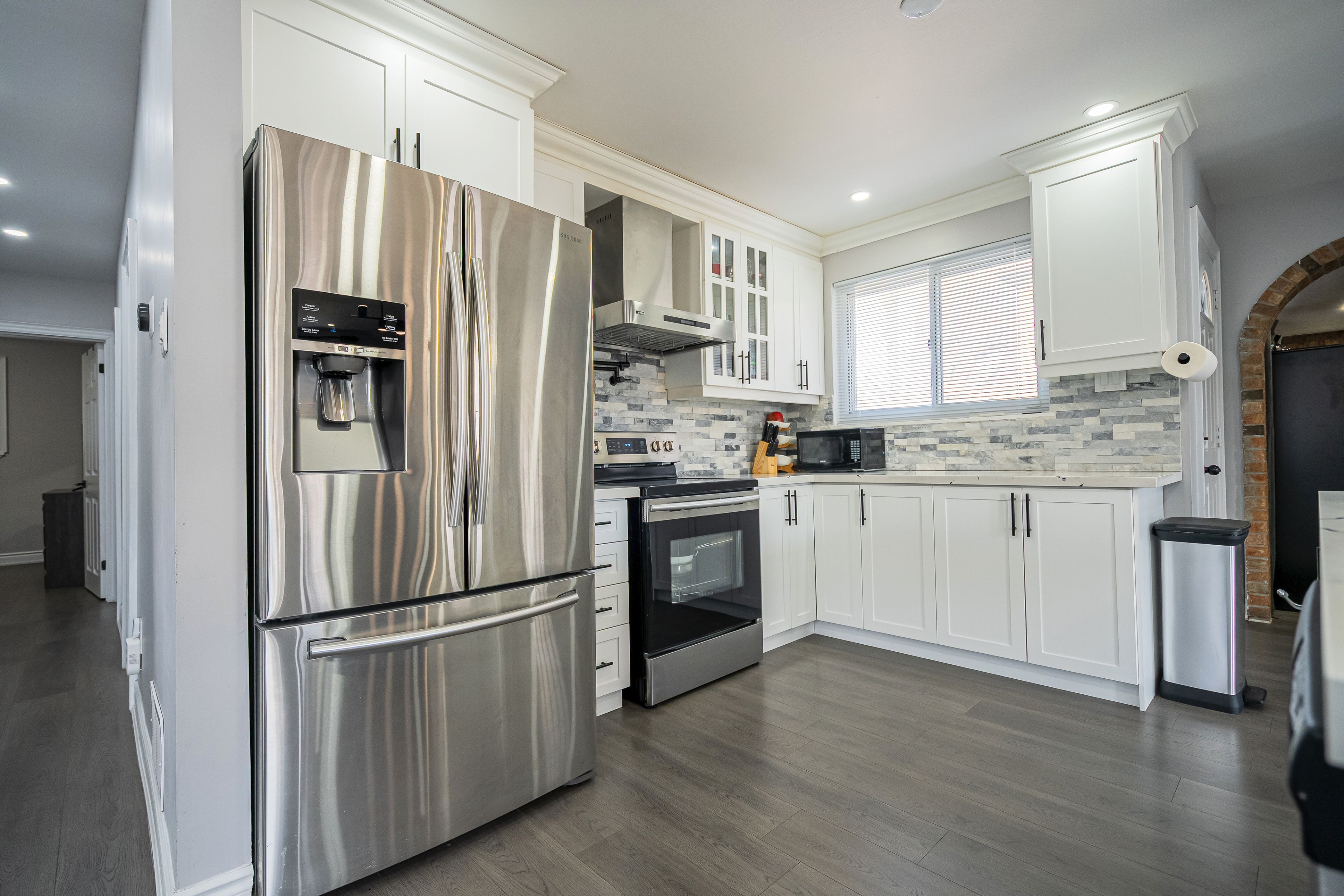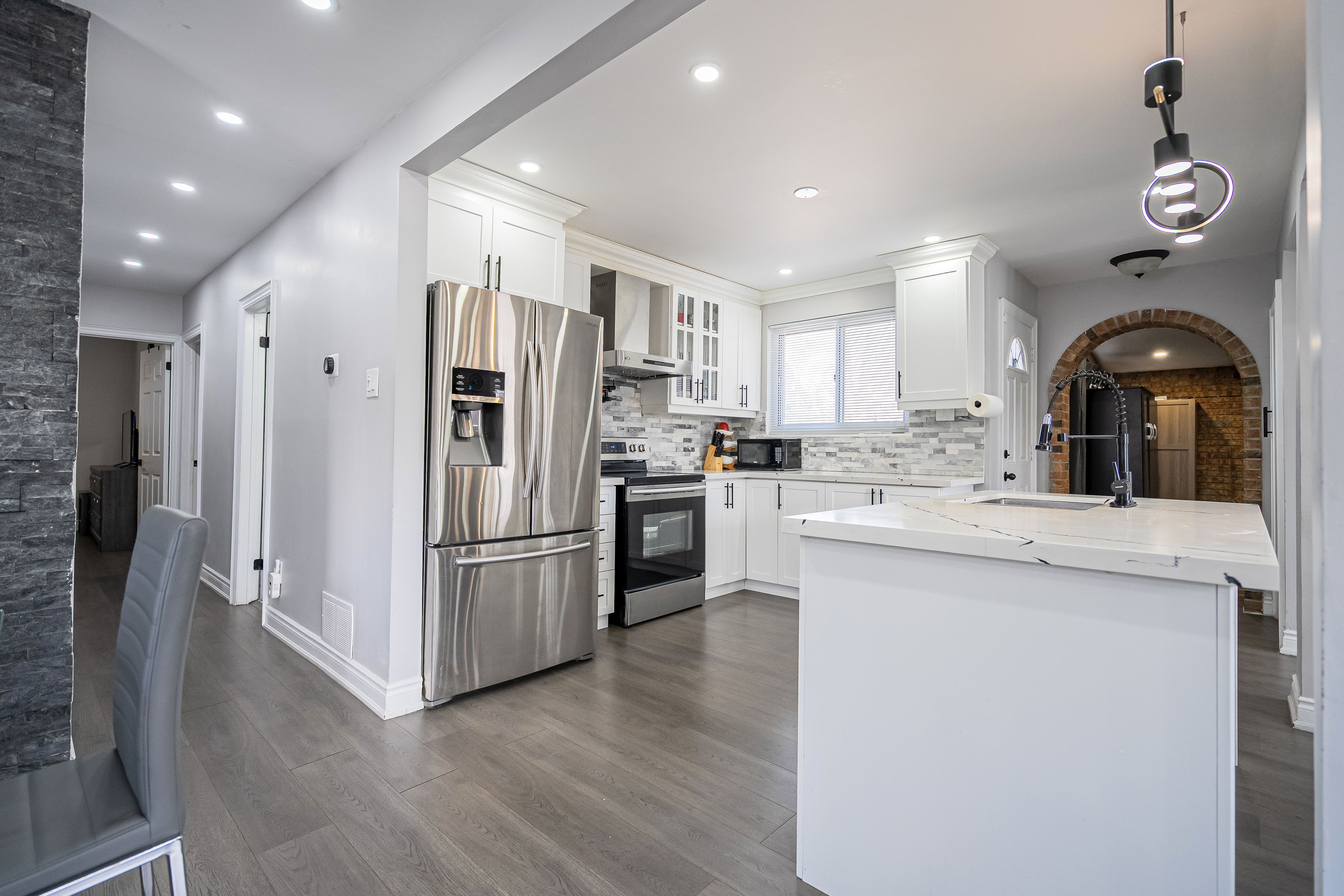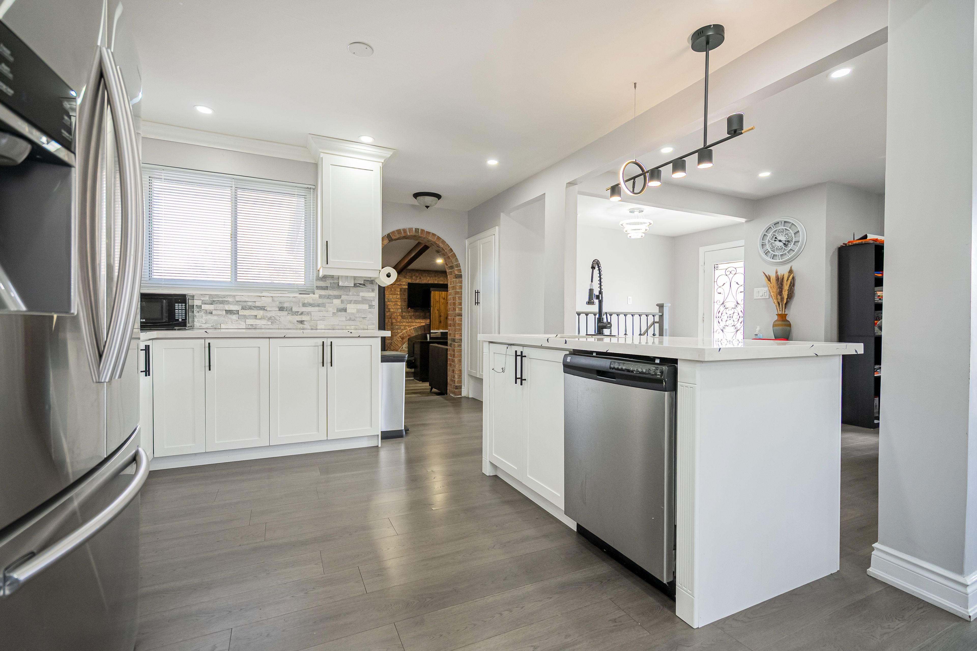 • Open concept kitchen with quartz countertops and stainless appliances.