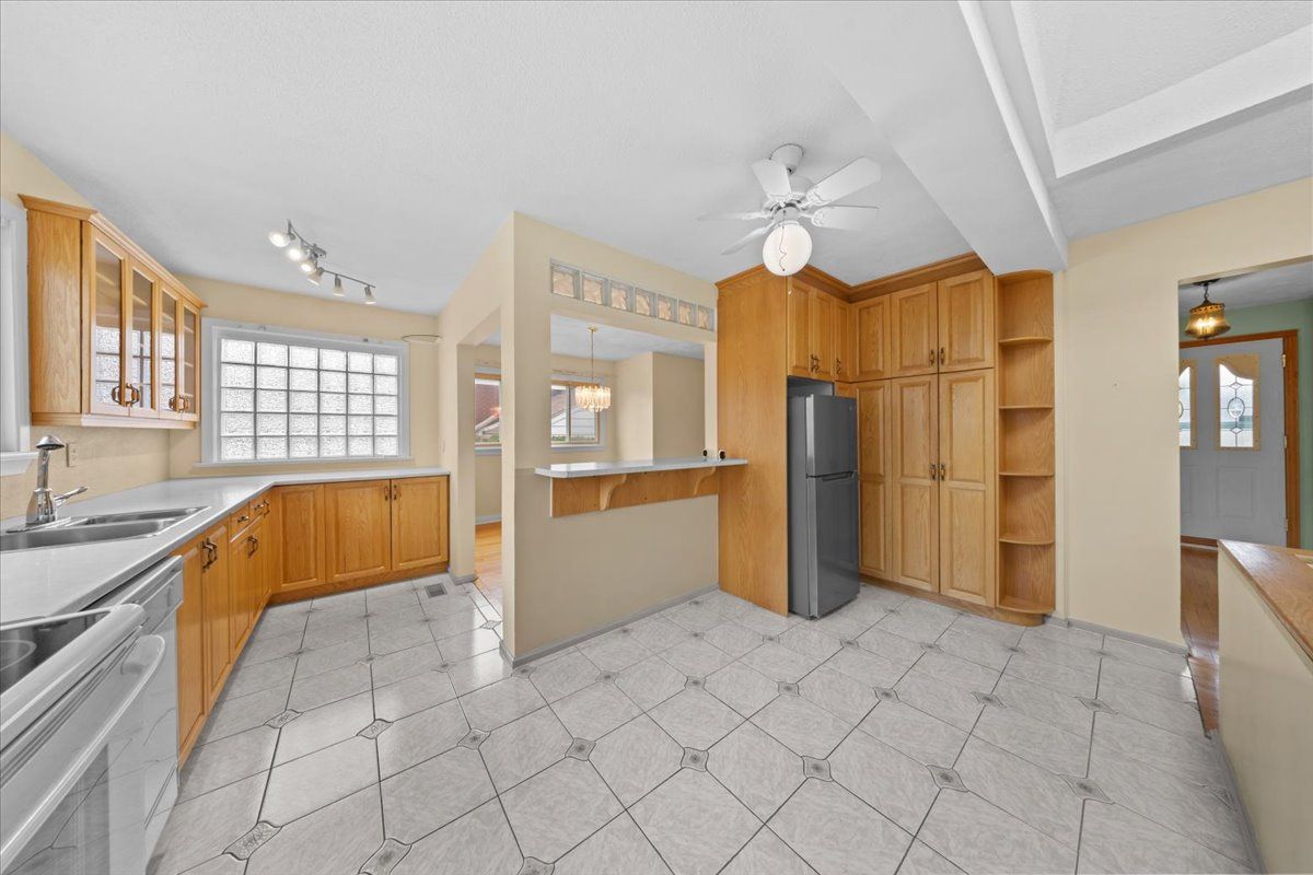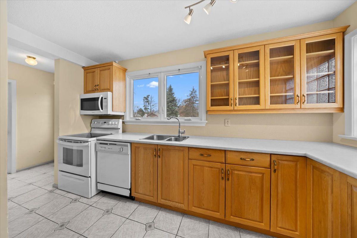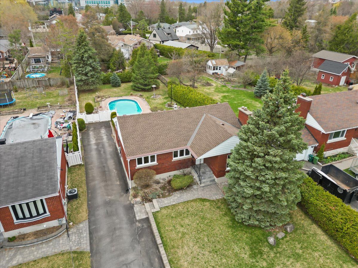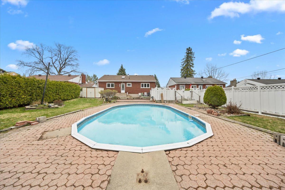 Positioned deep within a quiet street in cardinal heights, this all-brick bungalow is defined by its elongated footprint, long tandem driveway, & a landscaped approach featuring an interlock walkway & wrought iron railings. The front elevation is articulated w/glazed entry elements, introducing a consistent emphasis on natural light. The interior is unified by site-finished hardwood flooring extending throughout the main level. A central living room is anchored by a gas fireplace & framed by a broad window wall, enhanced by integrated pot lighting & detailed lower mouldings. The adjacent dining area is proportioned for formal use, w/a defined opening & chandelier placement. The kitchen is configured for efficiency & storage, incorporating a three-quarter sink positioned beneath a window w/southern exposure. Architectural detailing includes glass block accents, upper & lower mouldings, & feature cabinetry w/integrated glazing. A breakfast bar & full-height pantry wall complete the space, w/ceramic tile underfoot. The bedroom wing is discreetly separated, offering three bedrooms & a four-piece main bathroom w/an extended vanity & jacuzzi tub. The primary bedroom is oriented to the rear, w/a full-width closet & direct access to the private yard. A secondary rear entry introduces vertical circulation to the lower level, highlighted by a skylight above the stairwell. The basement is designed as a multifunctional extension, featuring a large recreation room w/multiple window openings, a dedicated laundry area w/utility sink, a three-piece bathroom, & extensive storage including a cold room/wine cellar. The rear yard is deep & fully fenced, w/a western exposure that maximizes afternoon & evening light. Outdoor elements include an in-ground pool, interlock patio, & ancillary storage structure, establishing a cohesive exterior living environment. 24 hour irrevocable on all offers.