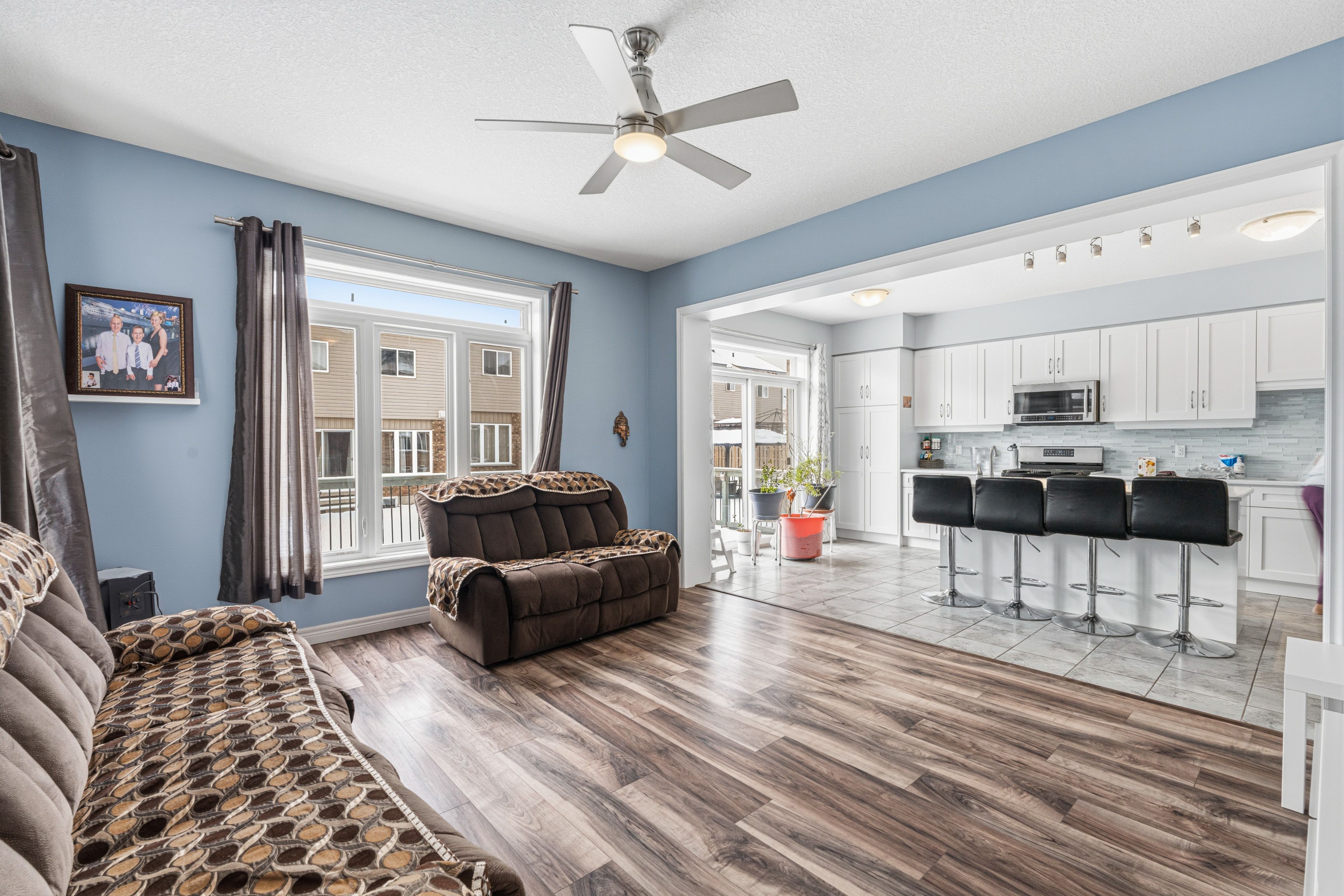 This exquisite two-story family residence, located at 72 grand flats trail in lackner woods at explorers, features four plus two bedrooms. The property immediately impresses with its distinguished stone pillars and inviting covered porch. Upon entering, the bright foyer and nine-foot ceilings establish an open and expansive atmosphere throughout the carpet-free main floor. This level includes a formal dining room, bathed in natural light, and a conveniently located laundry room. The kitchen is a highlight, boasting quartz countertops, stainless steel appliances, ample storage, a custom backsplash, white cabinetry with additional pantry space, and a generous quartz island with a breakfast bar. The upper level is enhanced by california shutters and a versatile landing area, ideal for a sitting room or home office. This floor comprises four spacious bedrooms, including a primary suite with a walk-in closet and a five-piece ensuite bathroom. Two additional bedrooms also benefit from walk-in closets. The fully finished basement expands the living space with two further bedrooms, a recreation room perfect for entertaining, and a fourth bathroom appointed with granite countertops. Strategically situated, this home offers exceptional accessibility to the grand river, walking trails, waterloo airport, parks, and schools. Furthermore, it is merely a seven-minute drive to highway 401, making this property a truly comprehensive offering.