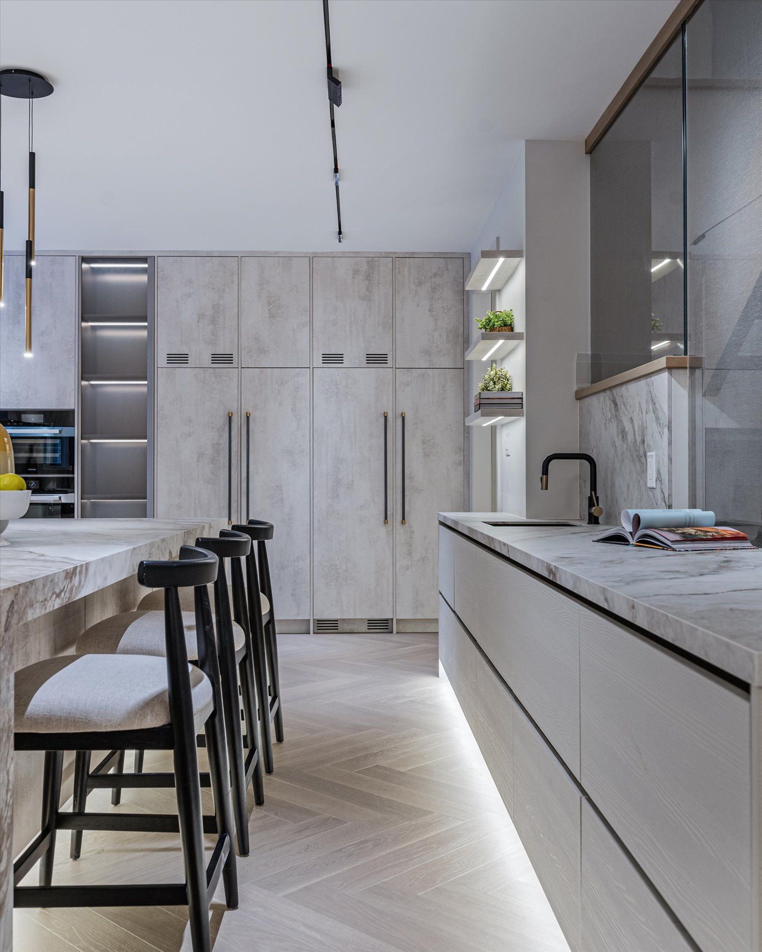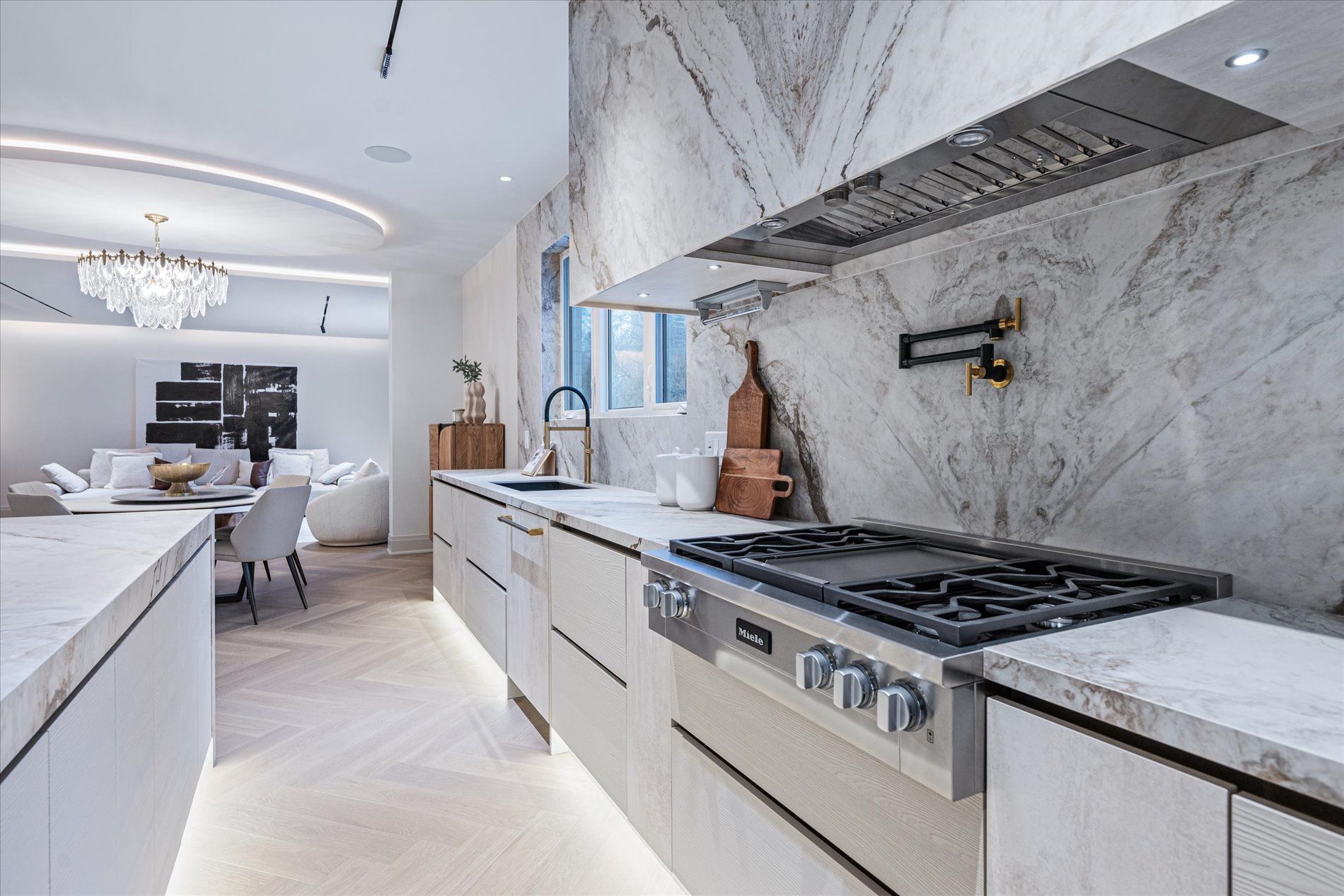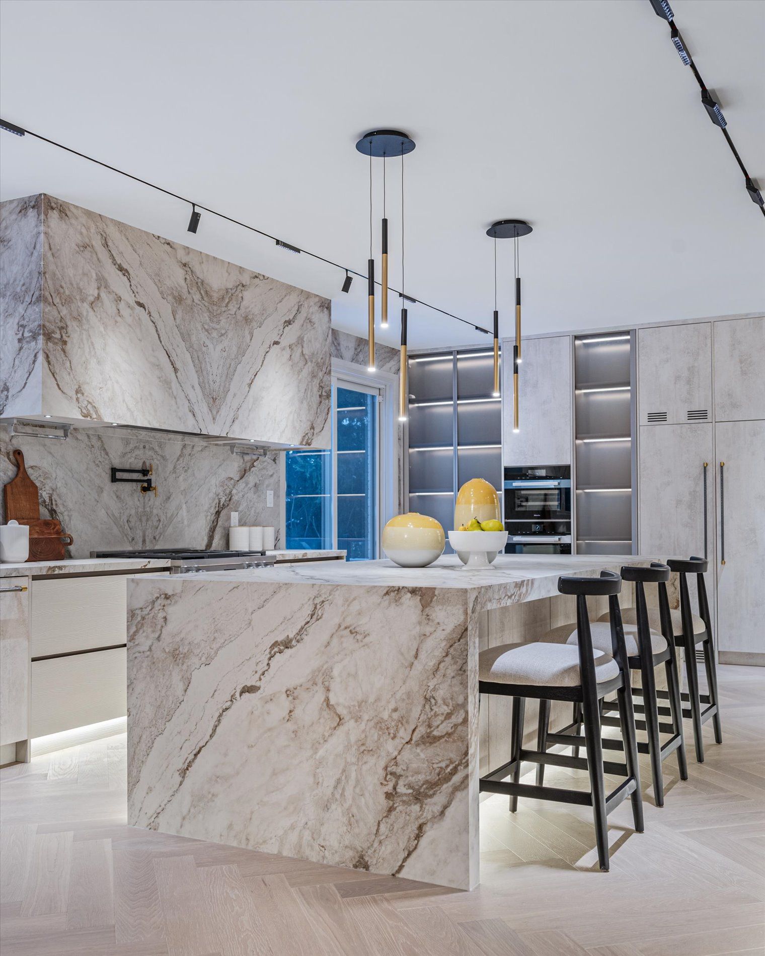 • Modern kitchen with elegant porcelain slab countertops and stainless steel appliances.