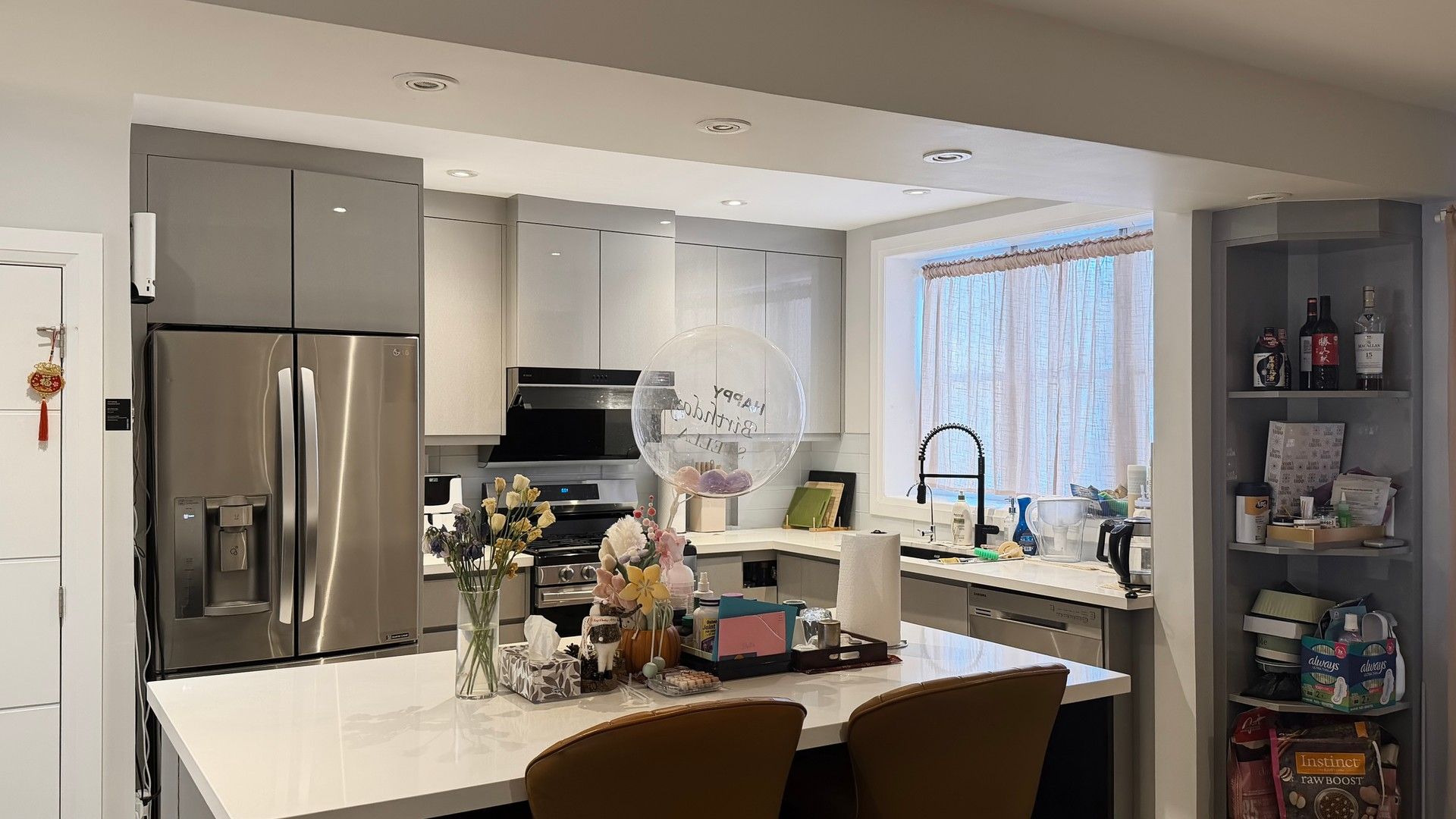 • Modern kitchen features large island, quartz countertops, and stainless steel appliances.