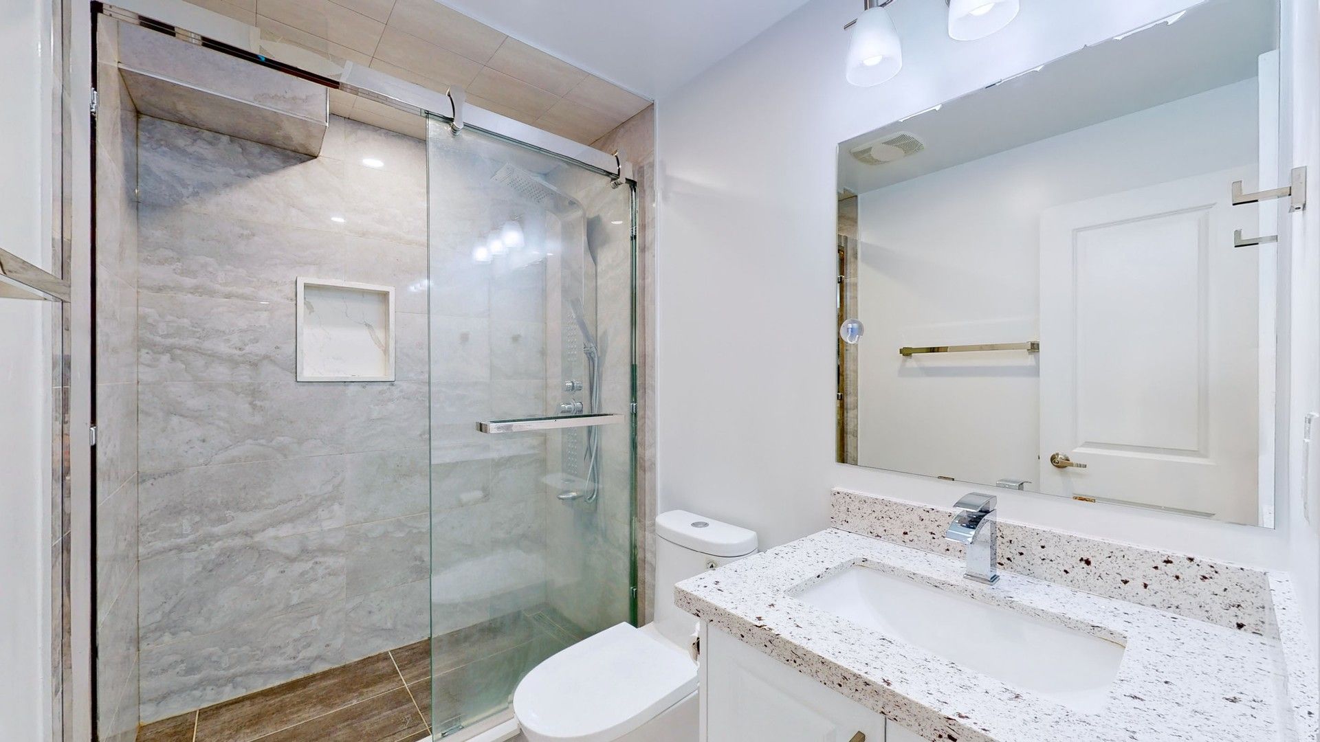 • Modern kitchen features granite or quartz countertops and stainless steel appliances.