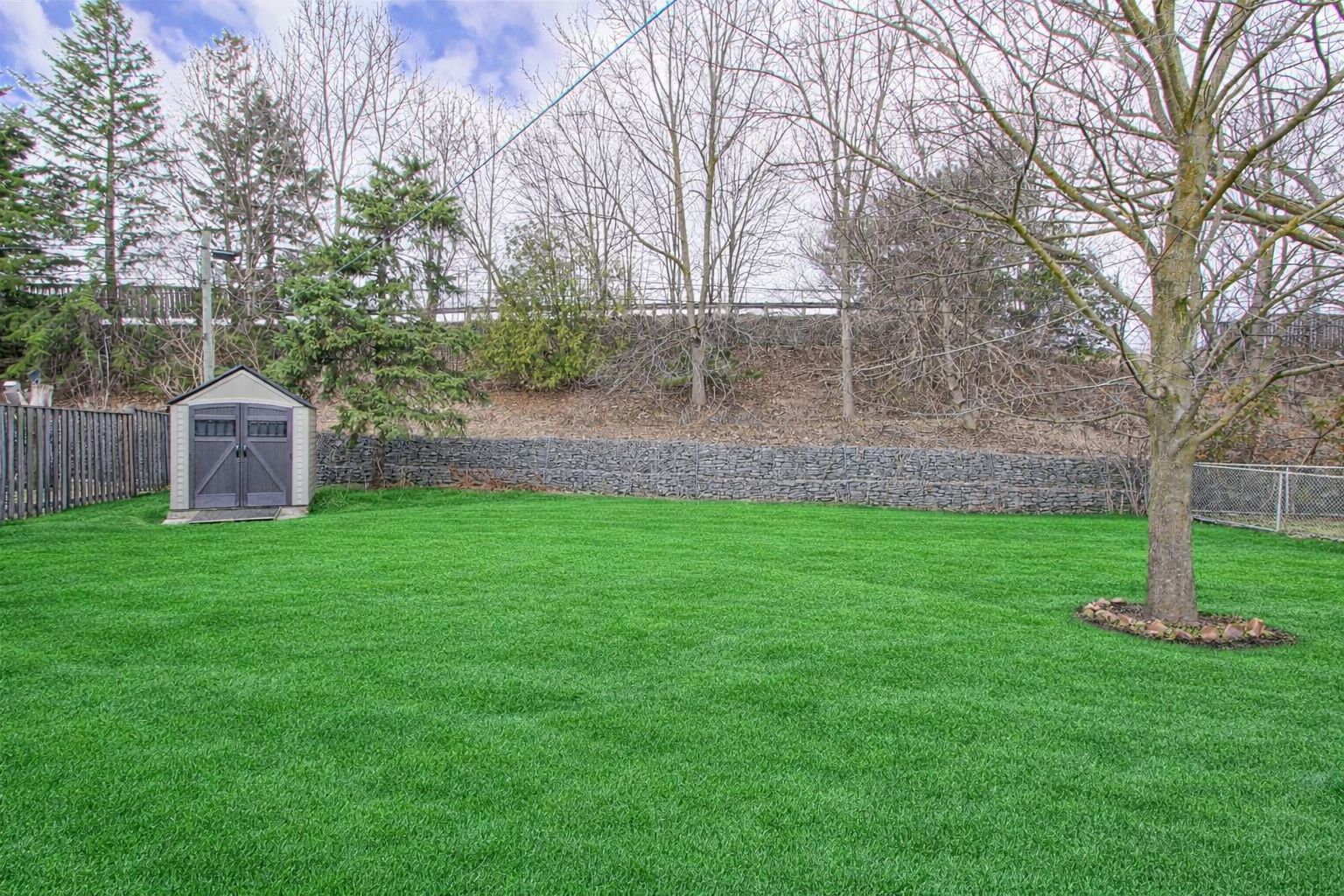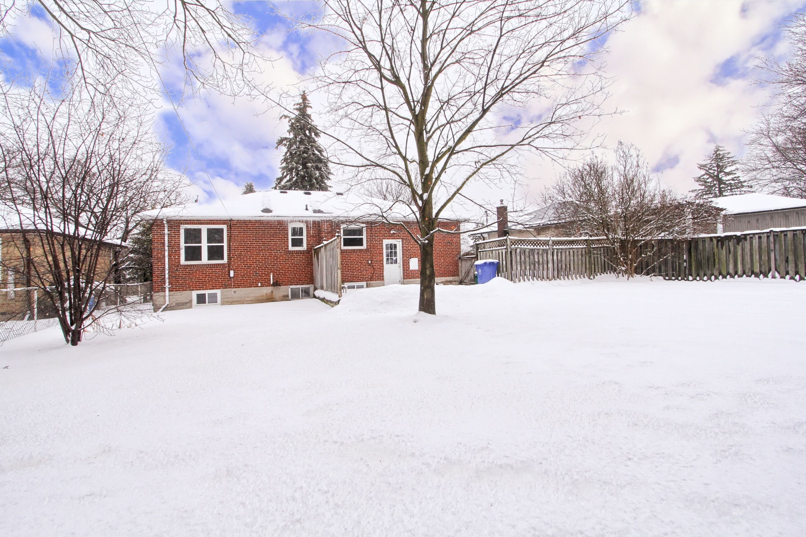 • Spacious backyard with mature trees and a large deck for privacy.