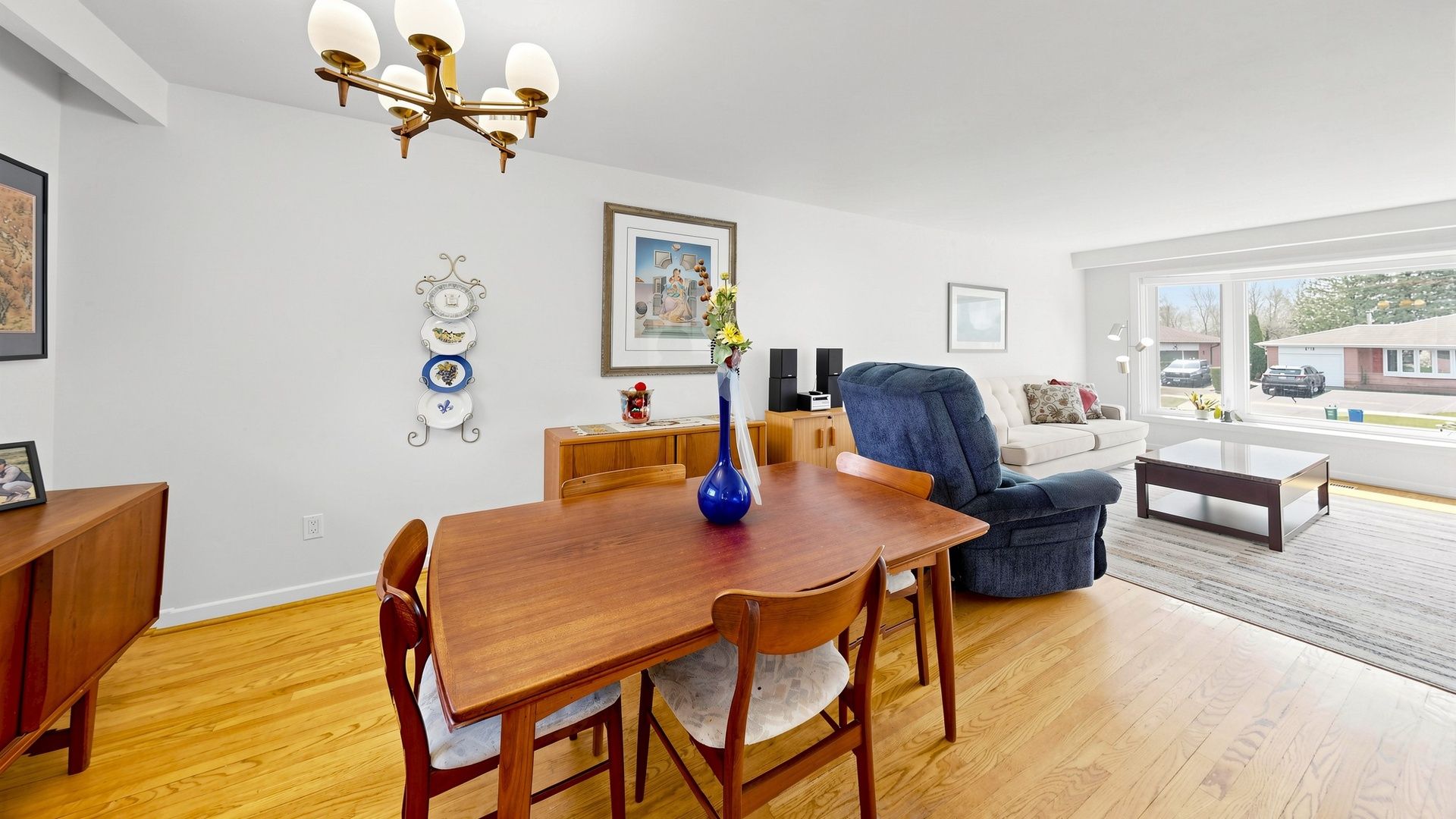 • Bright open-concept living and dining area with bay windows.