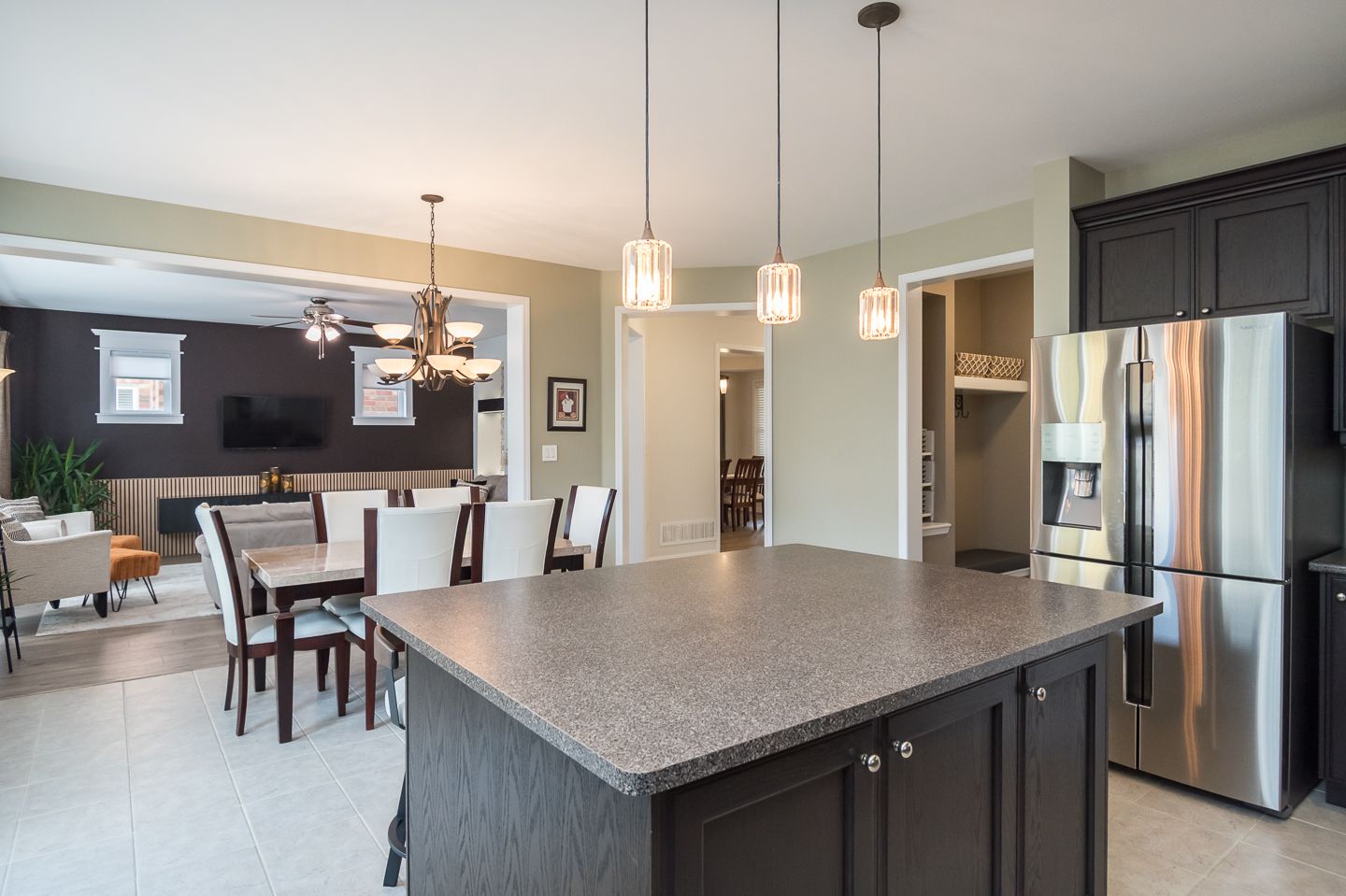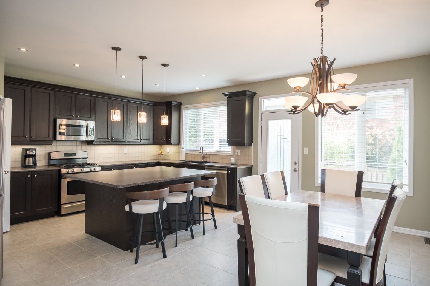 • Bright eat-in kitchen with large island and stainless steel appliances.