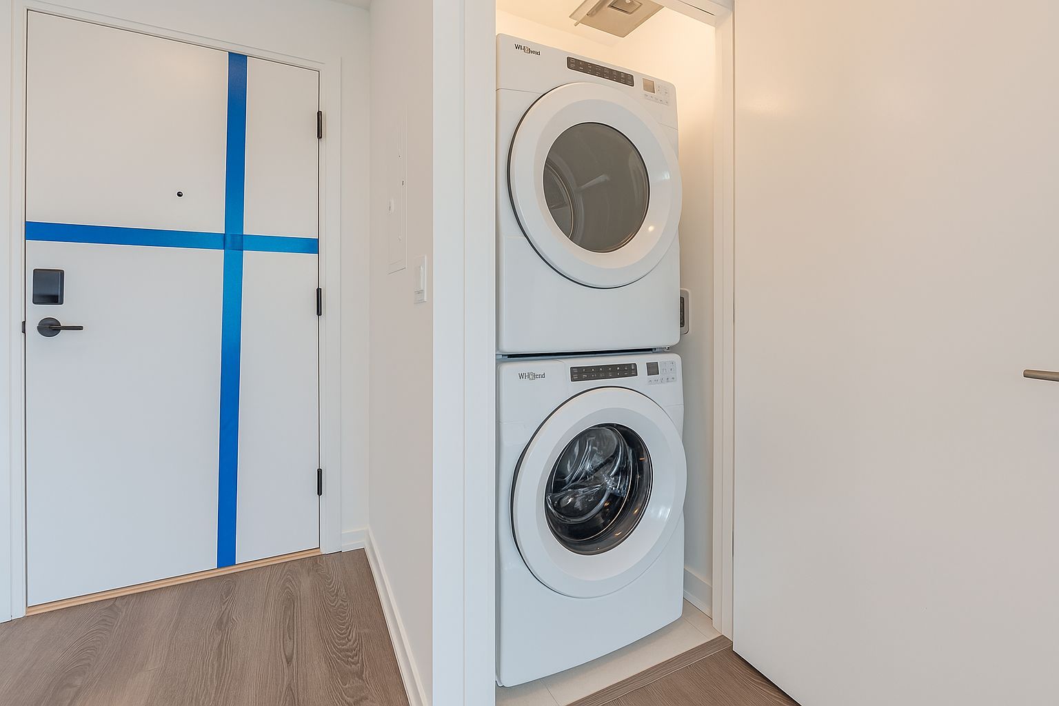 • Convenient in-suite laundry, smart thermostat, and included parking.