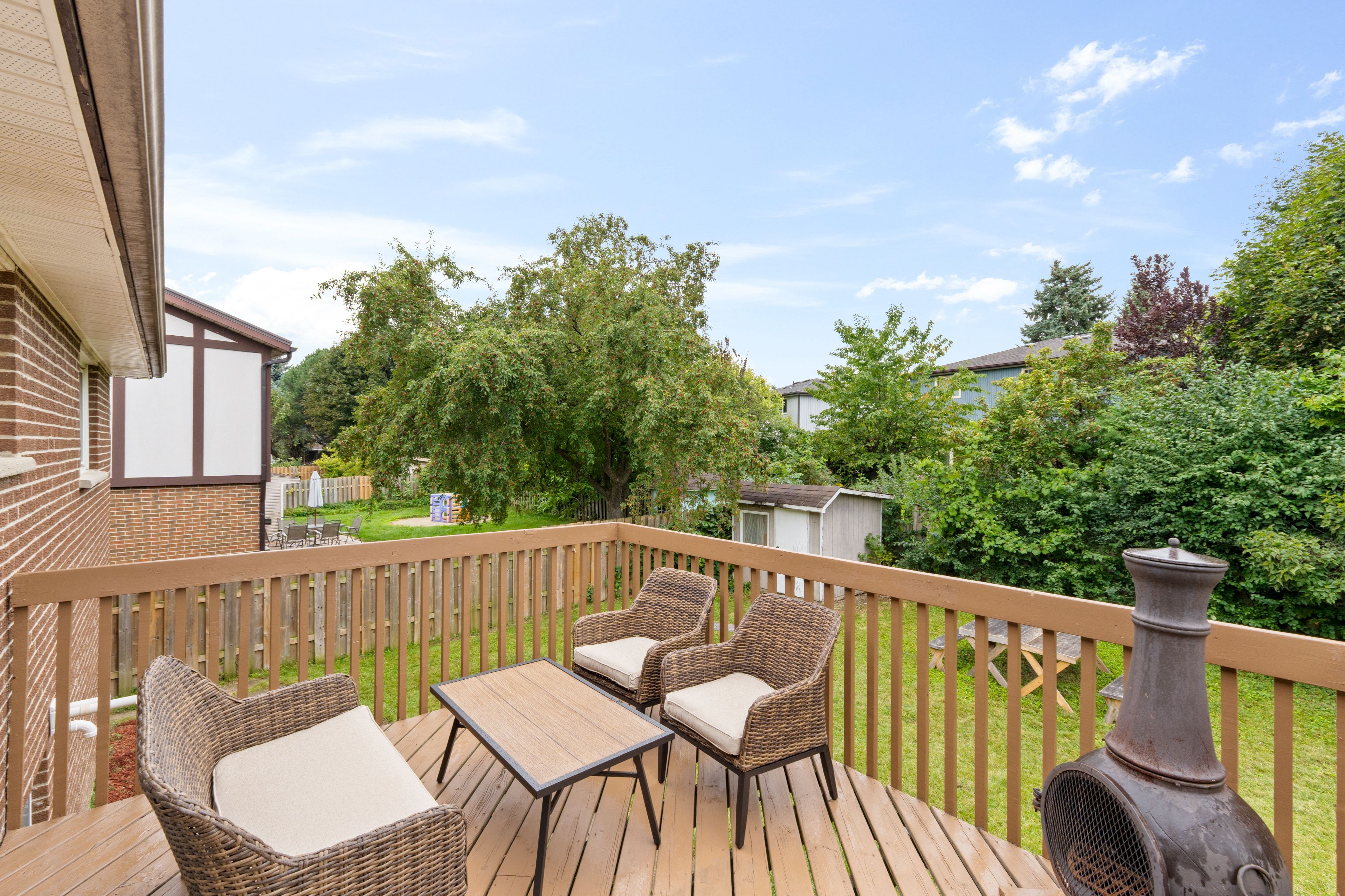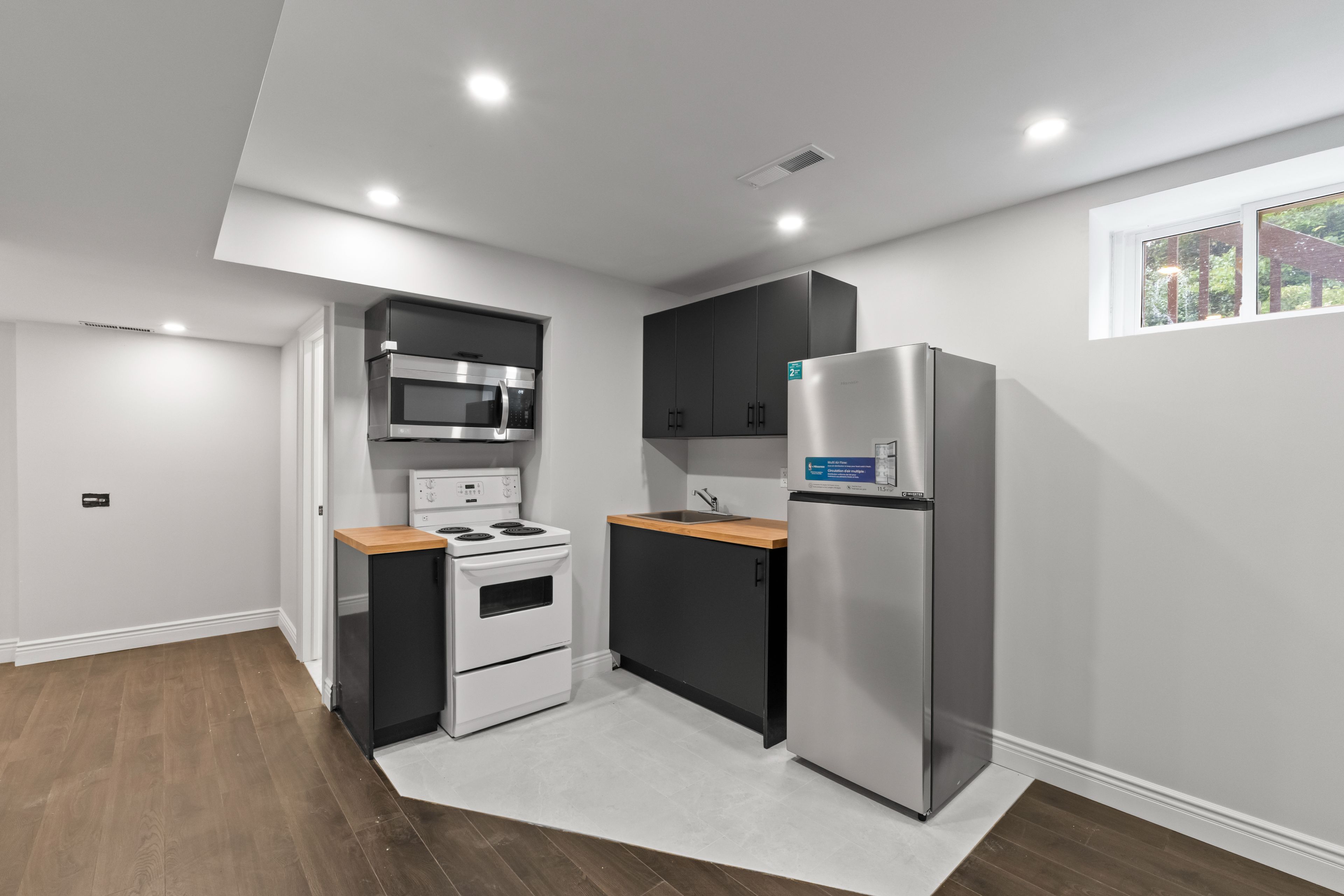 • Modern kitchen with stainless steel appliances and walkout to backyard deck.