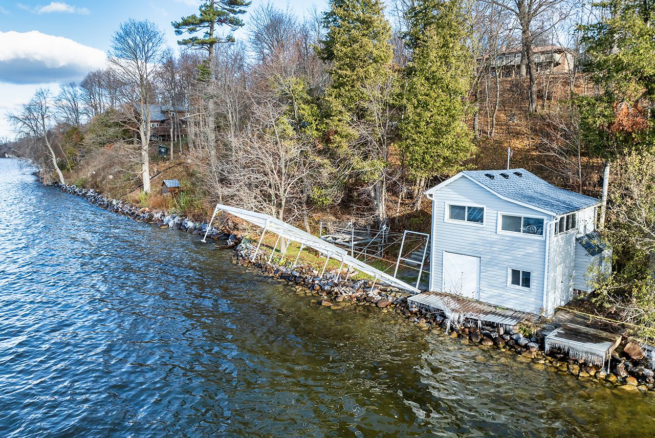 • Outdoor amenities include a storage shed, bunkie, and lakeside firepit.