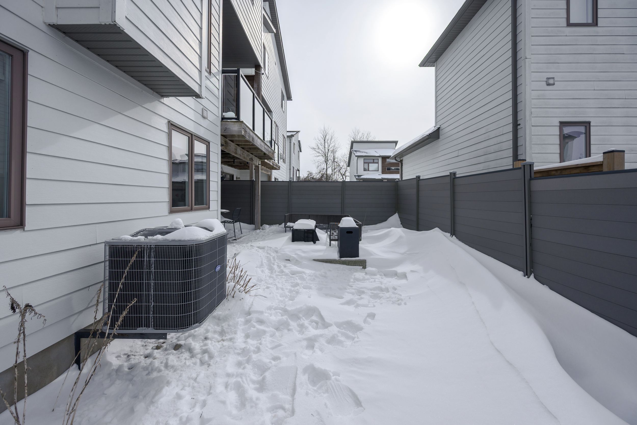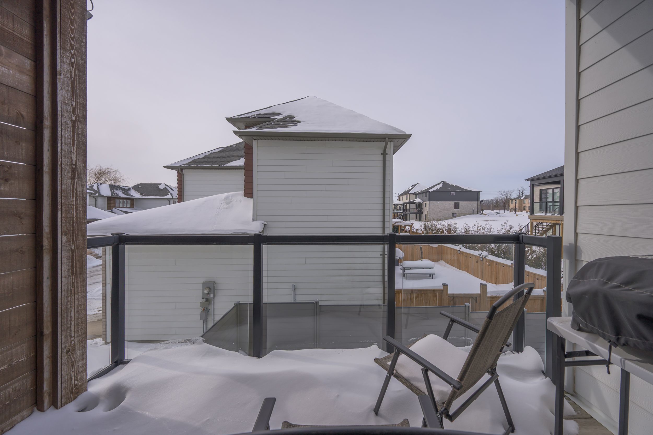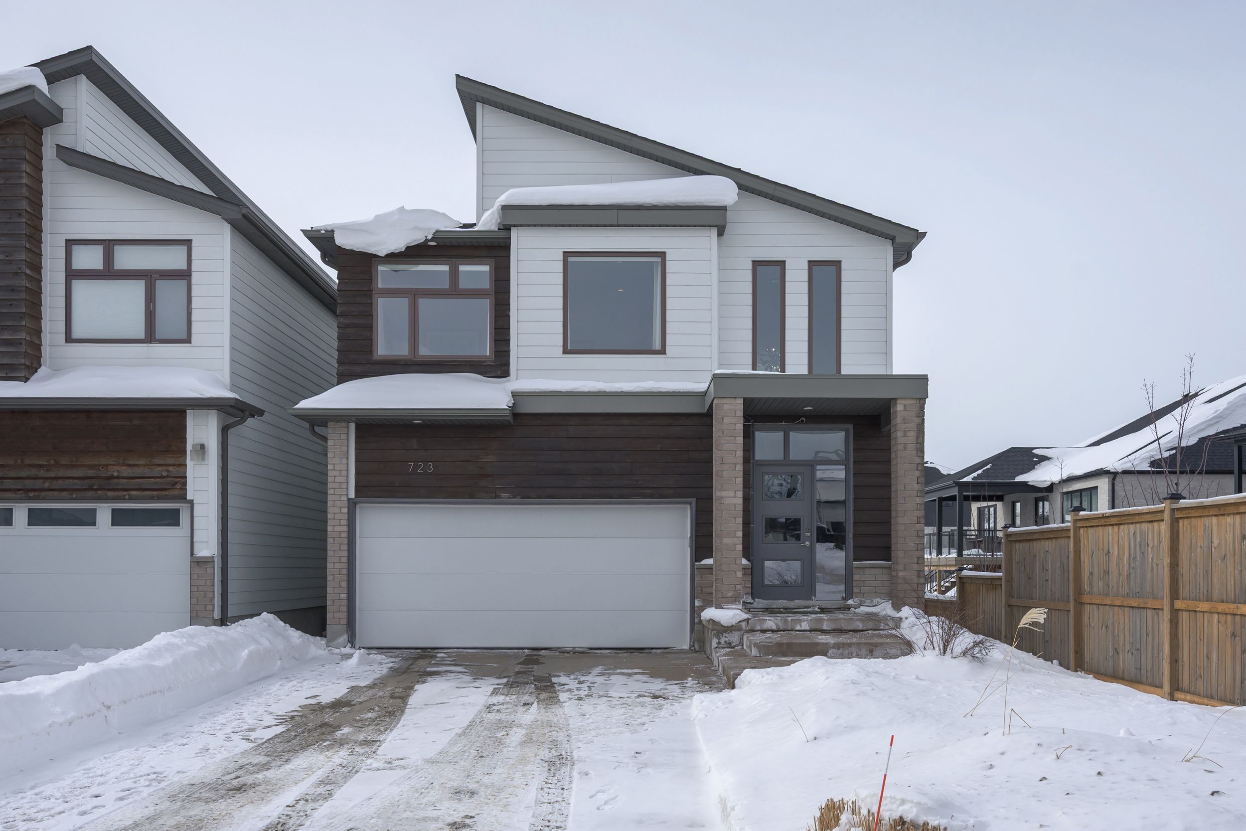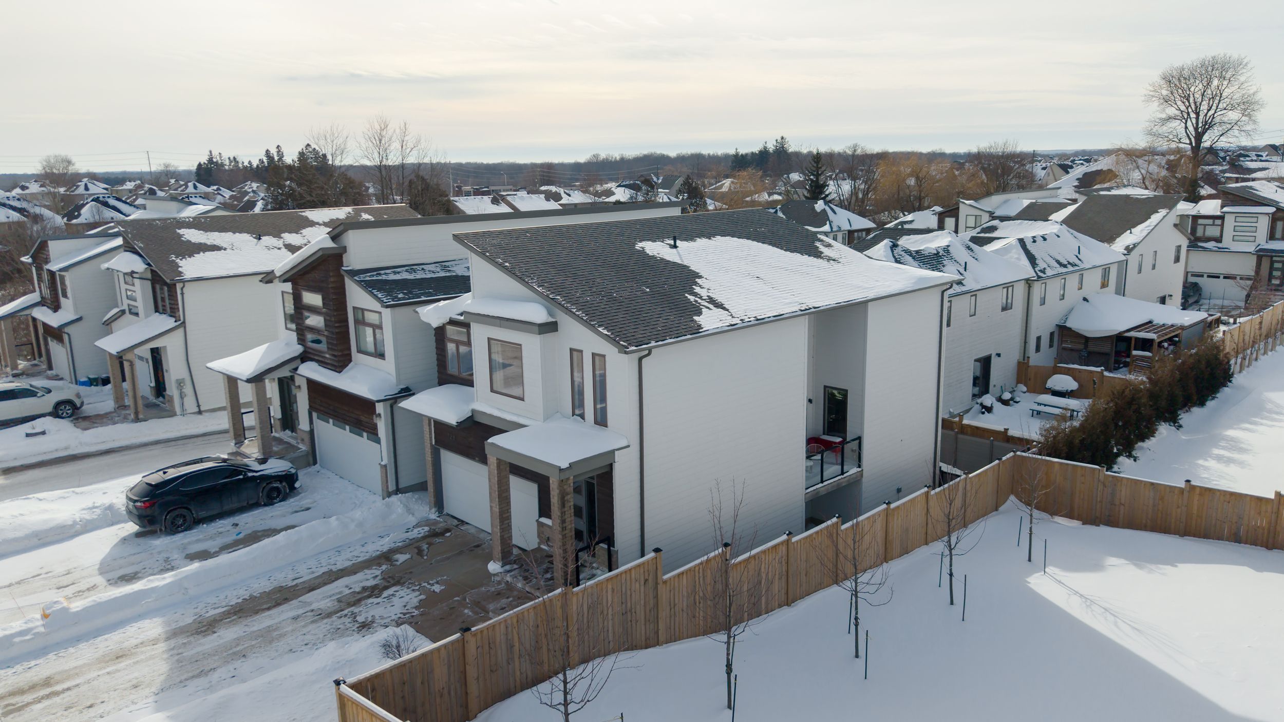 Sleek and modern 2-storey located in prestigious byron. The open-concept main floor offers an ideal layout for both entertaining and everyday living. The spacious kitchen features impressive 2-storey ceilings, a large island, and seamless flow into the dining and living areas, complete with a stylish wine bar. Two sets of sliding doors lead to covered balconies with glass railings, creating excellent indoor-outdoor living spaces. The living room showcases large west-facing windows and a cozy fireplace with updated tile surround. Additional main floor updates include custom window coverings (2025), dishwasher (2021), and a stone countertop in the powder room. The main floor laundry and mudroom combination offers custom built-in cabinetry, along with a new washer and dryer (2023). The innovative dual-washer machine allows for simultaneous, separate loads. The spacious primary bedroom features a walk-in closet and beautifully updated ensuite with quartz countertop, tile surround shower, tile flooring, and in-floor heating. Two additional generously sized bedrooms share a jack and jill bathroom. The thoughtfully redesigned walk-out lower level includes two additional finished rooms, a rec room, and a 3-piece bathroom. Further updates include concrete patio, fully fenced with composite privacy fencing and gate, a/c (2024), furnace motor, google nest, garage door opener with remotes and app capability. This vacant land condo has a monthly fee of $285, which covers snow removal for the driveway, steps, and porch, as well as maintenance of the private road.
