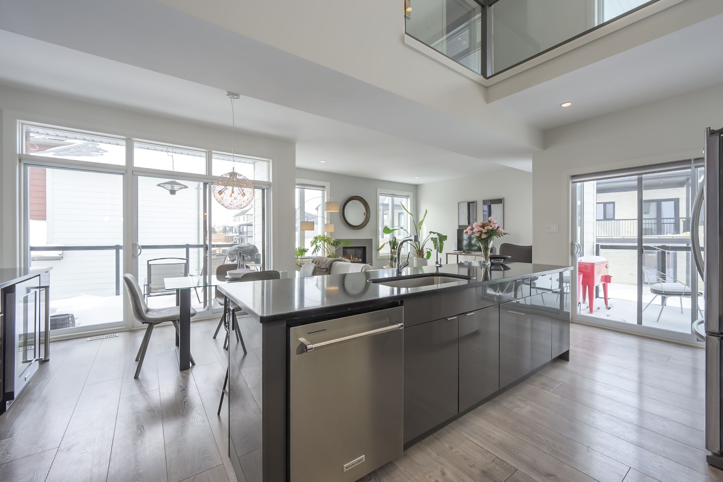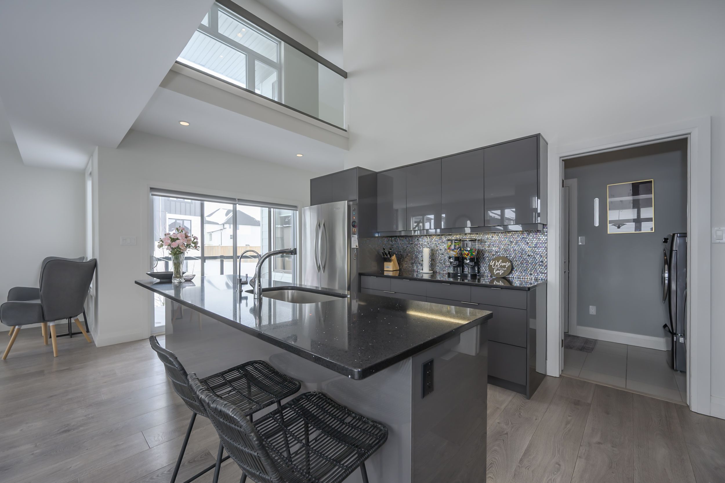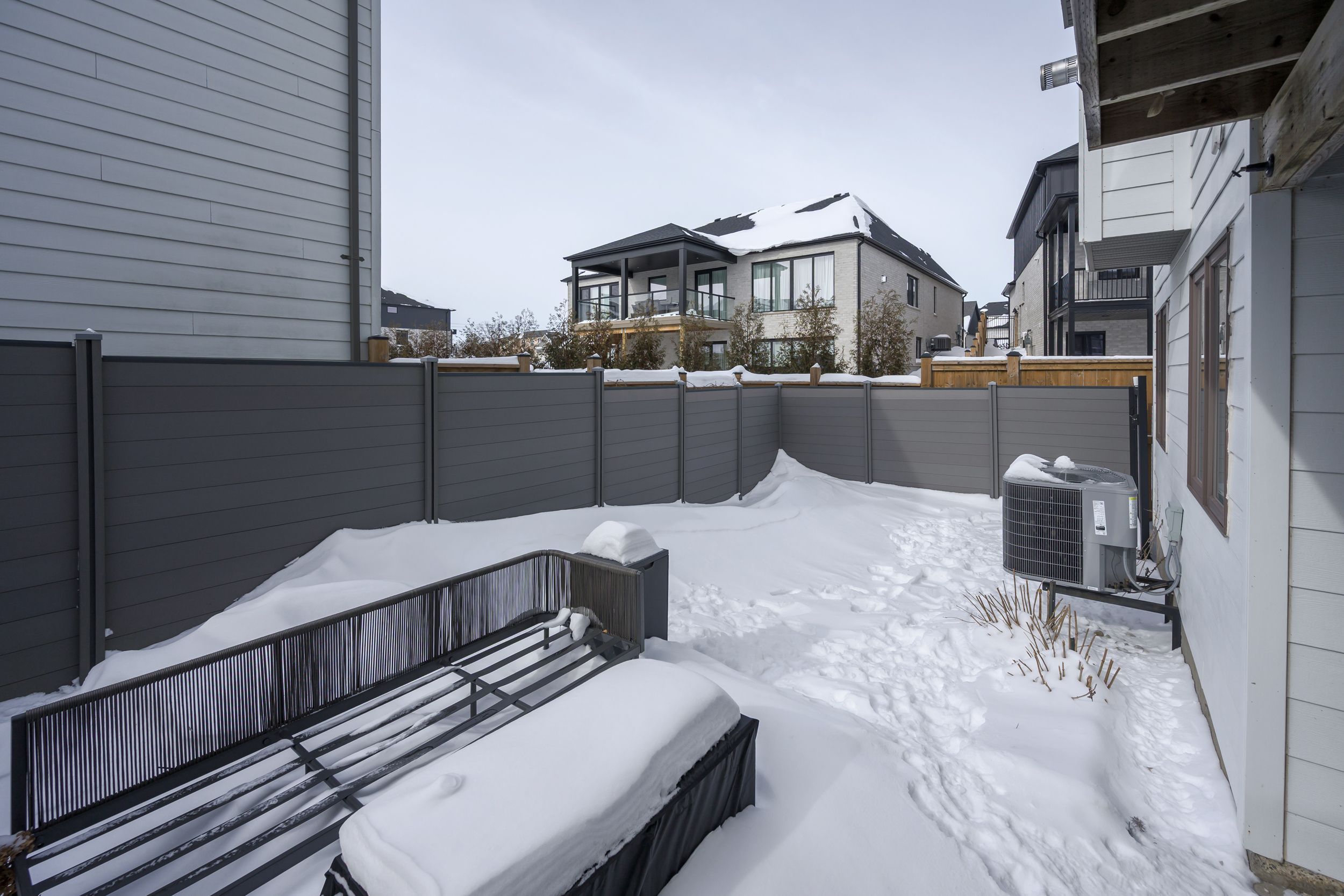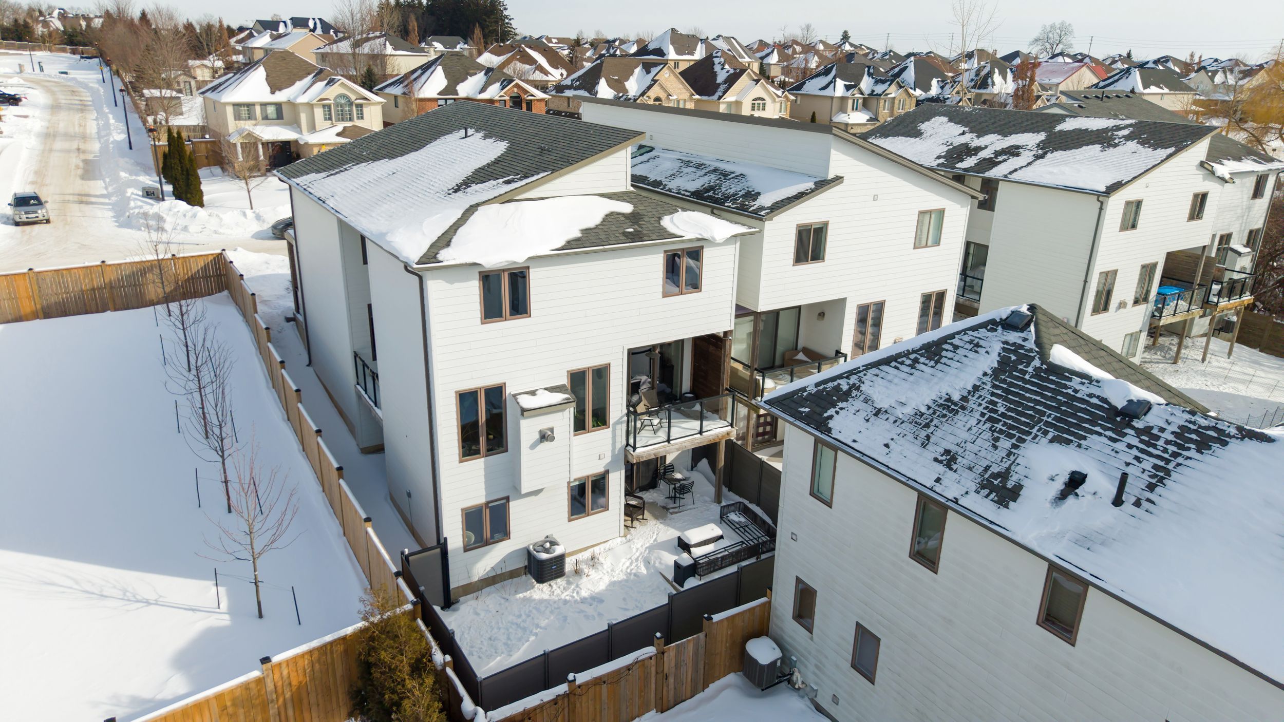 Sleek and modern 2-storey located in prestigious byron. The open-concept main floor offers an ideal layout for both entertaining and everyday living. The spacious kitchen features impressive 2-storey ceilings, a large island, and seamless flow into the dining and living areas, complete with a stylish wine bar. Two sets of sliding doors lead to covered balconies with glass railings, creating excellent indoor-outdoor living spaces. The living room showcases large west-facing windows and a cozy fireplace with updated tile surround. Additional main floor updates include custom window coverings (2025), dishwasher (2021), and a stone countertop in the powder room. The main floor laundry and mudroom combination offers custom built-in cabinetry, along with a new washer and dryer (2023). The innovative dual-washer machine allows for simultaneous, separate loads. The spacious primary bedroom features a walk-in closet and beautifully updated ensuite with quartz countertop, tile surround shower, tile flooring, and in-floor heating. Two additional generously sized bedrooms share a jack and jill bathroom. The thoughtfully redesigned walk-out lower level includes two additional finished rooms, a rec room, and a 3-piece bathroom. Further updates include concrete patio, fully fenced with composite privacy fencing and gate, a/c (2024), furnace motor, google nest, garage door opener with remotes and app capability. This vacant land condo has a monthly fee of $285, which covers snow removal for the driveway, steps, and porch, as well as maintenance of the private road.