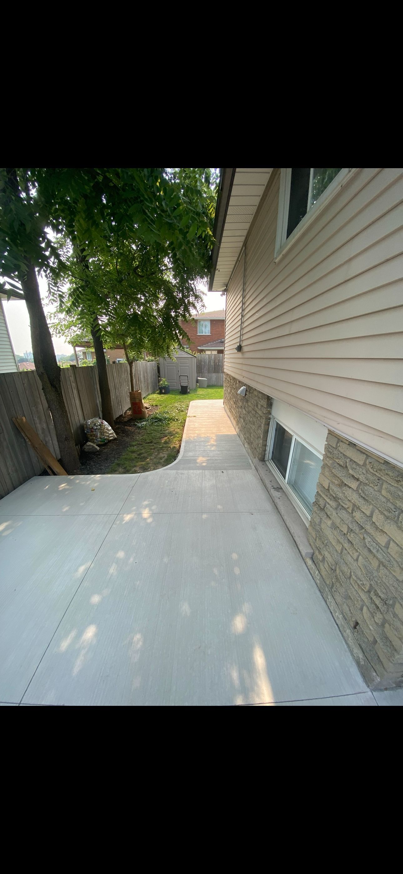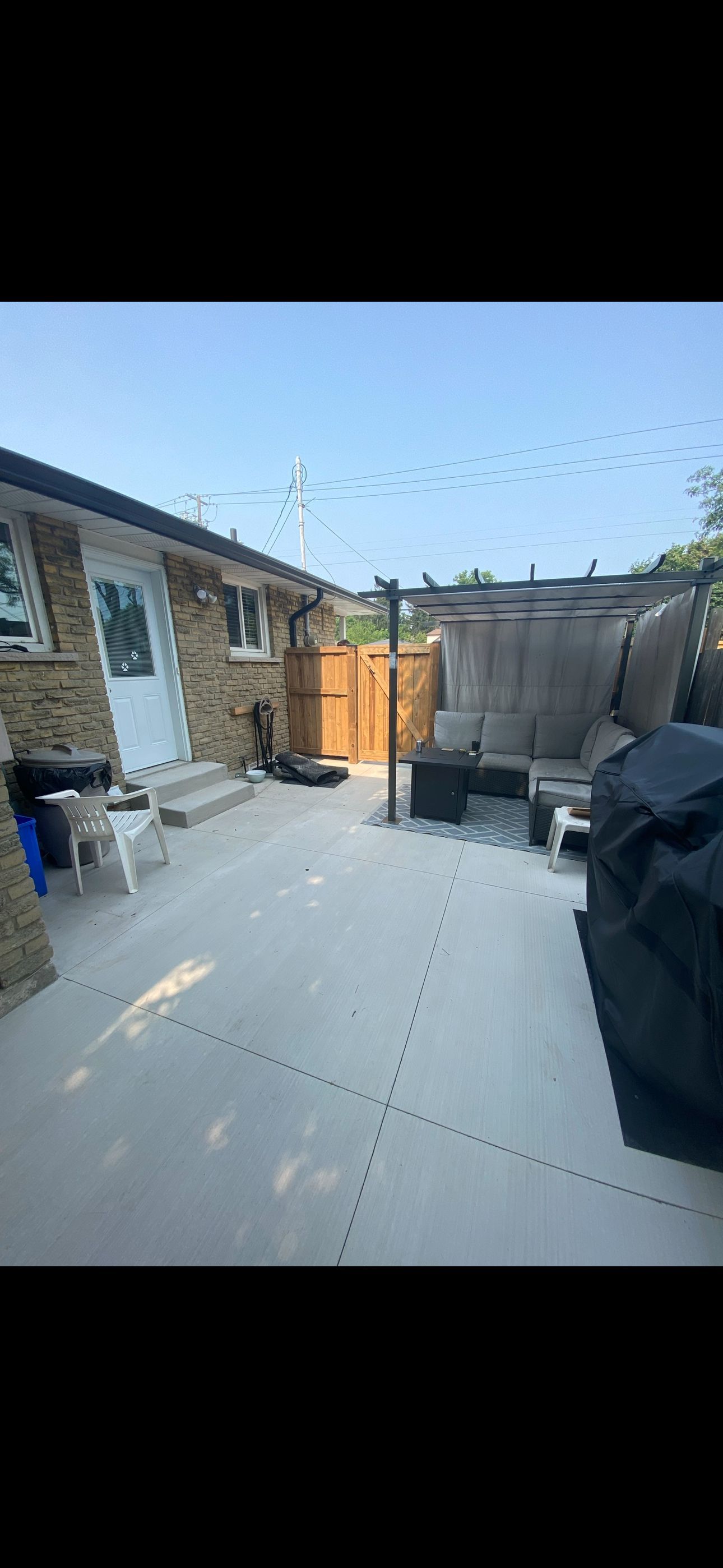 • Backyard features a pergola, seating area, and garden shed.