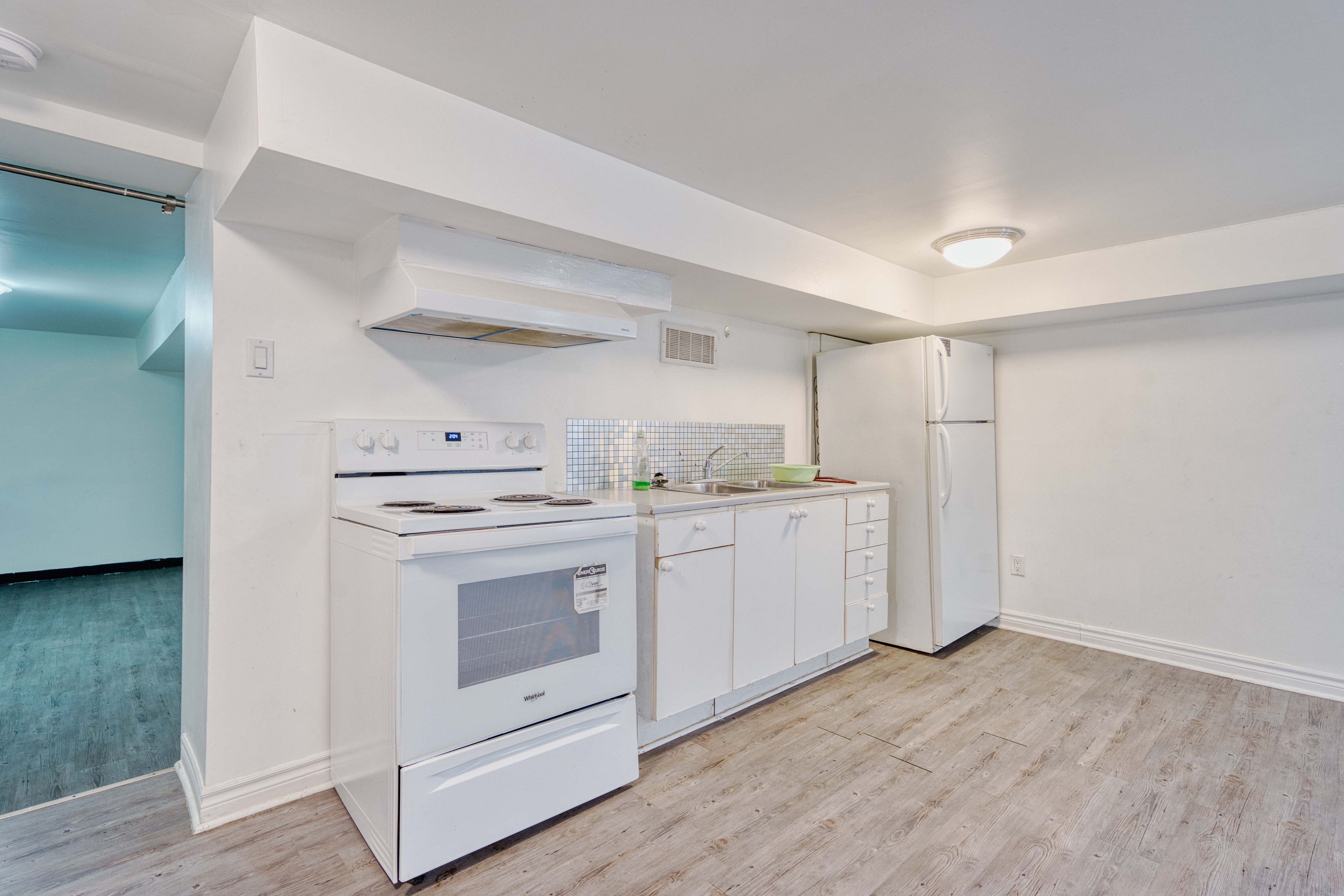 • Open-concept kitchen and living area with durable laminate flooring.