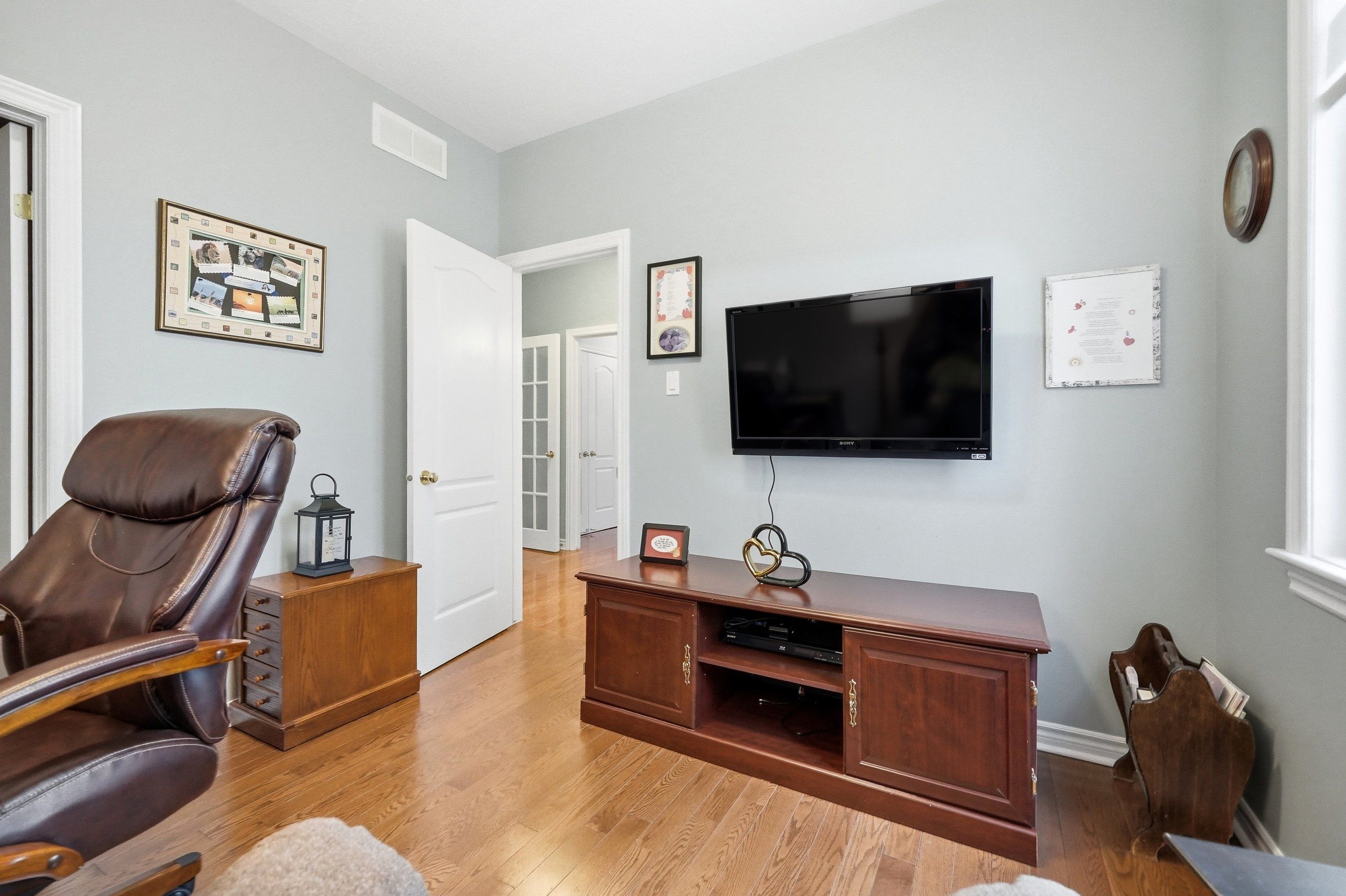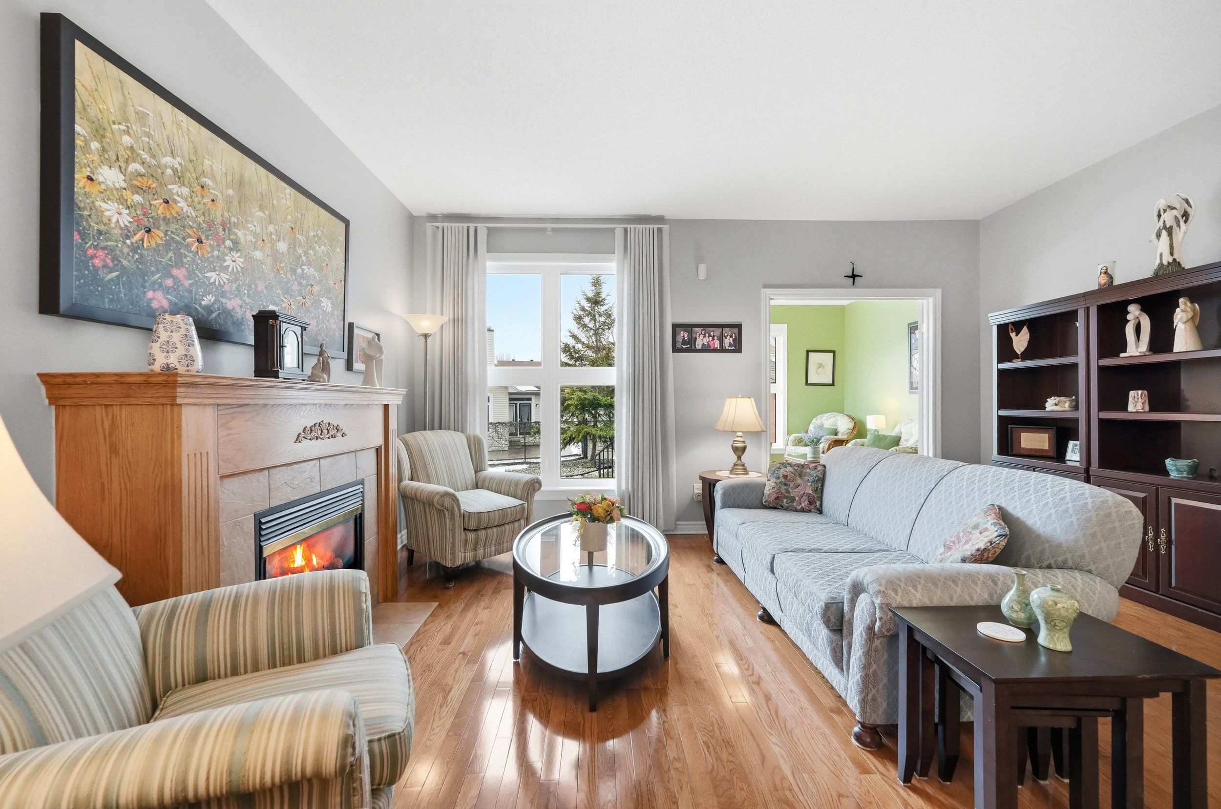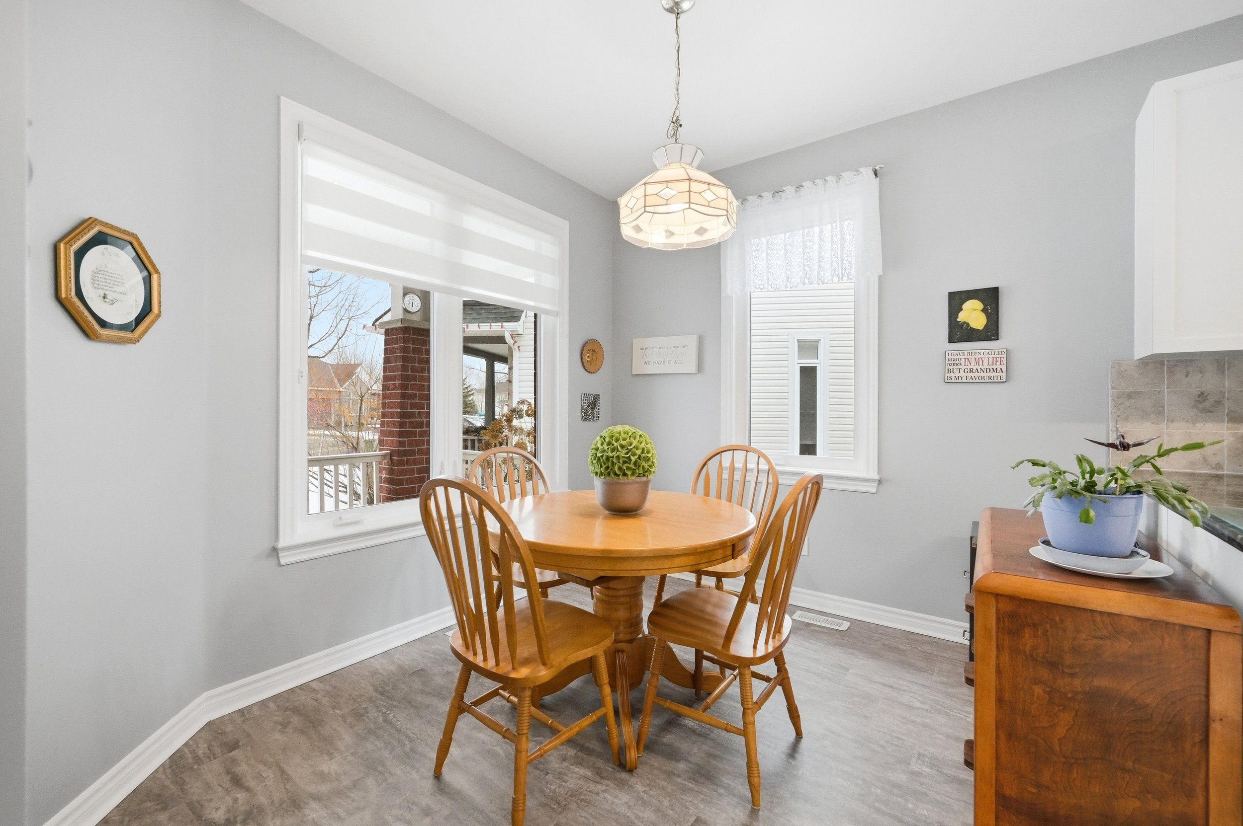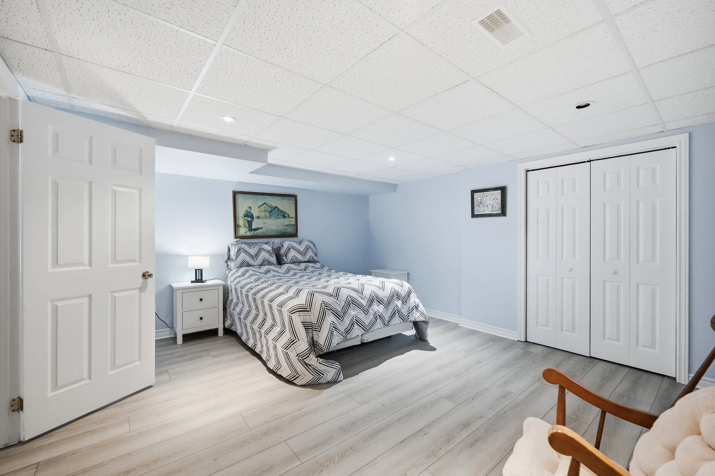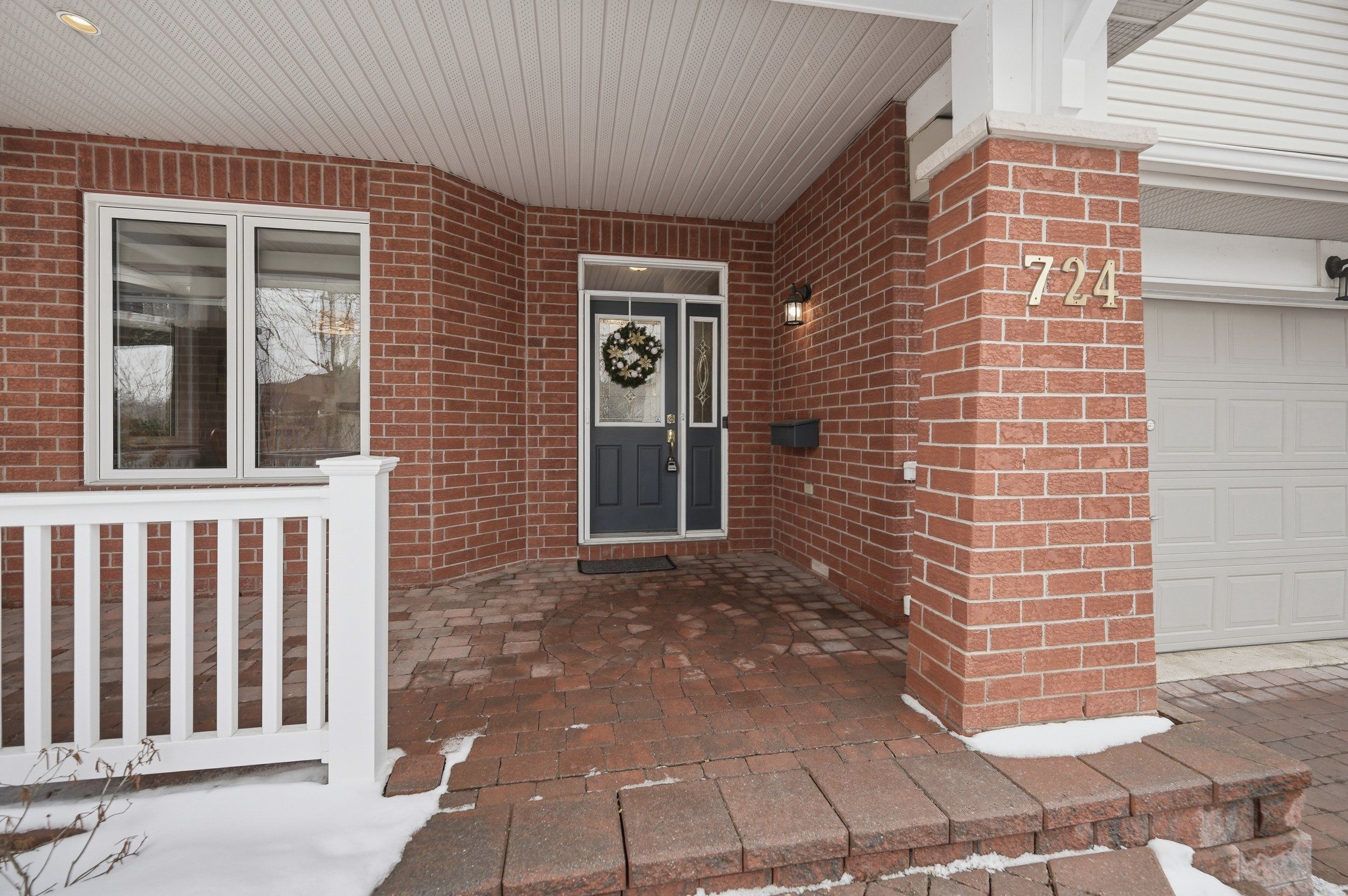 • Located on a quiet street near a park with mature trees.