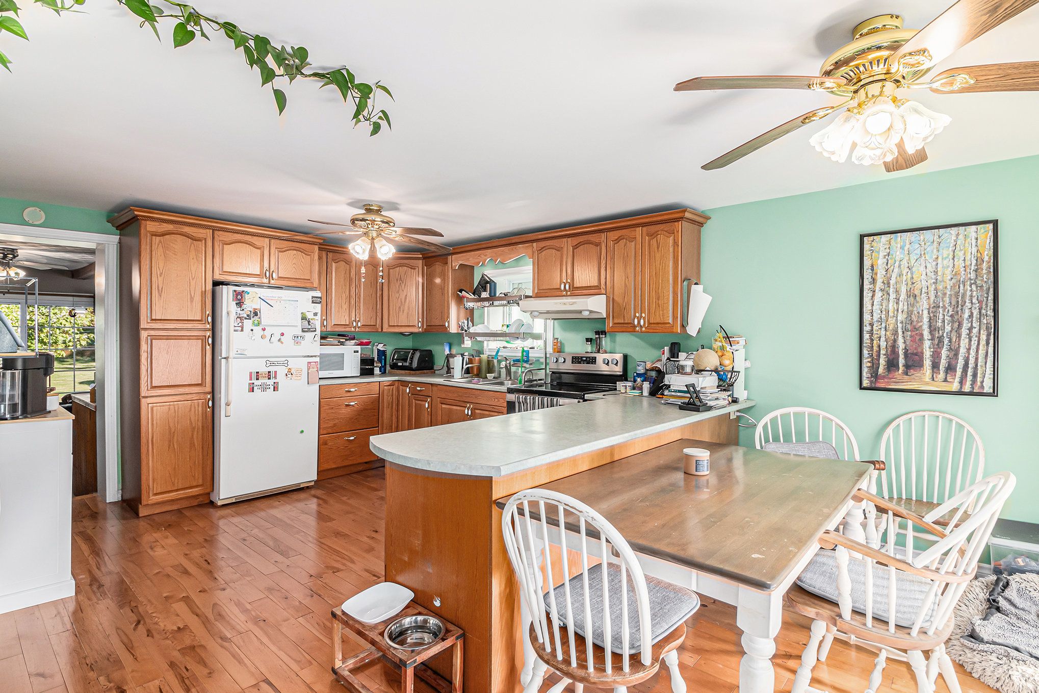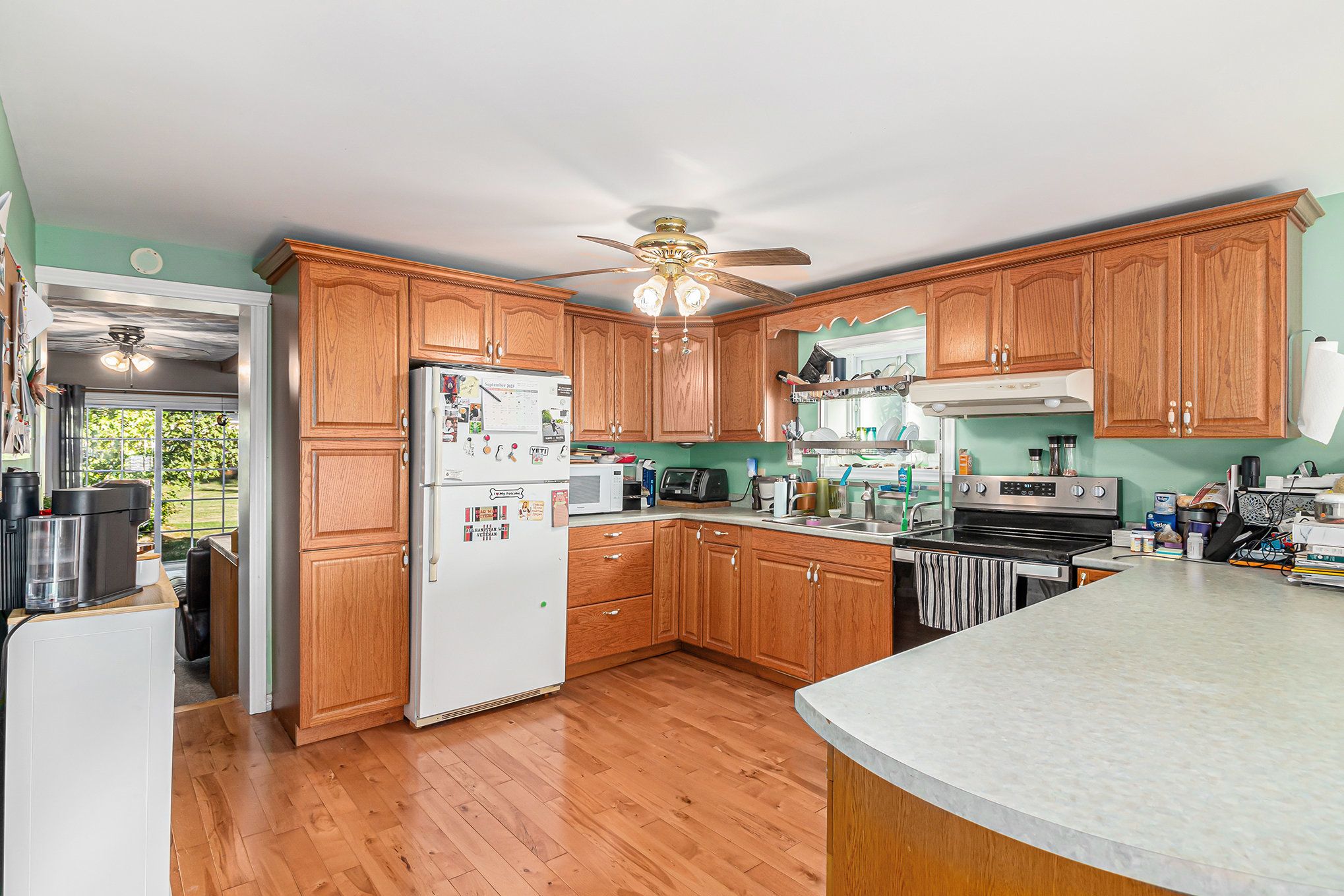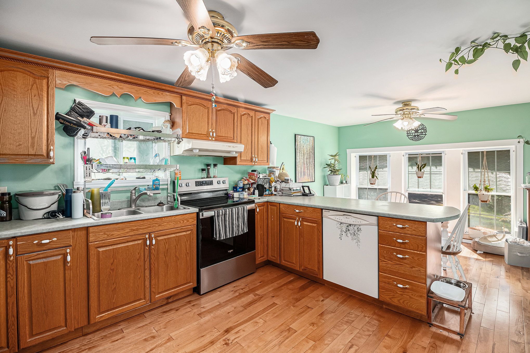 • Eat-in kitchen with ample oak cabinetry and counter space.