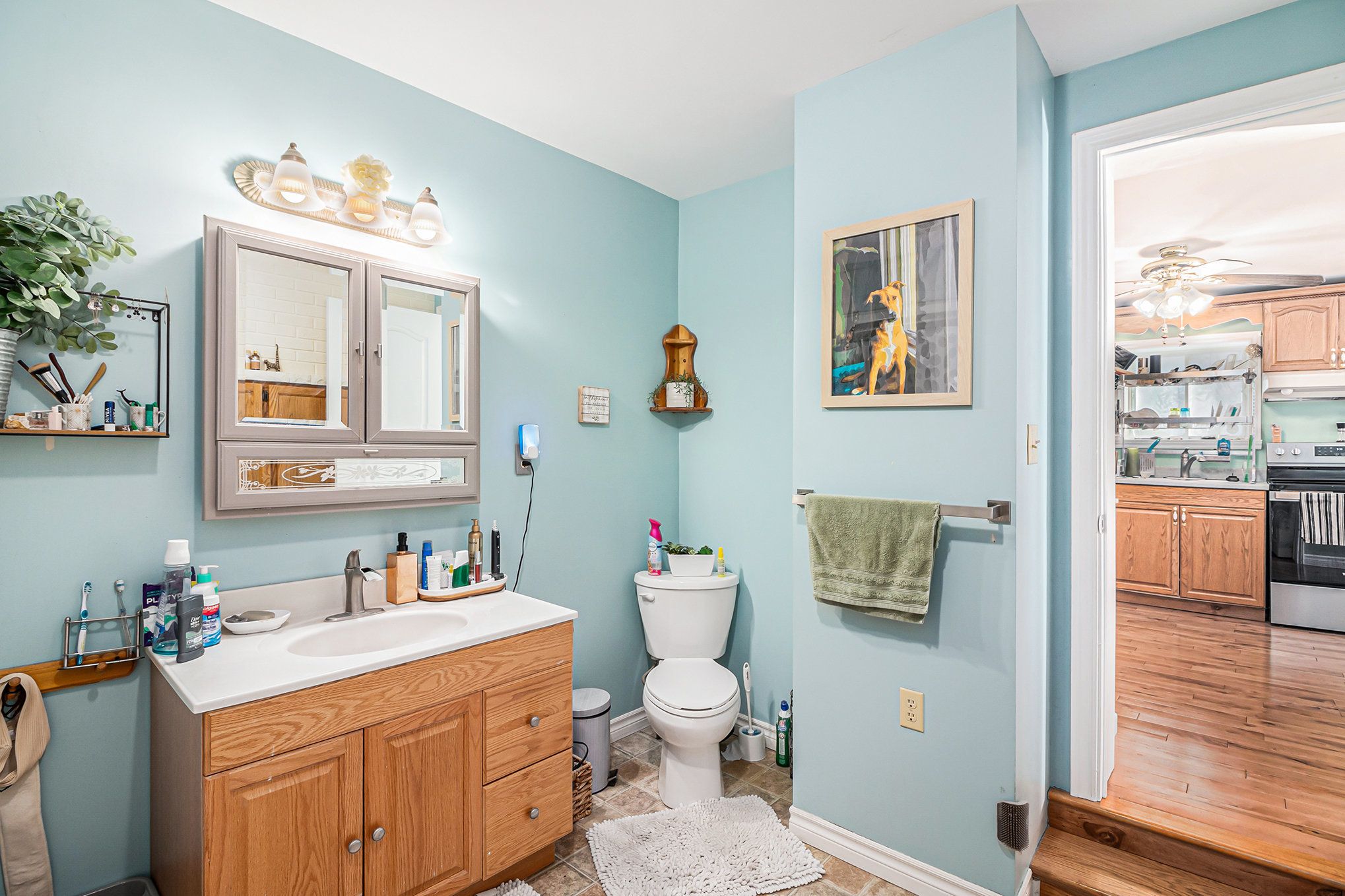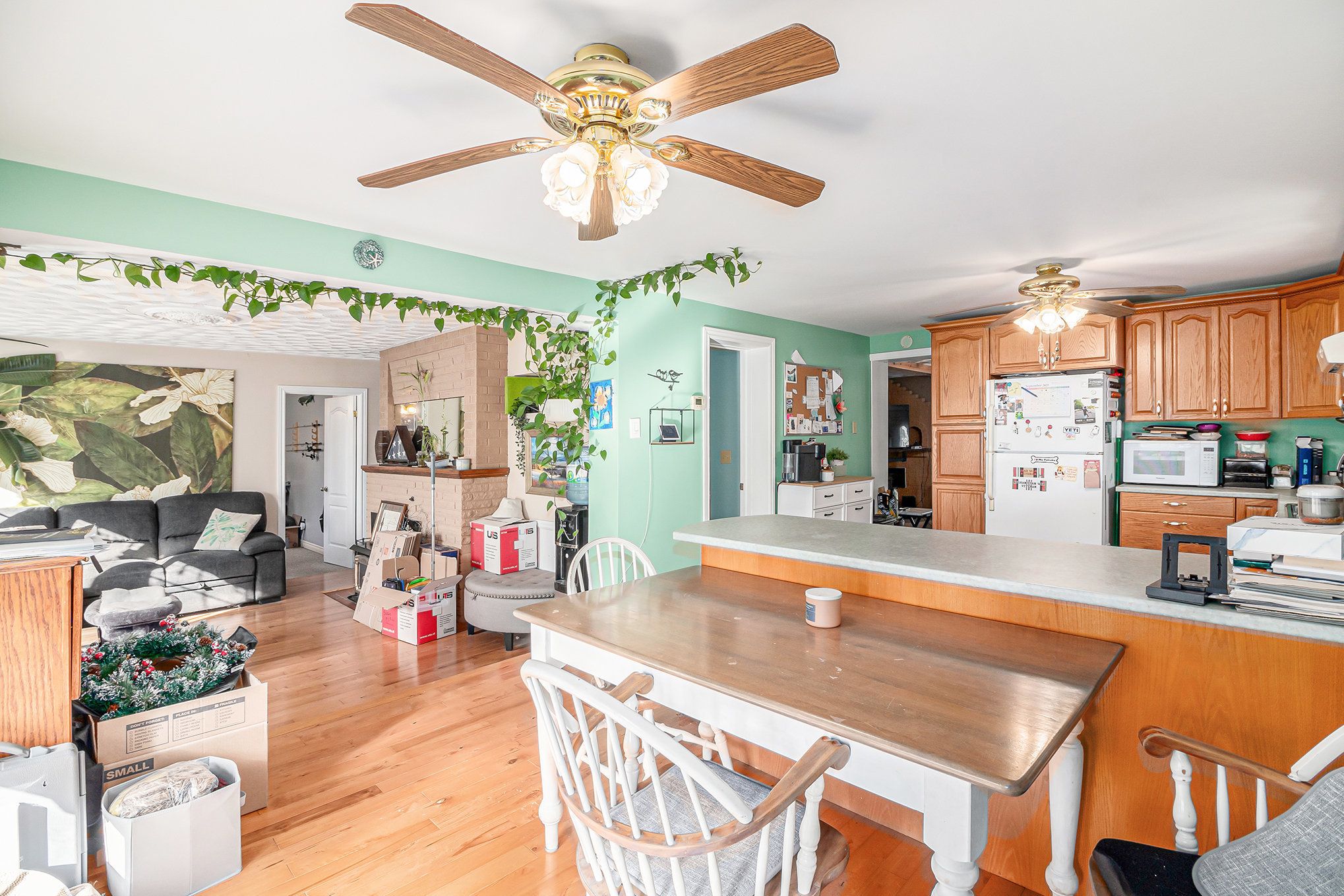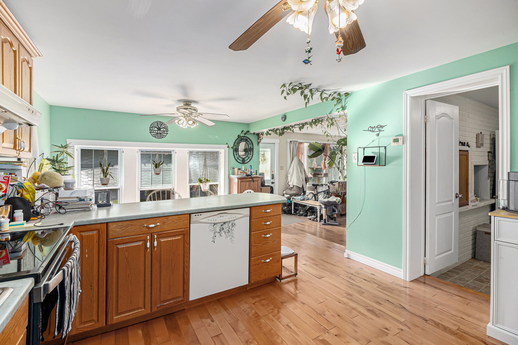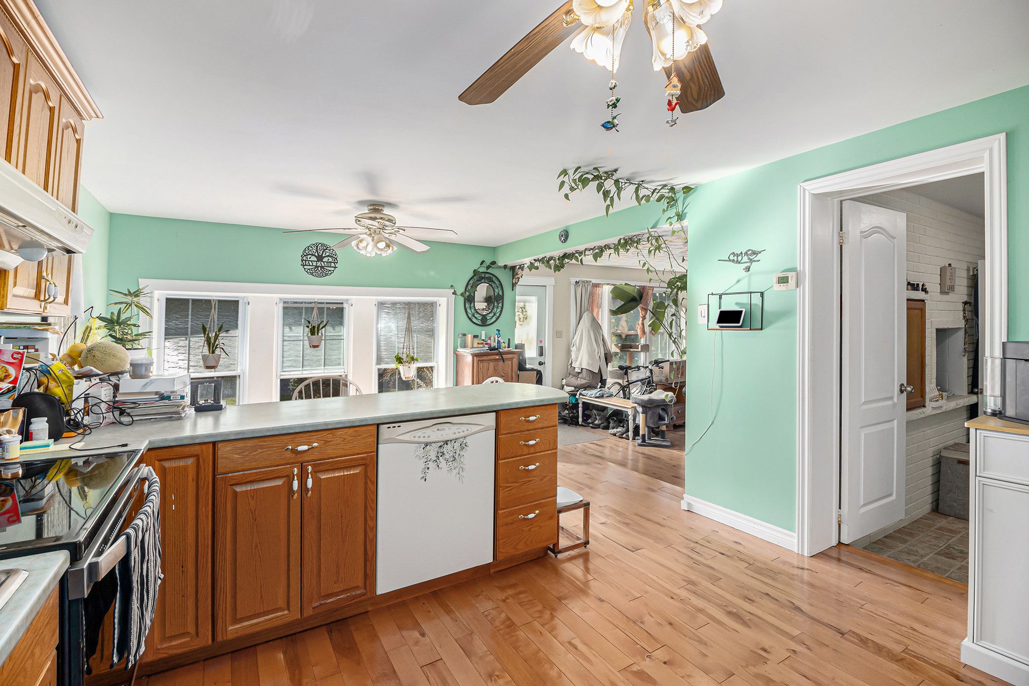 • Eat-in kitchen with ample oak cabinetry and counter space.