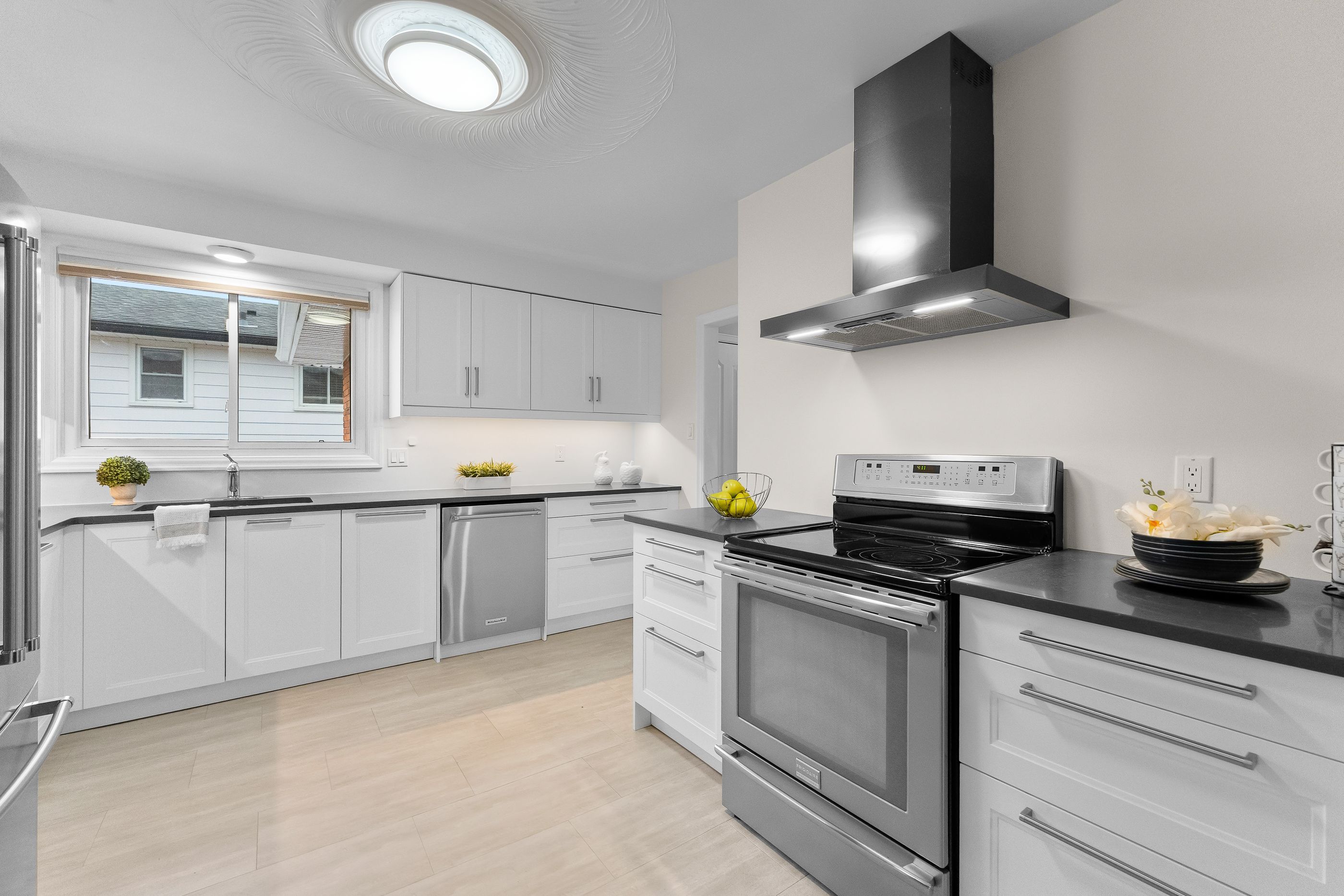 • Modern kitchen with functional layout and hard surface counters.