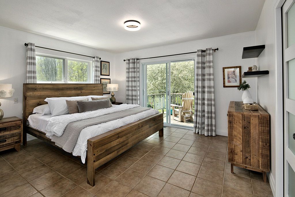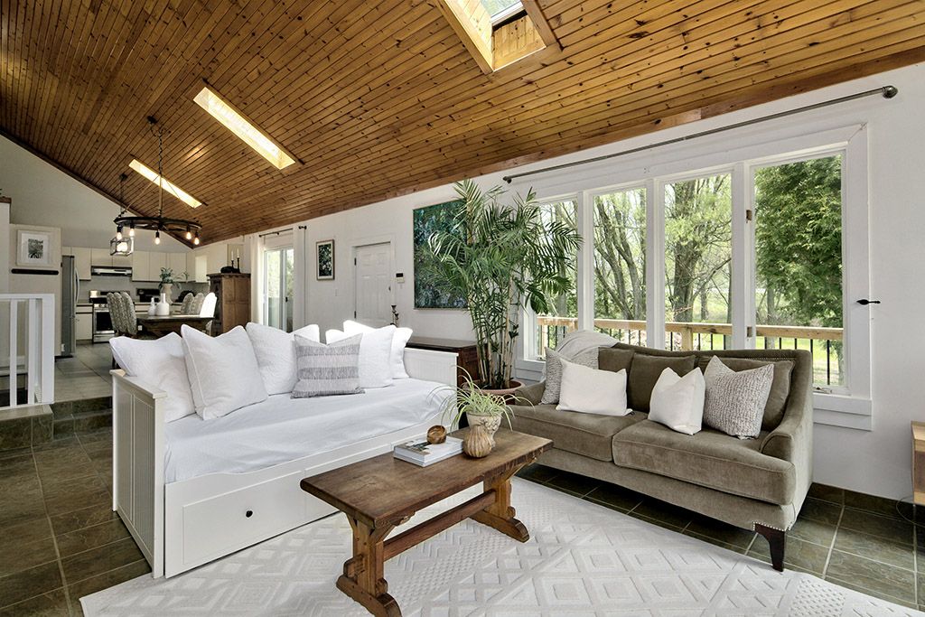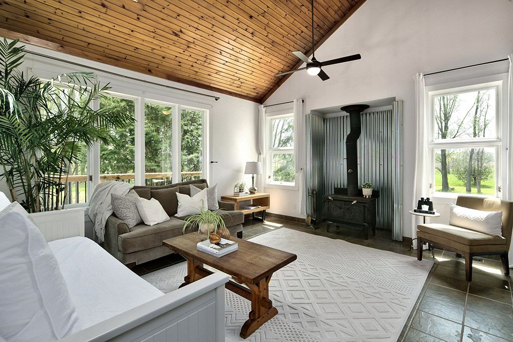 • Raised bungalow with vaulted ceilings, skylights, and a cozy wood-burning stove.