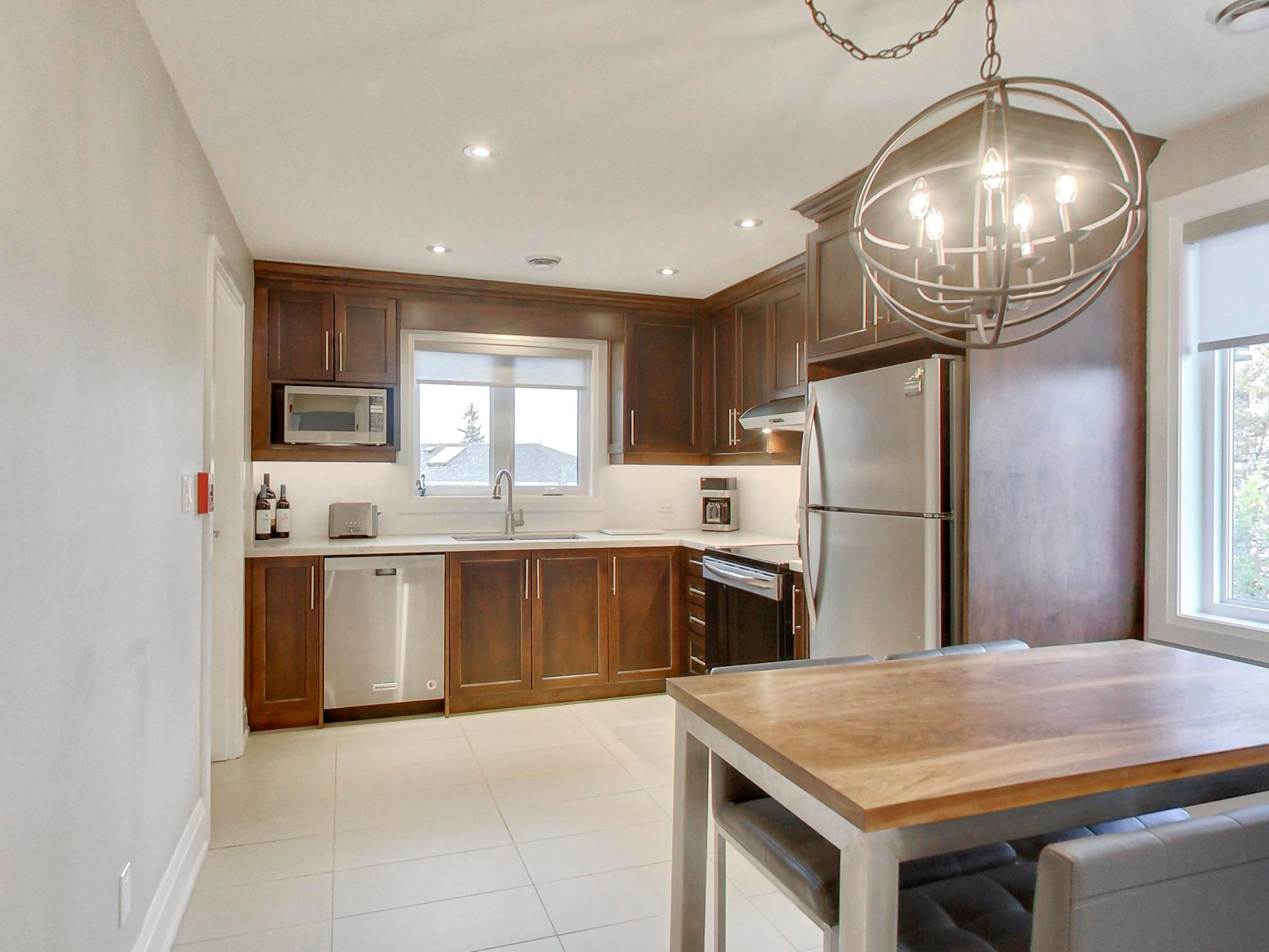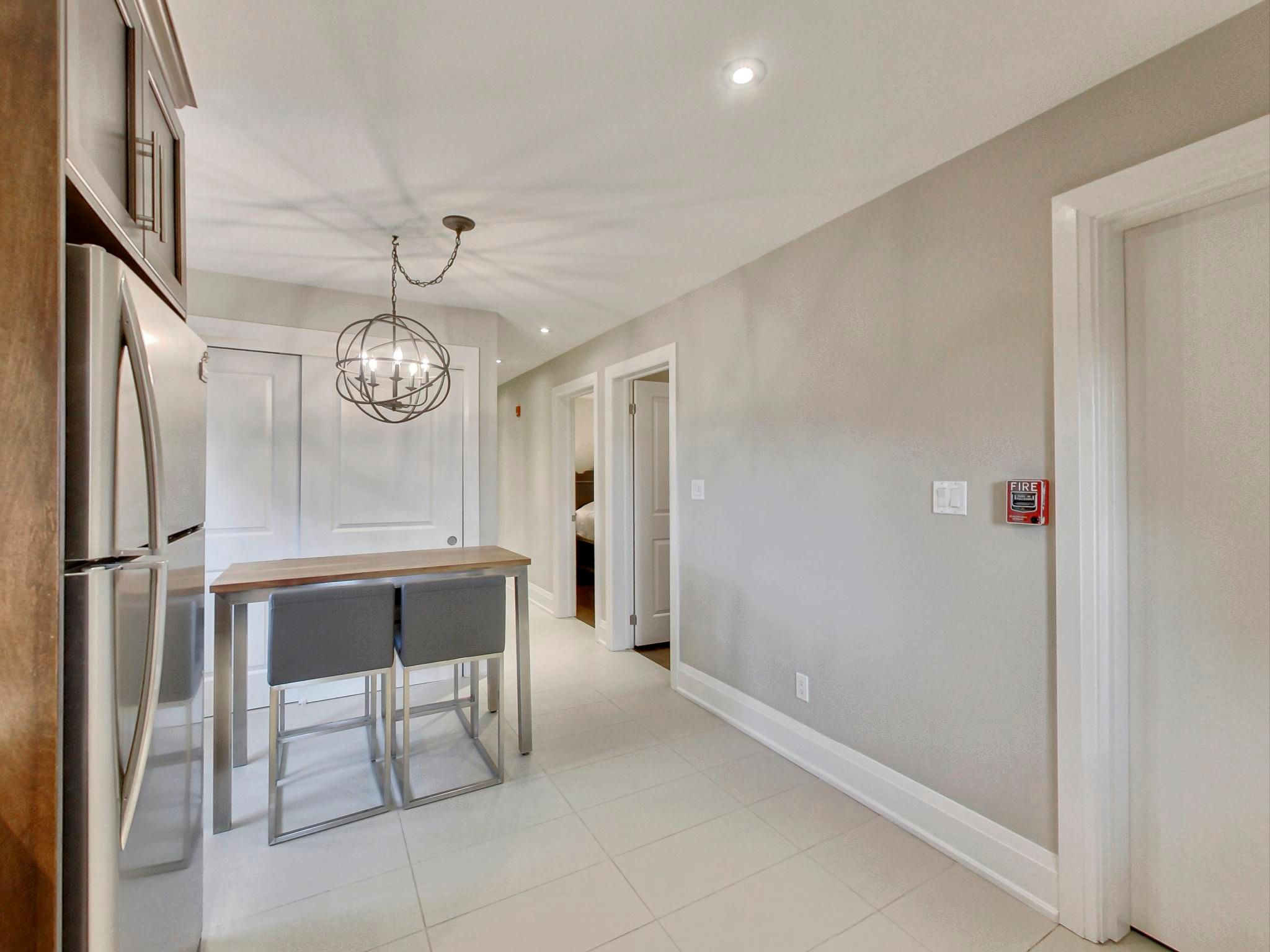 • Modern eat-in kitchen with stainless steel appliances and quartz countertops.
