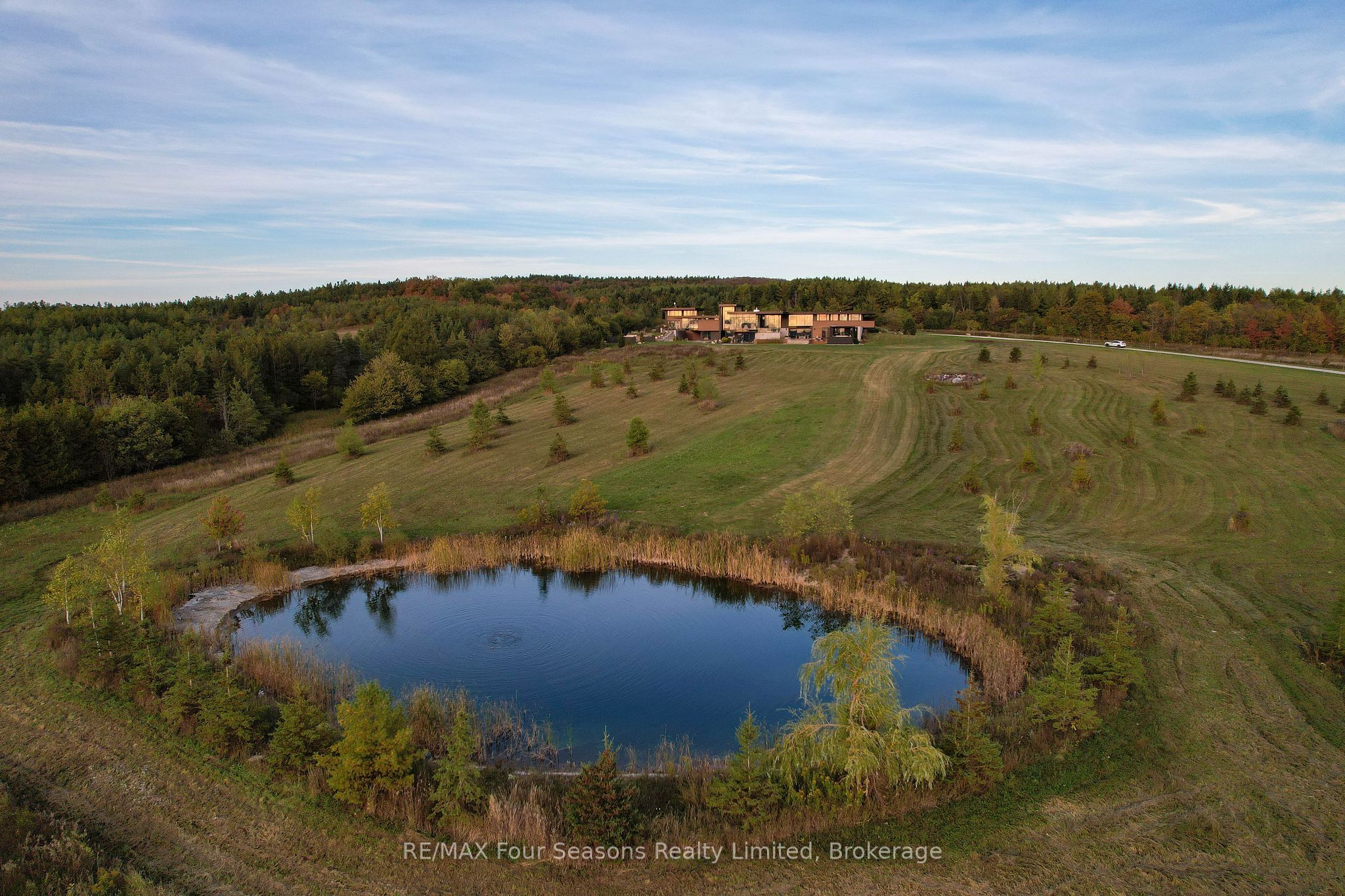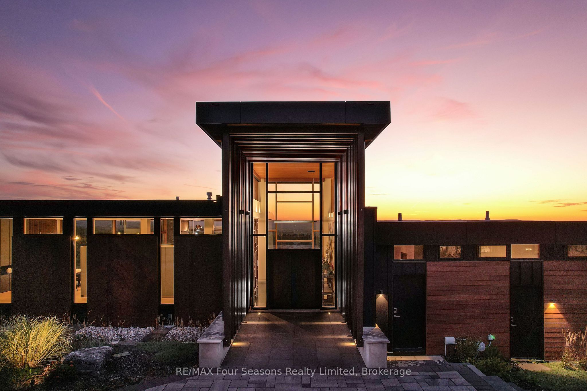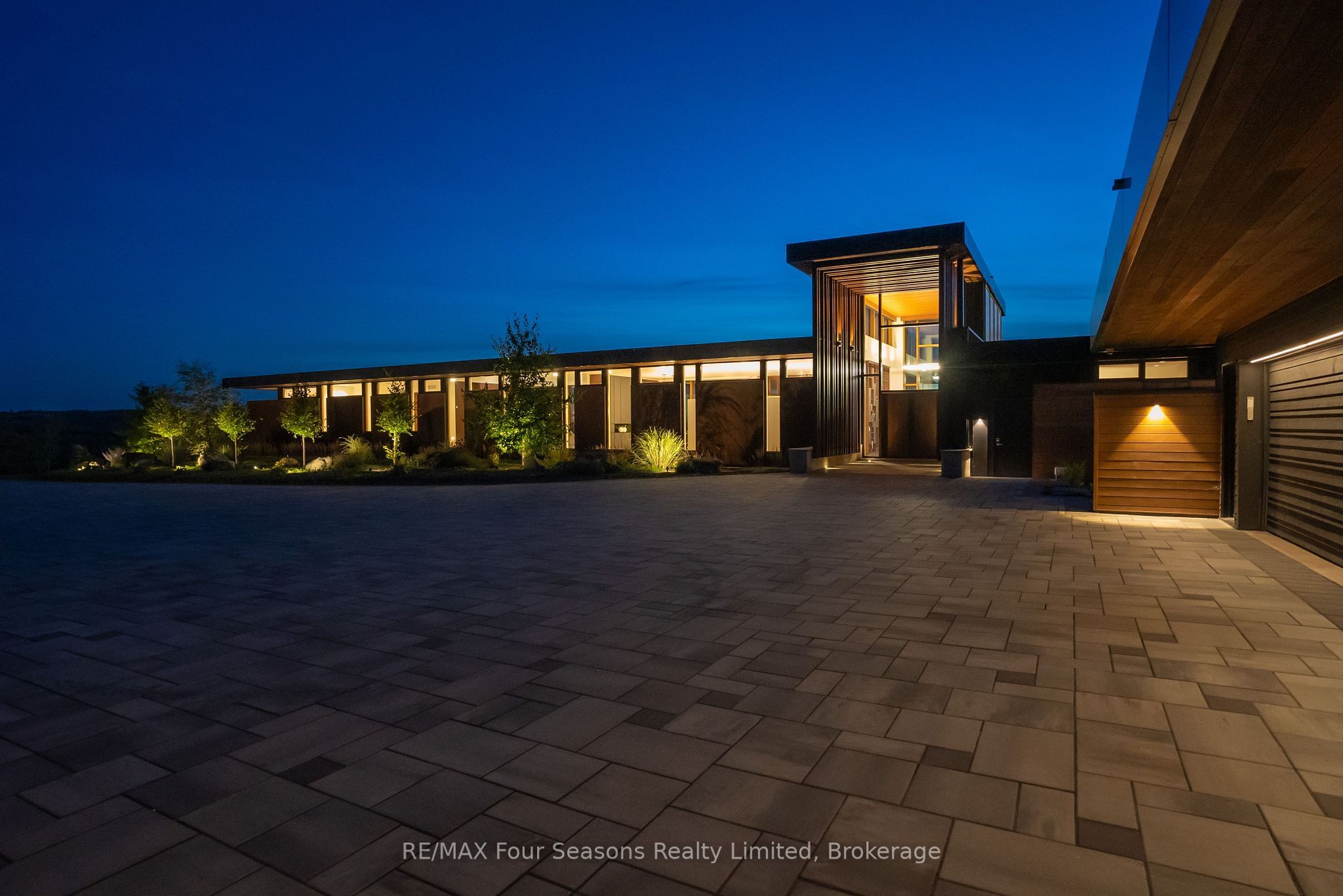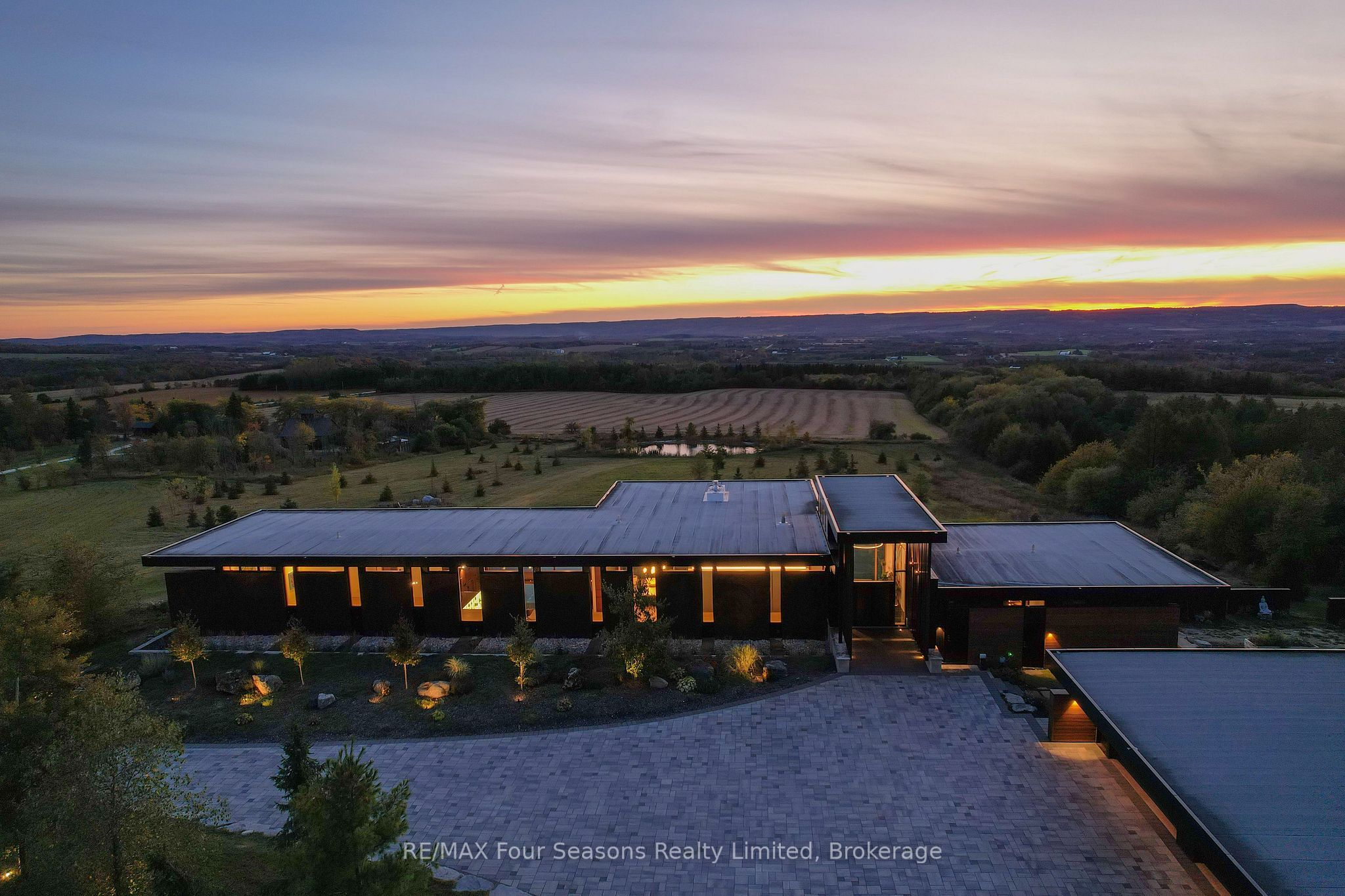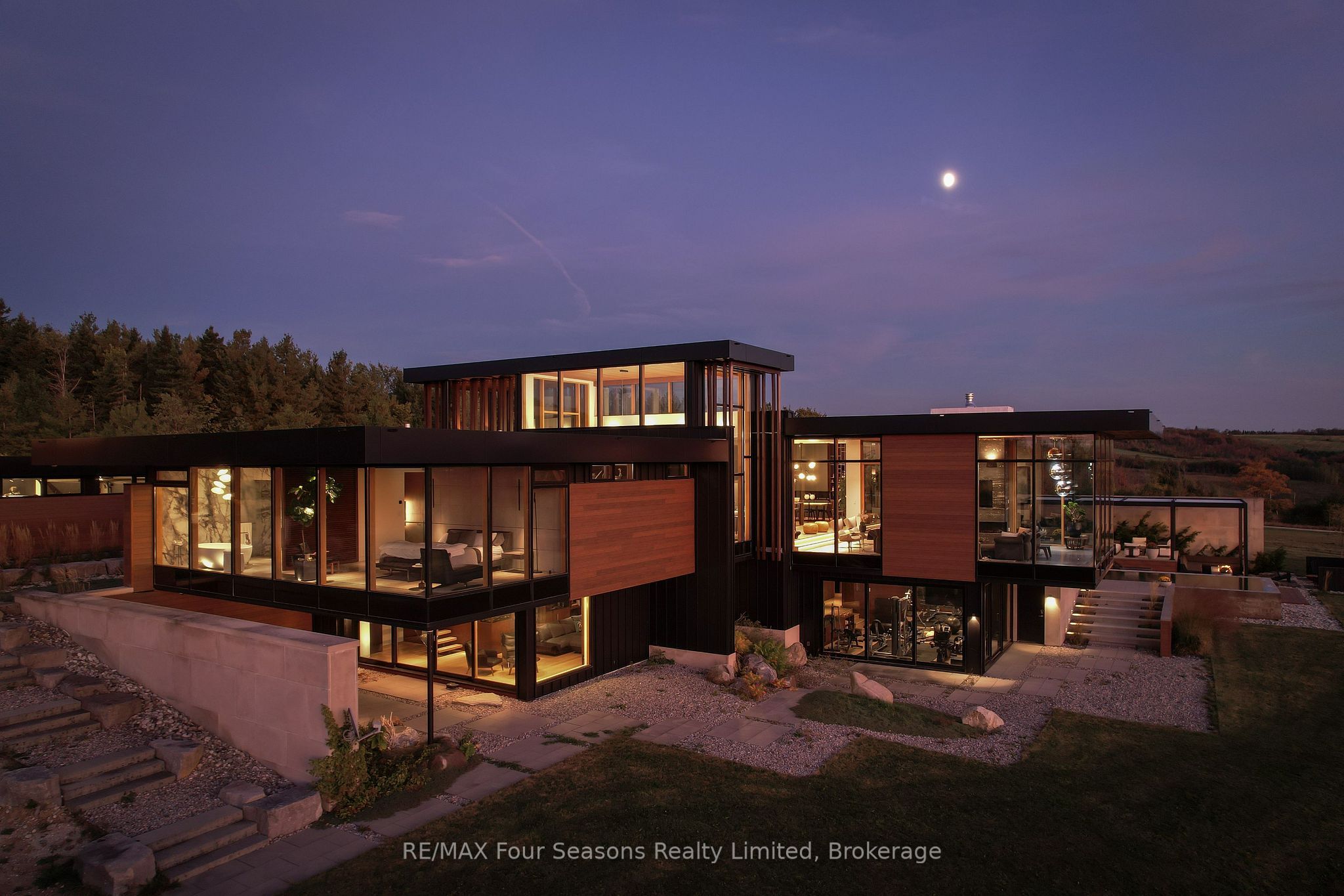 Majestically positioned upon eighty pristine acres within clarksburg's most distinguished countryside enclave, this frank lloyd wright-inspired architectural tour de force represents the pinnacle of luxury residential design. Approached through monitored gates and a winding driveway, this extraordinary five-bedroom, seven-bathroom estate exemplifies uncompromising craftsmanship, where the masterful fusion of corten steel, cedar, and metallic exterior elements creates a striking modern silhouette set against a magnificent natural backdrop, enhanced by dramatic landscape lighting that elevates the estate's grandeur through twilight hours. The palatial interior reveals soaring eighteen-foot ceilings and resplendent marble floors, culminating in an open-concept masterpiece with polished concrete flooring and 12. 5 ft. Floor-to-ceiling windows framing the serene landscape. The varenna poliform kitchen impresses with a 20. 5 ft. Island, sub-zero and wolf appliances, 11 ft. Ceilings, and bespoke walnut cabinetry that flows with architectural harmony throughout. The lavish two-storey primary suite offers polished plaster walls, custom walnut built-ins, a marble ensuite with chronotherapy rain shower, and a private retreat lounge. Additional bedrooms include terraces or balconies, with two guest suites offering luxurious ensuites-one serving as a secondary primary with service bar. Entertainment abounds with a professional theatre, custom gym, and stunning two-storey lounge bar overlooking a 22 ft. Infinity pool. A heated five-car garage and radiant flooring ensure year-round comfort. A separate two-storey guest house includes a full kitchen, loft bedroom, and soaring ceilings. A pristine barn provides premium equestrian facilities. Landscaped grounds feature a fire pit, hot tub, and pergola, all enhanced by elegant lighting. With loree forest nearby and a generac generator, this estate blends architectural brilliance with modern sophistication.