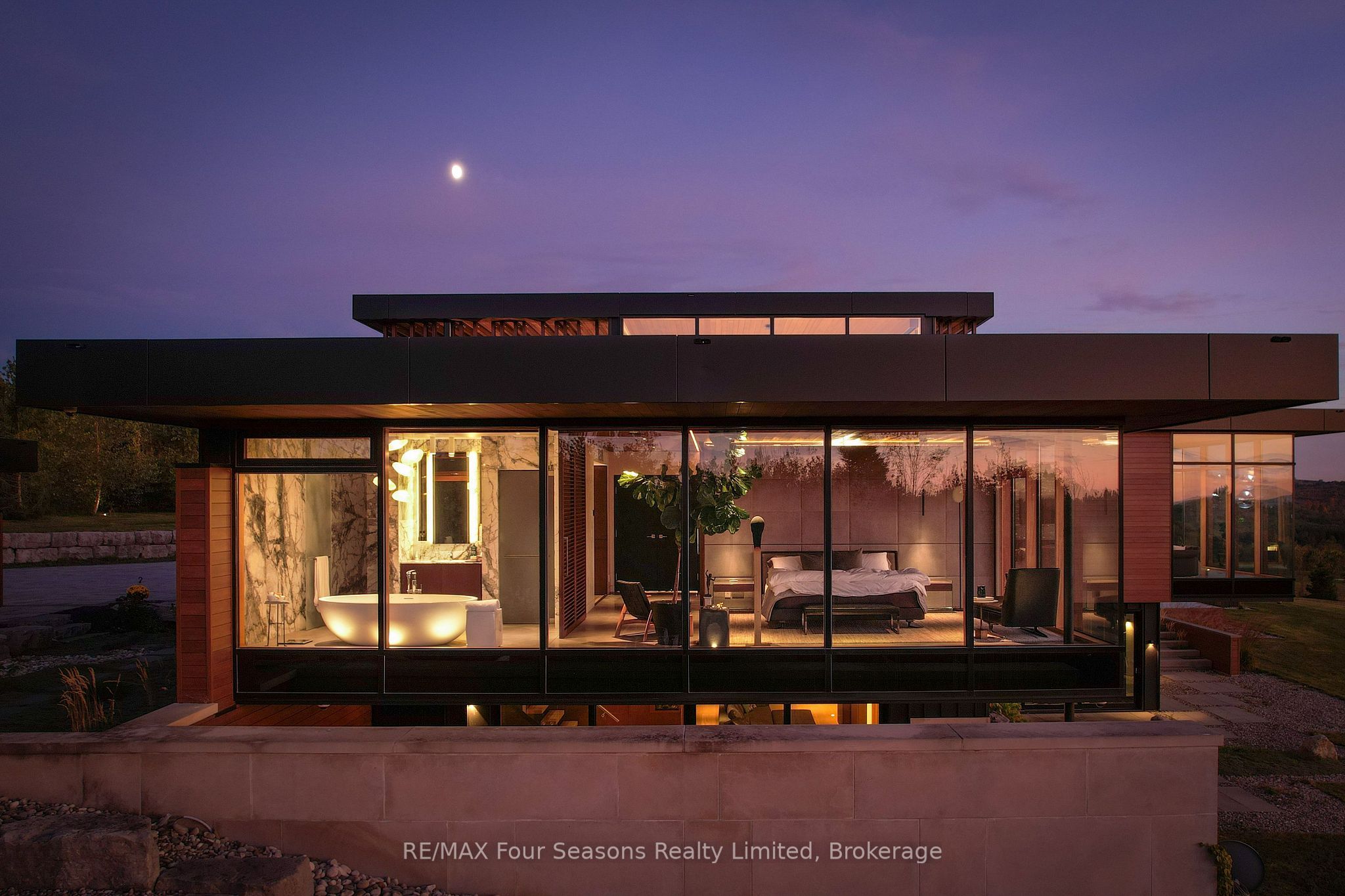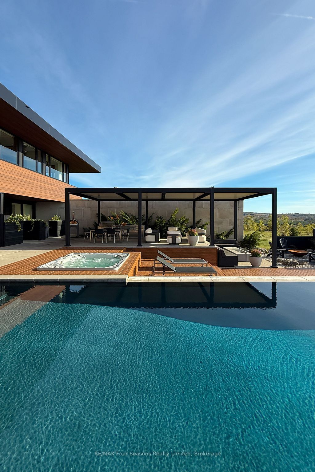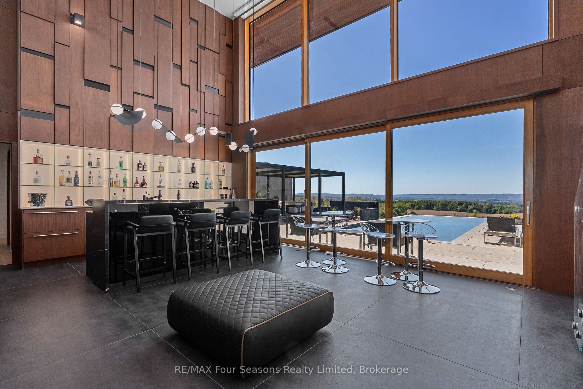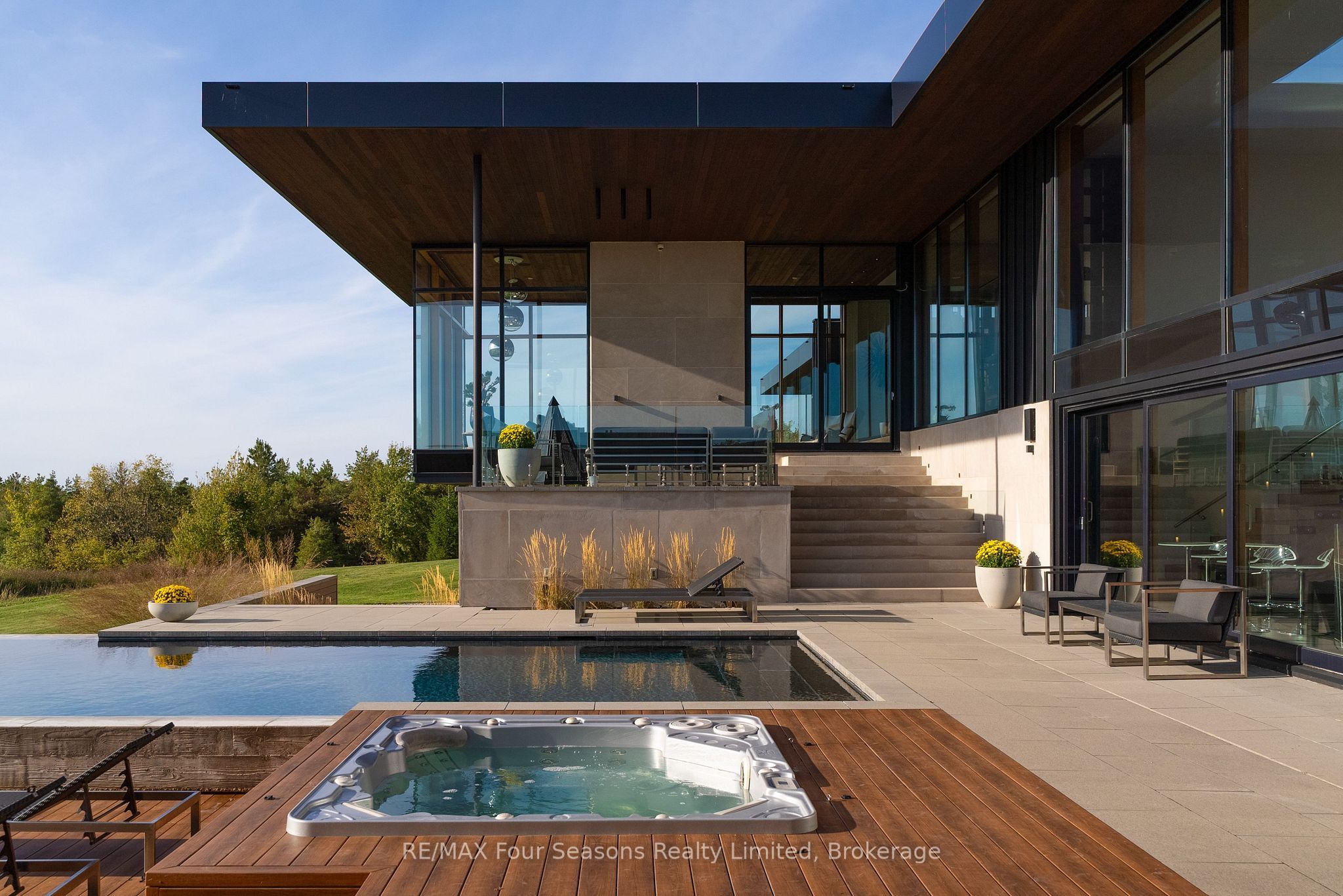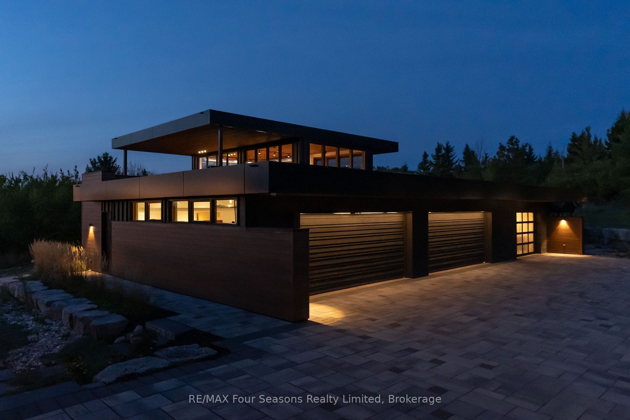 Majestically positioned upon eighty pristine acres within clarksburg's most distinguished countryside enclave, this frank lloyd wright-inspired architectural tour de force represents the pinnacle of luxury residential design. Approached through monitored gates and a winding driveway, this extraordinary five-bedroom, seven-bathroom estate exemplifies uncompromising craftsmanship, where the masterful fusion of corten steel, cedar, and metallic exterior elements creates a striking modern silhouette set against a magnificent natural backdrop, enhanced by dramatic landscape lighting that elevates the estate's grandeur through twilight hours. The palatial interior reveals soaring eighteen-foot ceilings and resplendent marble floors, culminating in an open-concept masterpiece with polished concrete flooring and 12. 5 ft. Floor-to-ceiling windows framing the serene landscape. The varenna poliform kitchen impresses with a 20. 5 ft. Island, sub-zero and wolf appliances, 11 ft. Ceilings, and bespoke walnut cabinetry that flows with architectural harmony throughout. The lavish two-storey primary suite offers polished plaster walls, custom walnut built-ins, a marble ensuite with chronotherapy rain shower, and a private retreat lounge. Additional bedrooms include terraces or balconies, with two guest suites offering luxurious ensuites-one serving as a secondary primary with service bar. Entertainment abounds with a professional theatre, custom gym, and stunning two-storey lounge bar overlooking a 22 ft. Infinity pool. A heated five-car garage and radiant flooring ensure year-round comfort. A separate two-storey guest house includes a full kitchen, loft bedroom, and soaring ceilings. A pristine barn provides premium equestrian facilities. Landscaped grounds feature a fire pit, hot tub, and pergola, all enhanced by elegant lighting. With loree forest nearby and a generac generator, this estate blends architectural brilliance with modern sophistication.