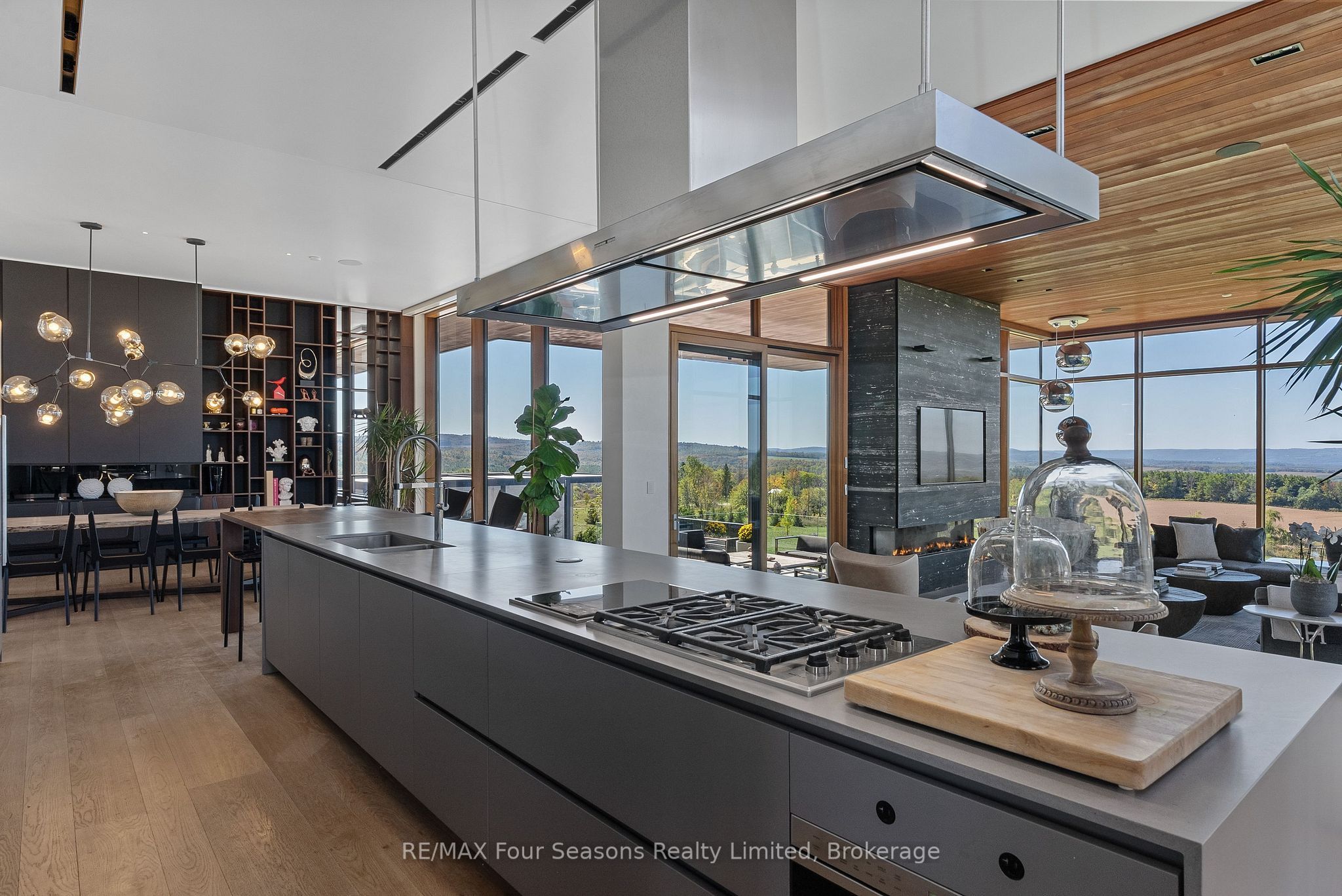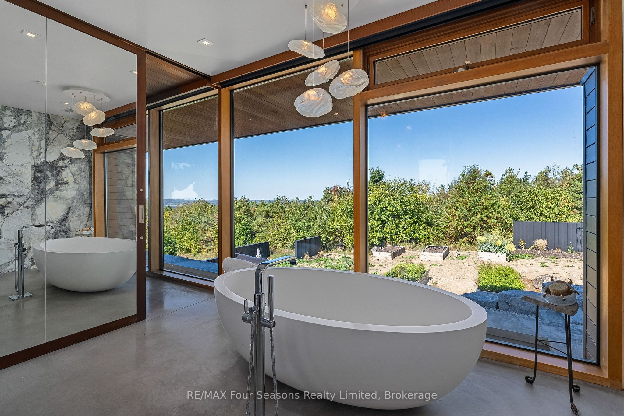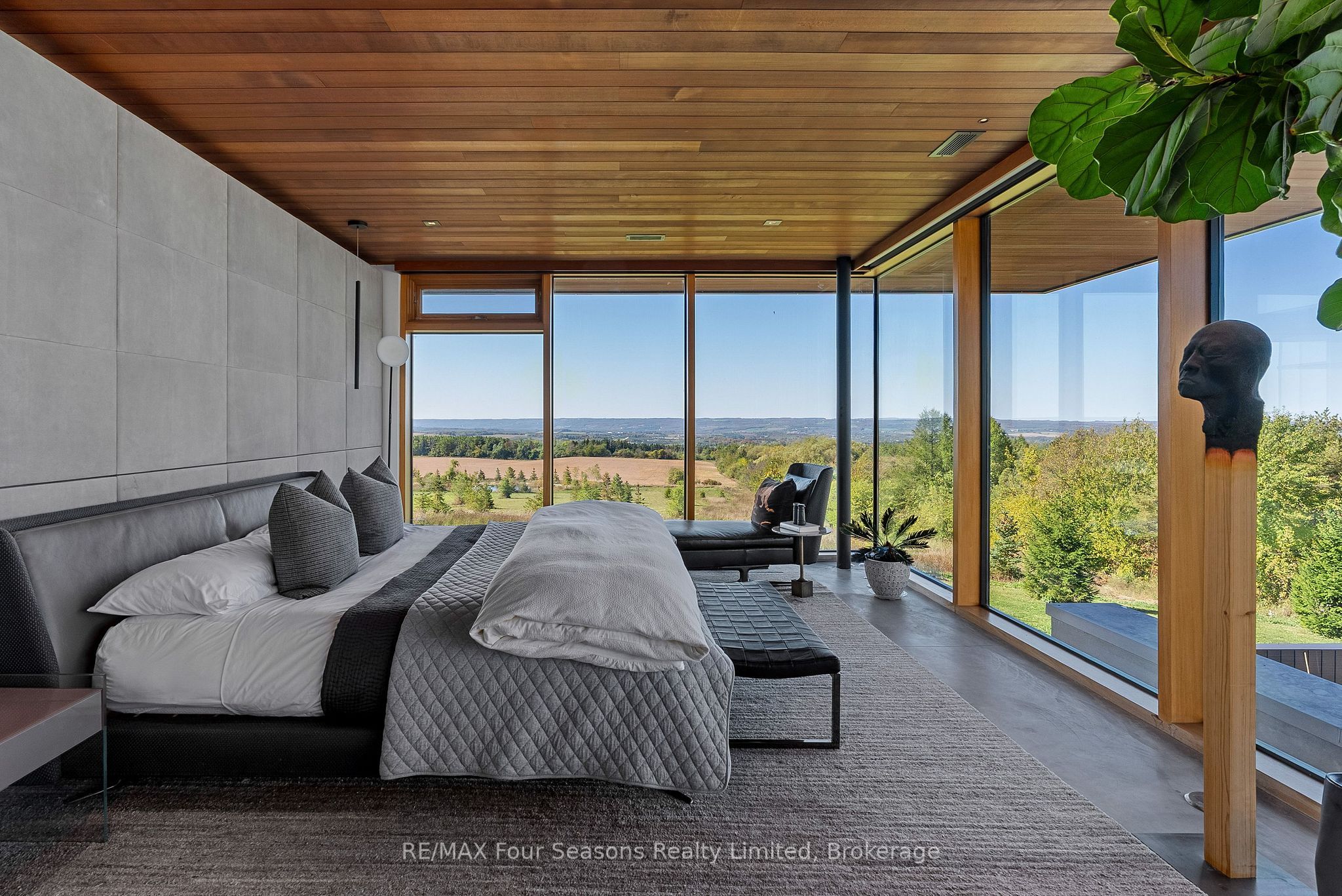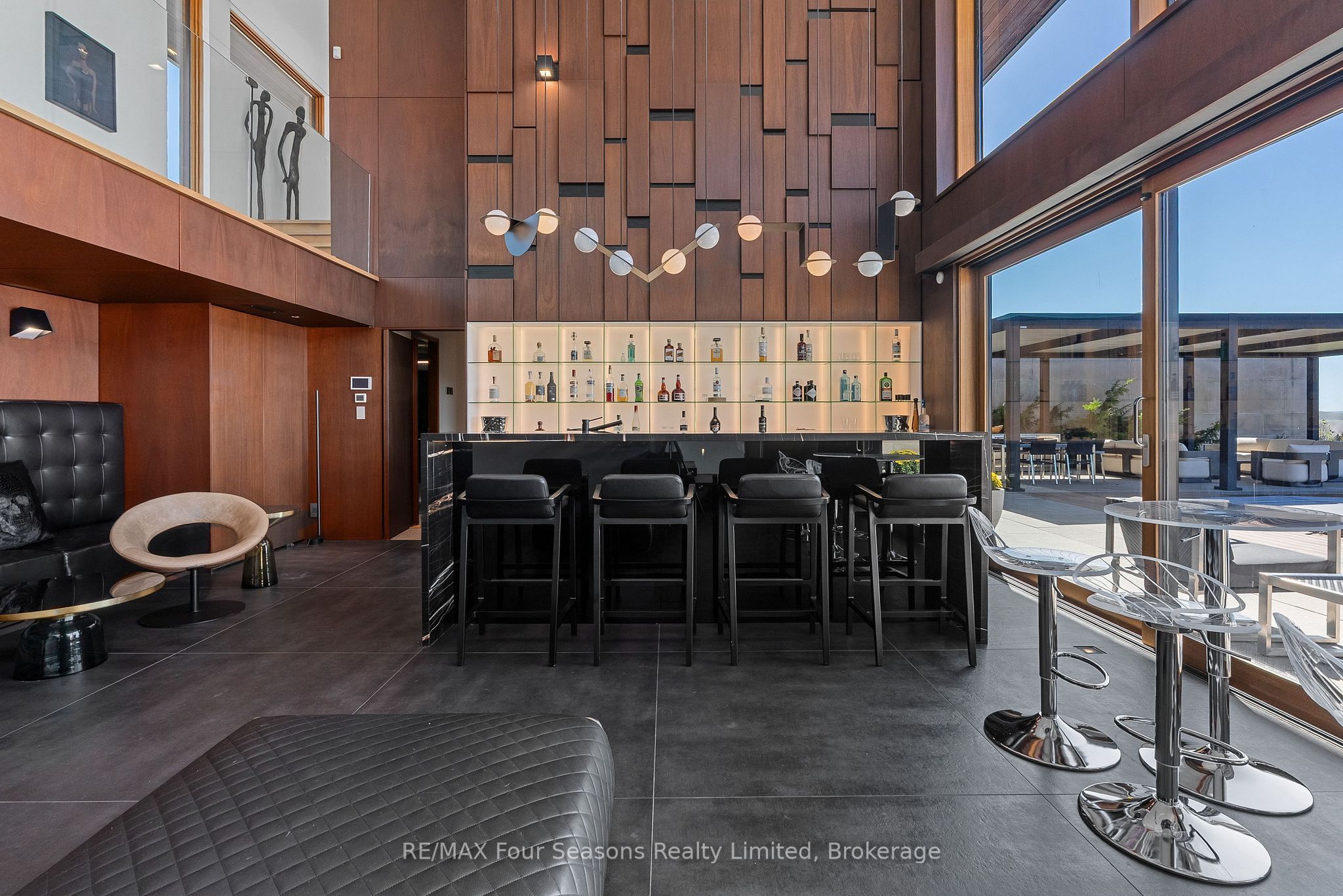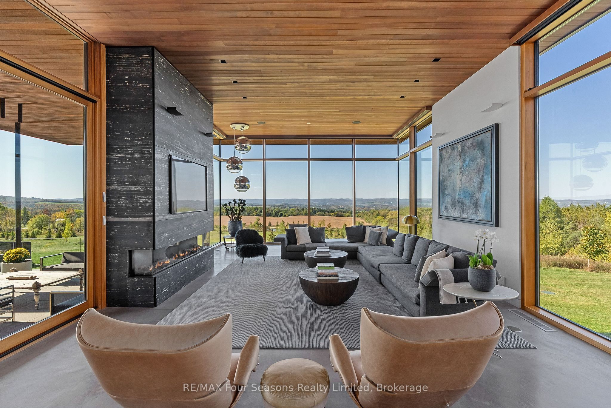 Majestically positioned upon eighty pristine acres within clarksburg's most distinguished countryside enclave, this frank lloyd wright-inspired architectural tour de force represents the pinnacle of luxury residential design. Approached through monitored gates and a winding driveway, this extraordinary five-bedroom, seven-bathroom estate exemplifies uncompromising craftsmanship, where the masterful fusion of corten steel, cedar, and metallic exterior elements creates a striking modern silhouette set against a magnificent natural backdrop, enhanced by dramatic landscape lighting that elevates the estate's grandeur through twilight hours. The palatial interior reveals soaring eighteen-foot ceilings and resplendent marble floors, culminating in an open-concept masterpiece with polished concrete flooring and 12. 5 ft. Floor-to-ceiling windows framing the serene landscape. The varenna poliform kitchen impresses with a 20. 5 ft. Island, sub-zero and wolf appliances, 11 ft. Ceilings, and bespoke walnut cabinetry that flows with architectural harmony throughout. The lavish two-storey primary suite offers polished plaster walls, custom walnut built-ins, a marble ensuite with chronotherapy rain shower, and a private retreat lounge. Additional bedrooms include terraces or balconies, with two guest suites offering luxurious ensuites-one serving as a secondary primary with service bar. Entertainment abounds with a professional theatre, custom gym, and stunning two-storey lounge bar overlooking a 22 ft. Infinity pool. A heated five-car garage and radiant flooring ensure year-round comfort. A separate two-storey guest house includes a full kitchen, loft bedroom, and soaring ceilings. A pristine barn provides premium equestrian facilities. Landscaped grounds feature a fire pit, hot tub, and pergola, all enhanced by elegant lighting. With loree forest nearby and a generac generator, this estate blends architectural brilliance with modern sophistication.