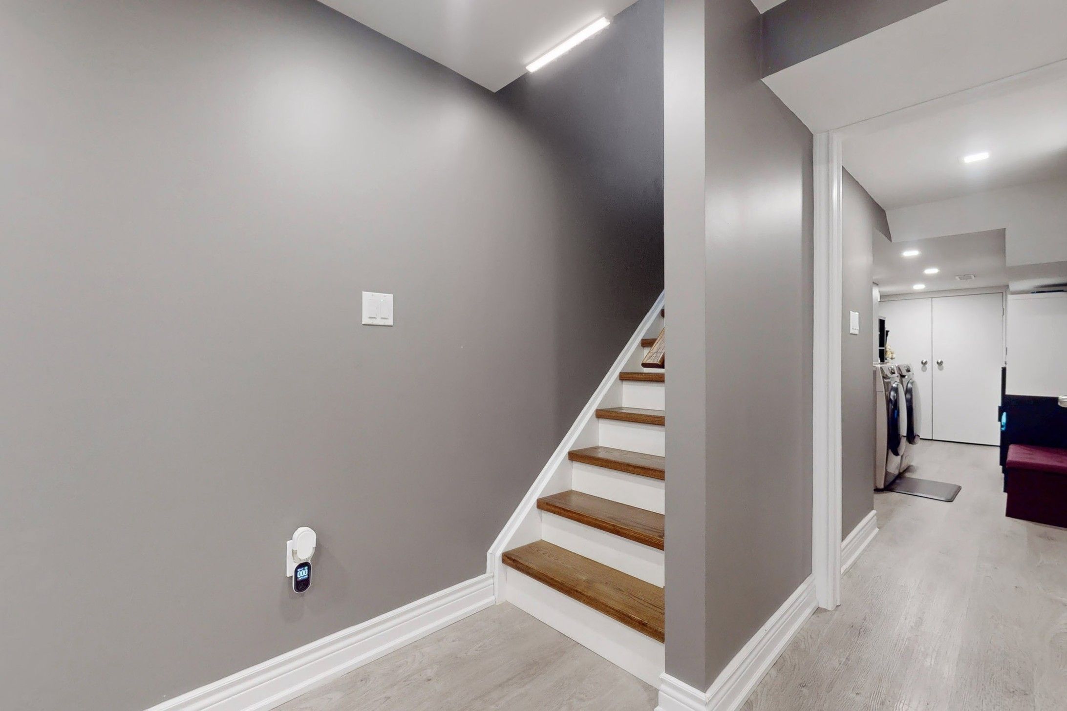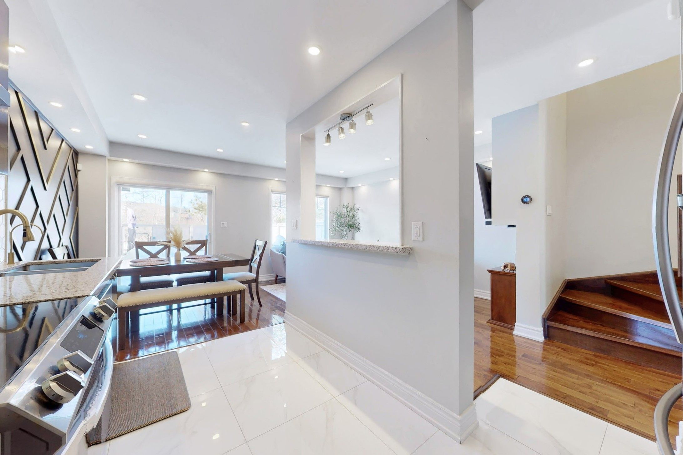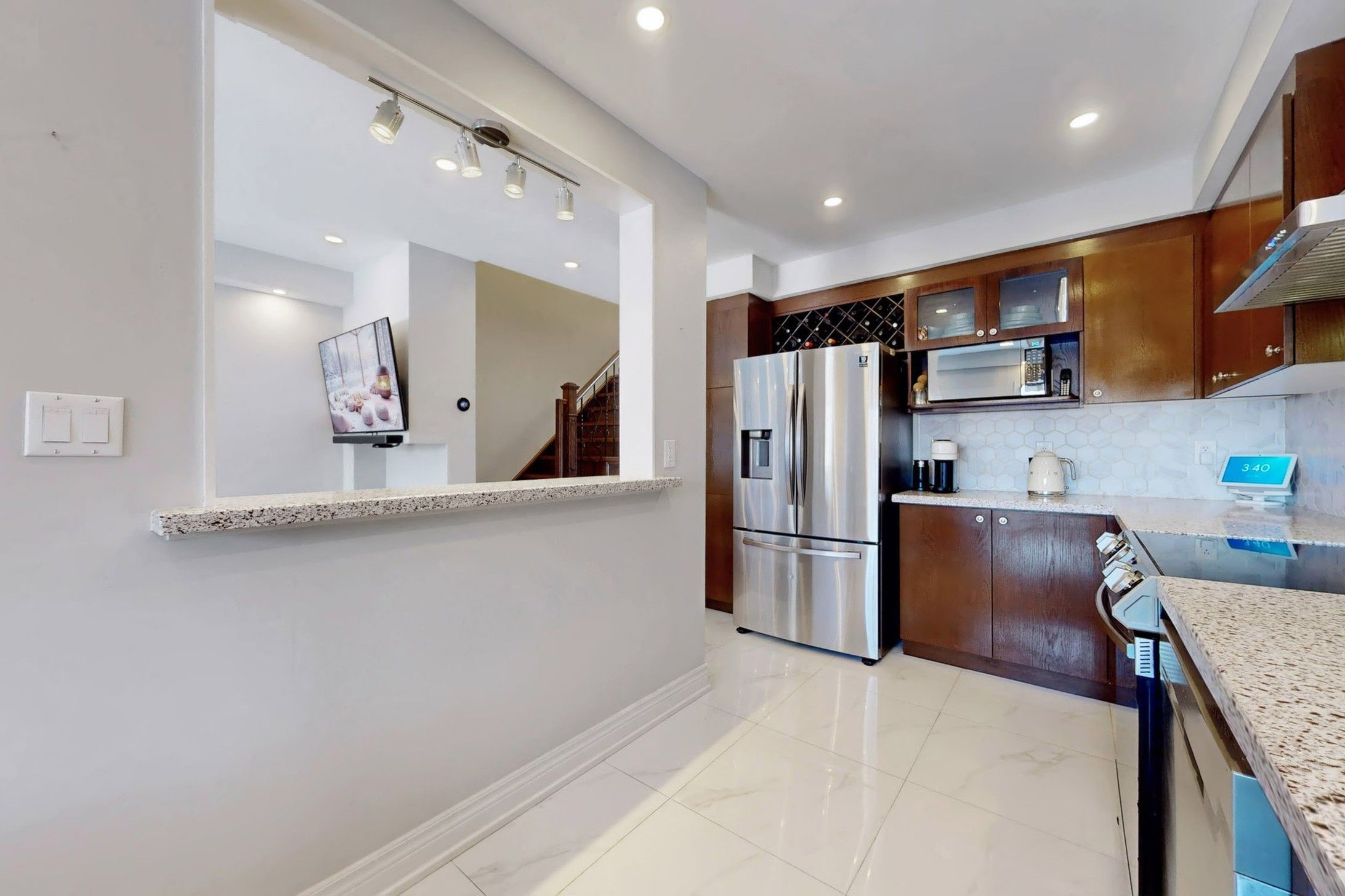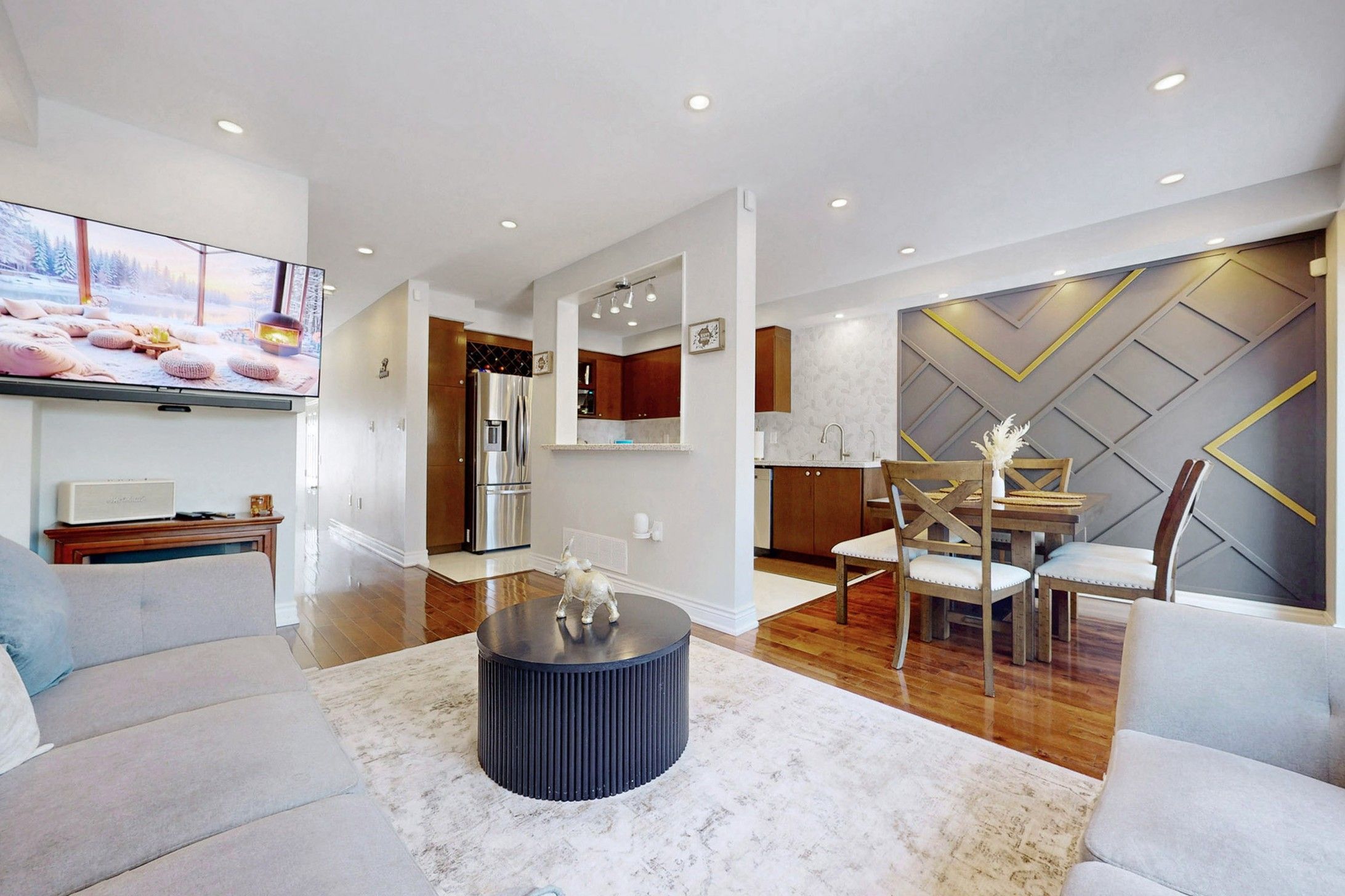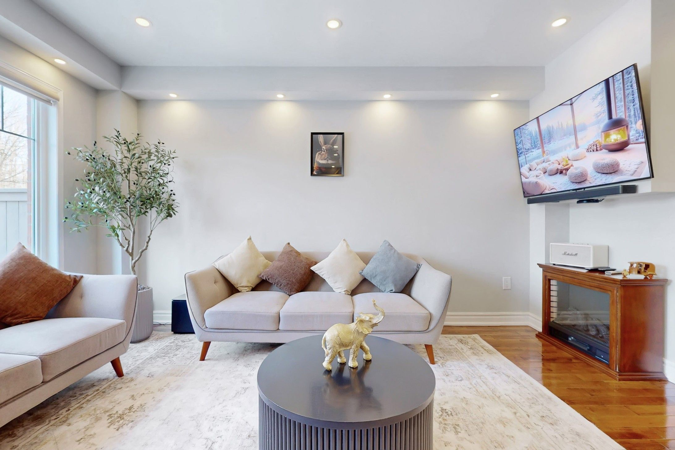 Welcome to this stunning upgraded 3 bedrm freehold smarttownhome in highly dedirable stouffville! Boasting over 1,700 sqft of thoughtfully designed living space with no rear neighbours! Backing onto conservation/ravine with private gate access to greenspace and trails. This beautifully fully renovated home features a high-end upgrades with a new front entry door, contemporary garage door, elegant granite porch and step, and a bright open-concept layout with upgraded porcelain tile flooring, exquisite chief's gourmet kitchen with cabinetry, quartz countertops, stylish backsplash, ss appliances, and breakfast area complete with accent wall and walk out to fully landscaped and fenced backyard overlooking serene greenspace. Cozy living room with fireplace. Hardwood floors and pot lights throught out. Upgraded oak staircase with wrought iron spindles. Master bedroom features bay window, a walk-in closet and a 4-piece ensuite. Two additional bedrooms are well-sized and share a second 4-piece bathroom. Finished basement with spacious rec room, 4pc bath and stylish built-in bar, perfect for entertaining. Additional highlights include garage acess, ev outlet, smart thermostat, upgraded switches, fully interlocked front and back yard, 3-car driveway with no sidewalk. Minutes to main st, 404, 407, schools and stouffville go station. An exceptional opportunity not to be missed.