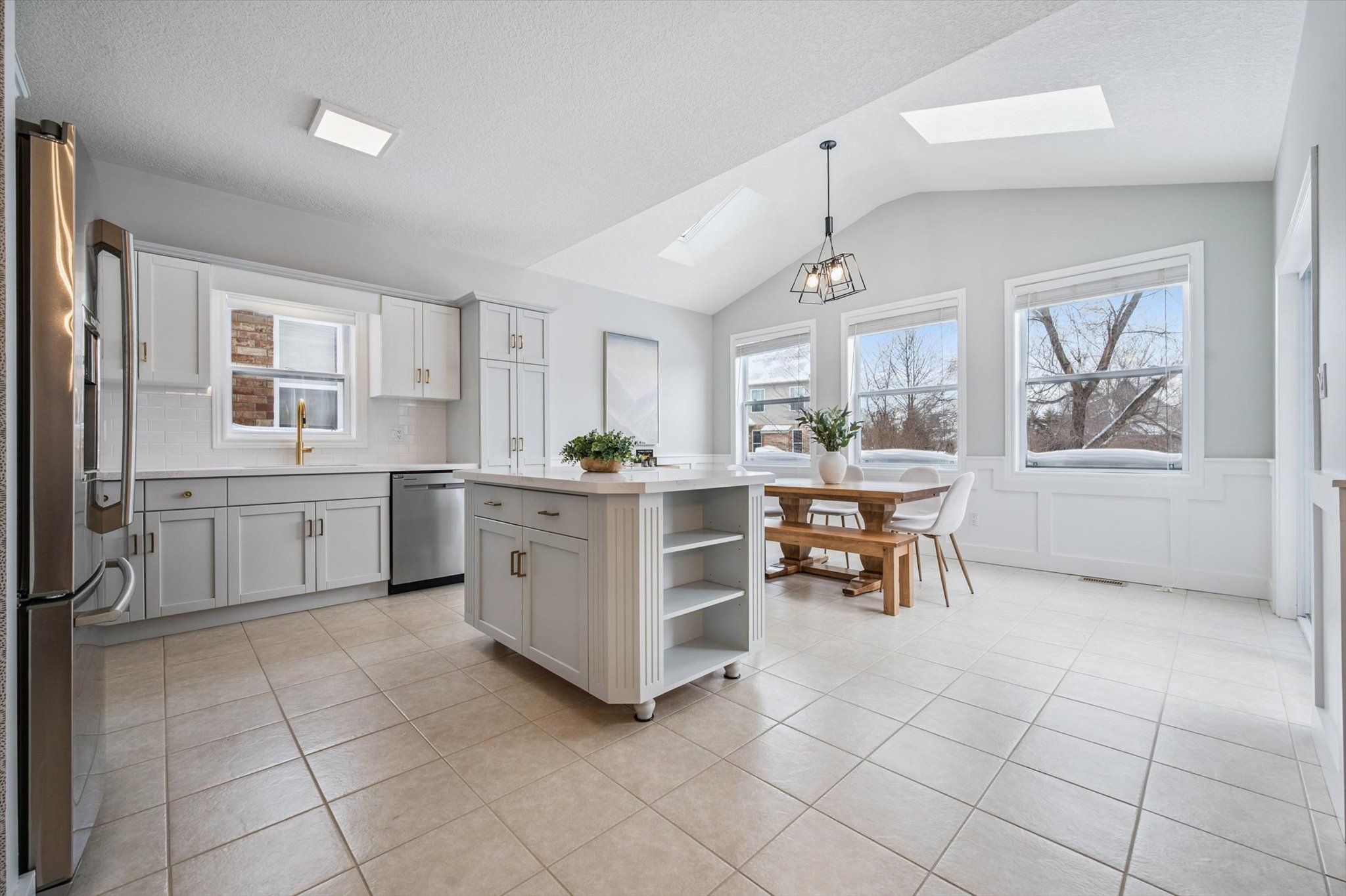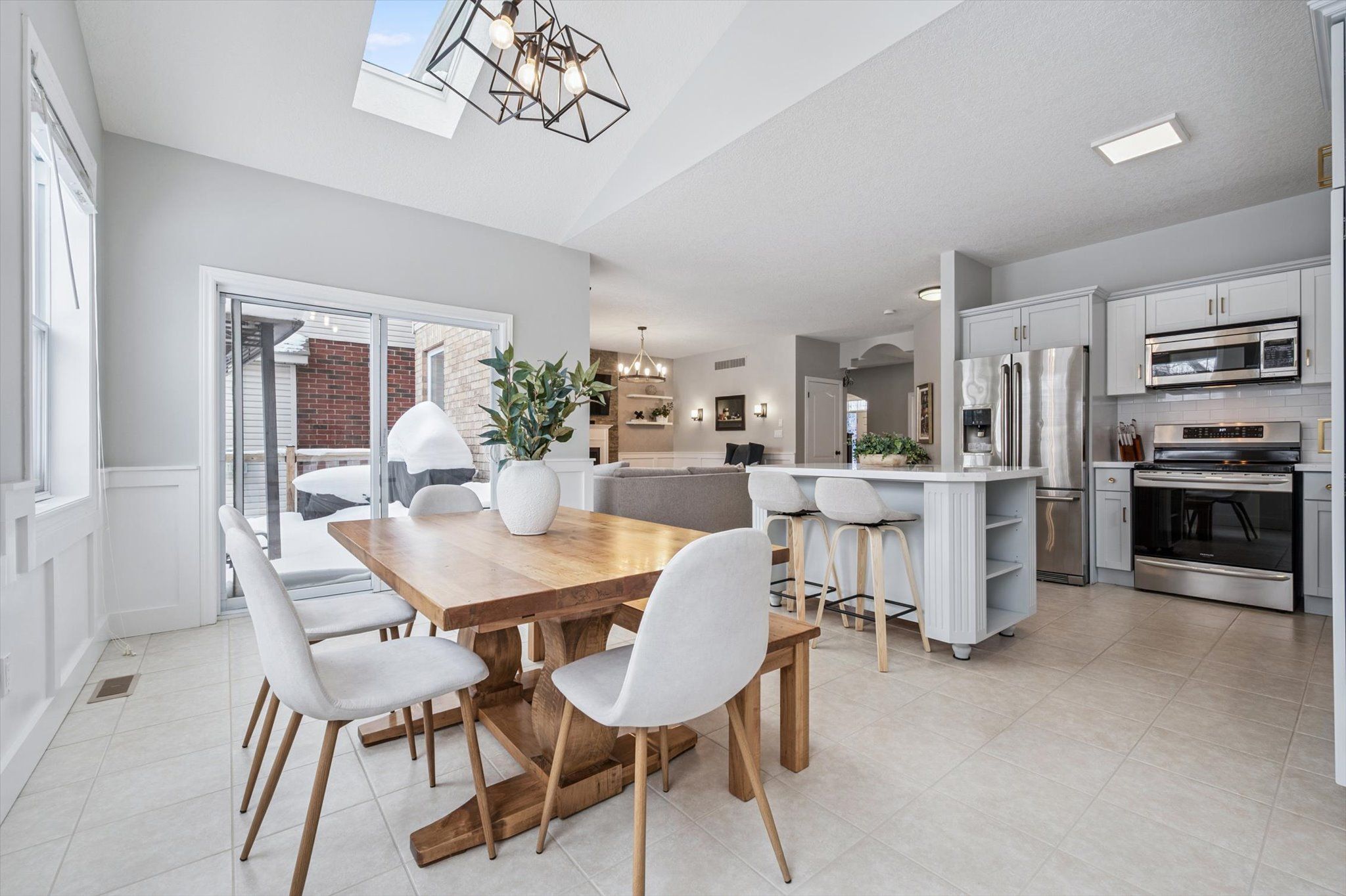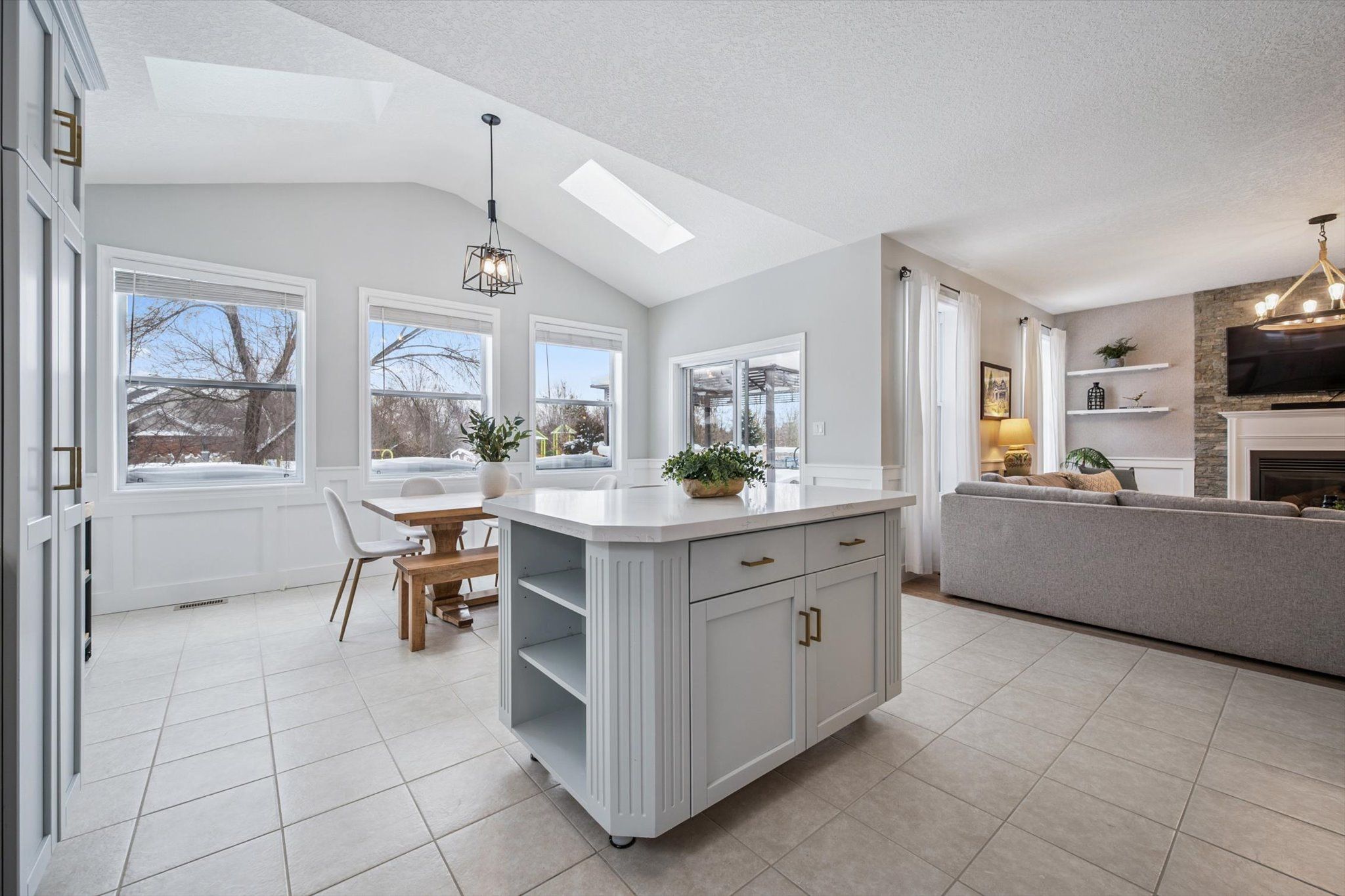 • Bright open-concept living area with vaulted ceilings and skylight.