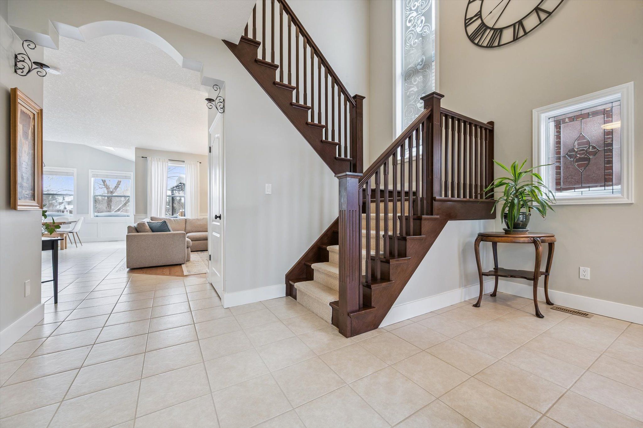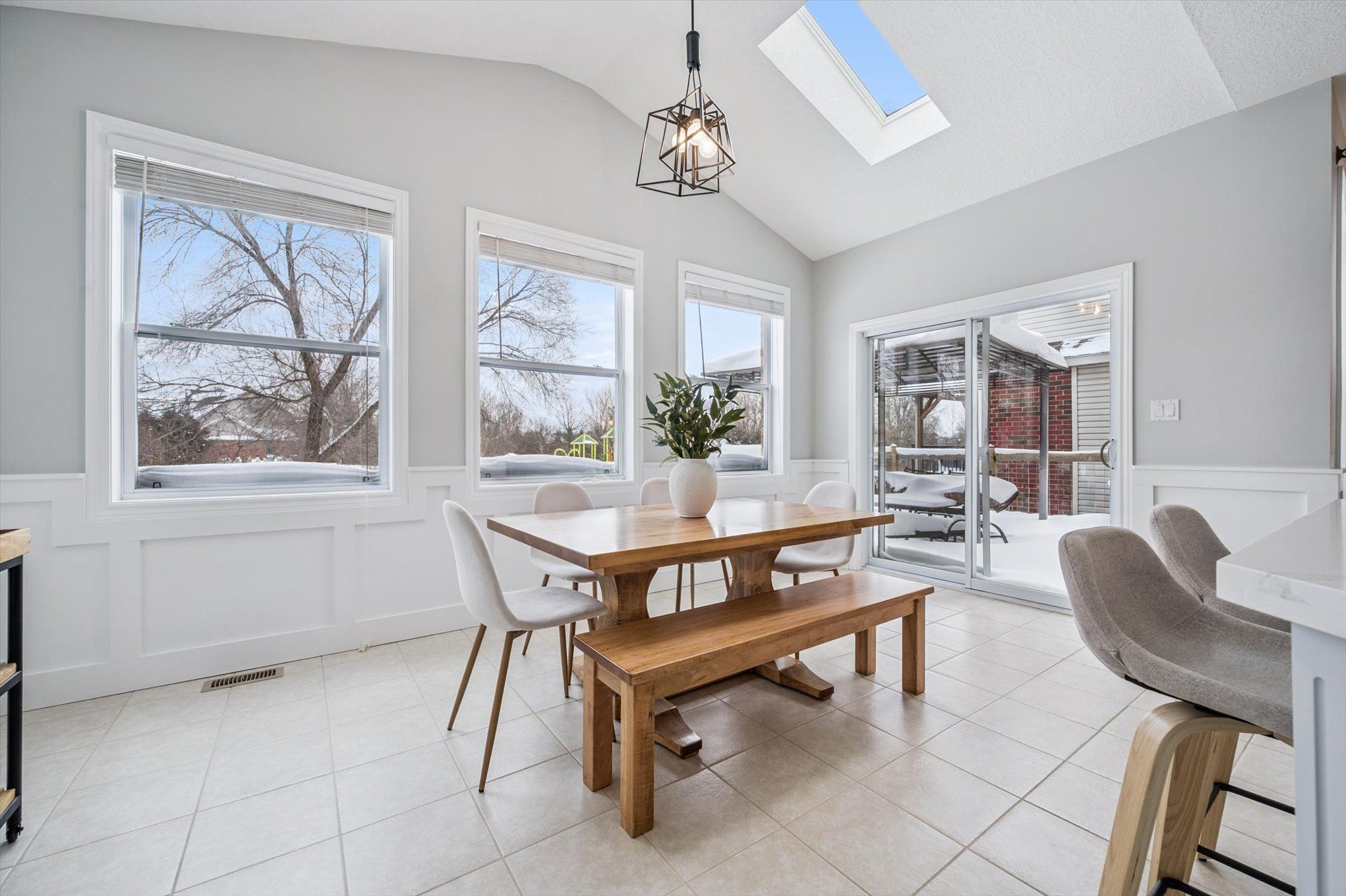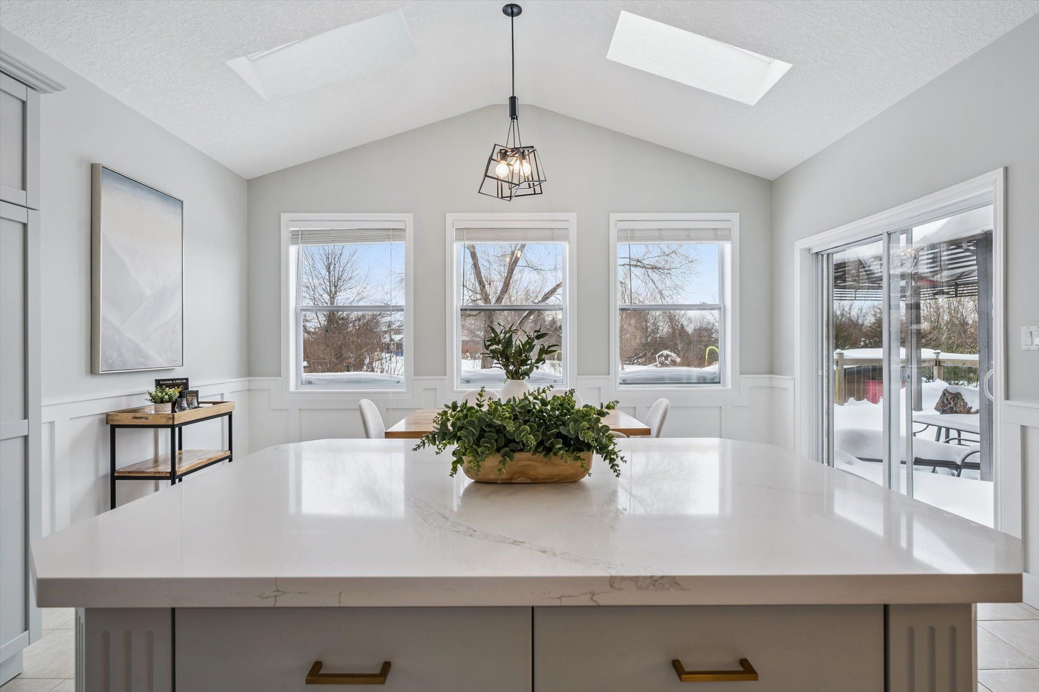 • Bright open-concept living area with vaulted ceilings and skylight.