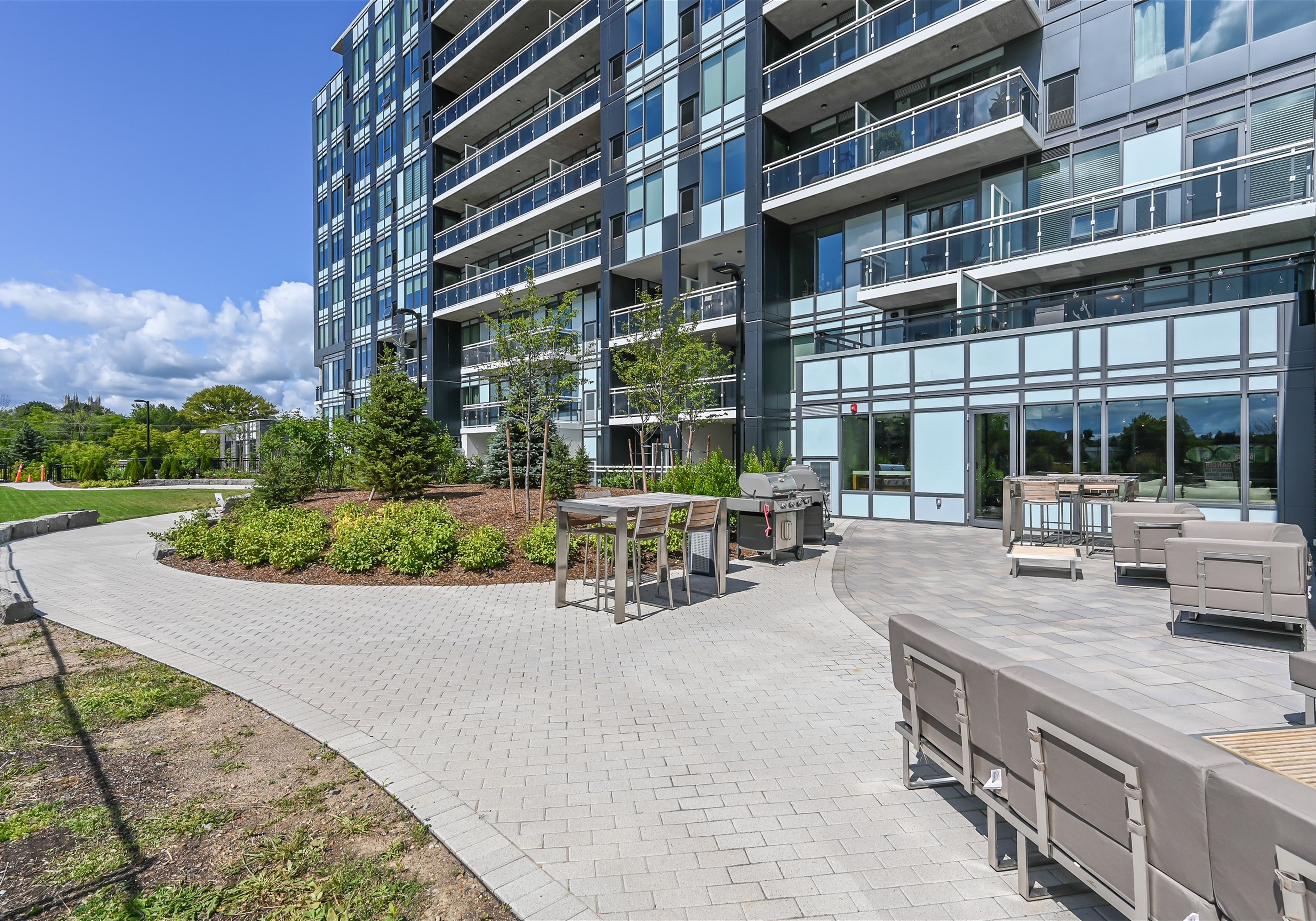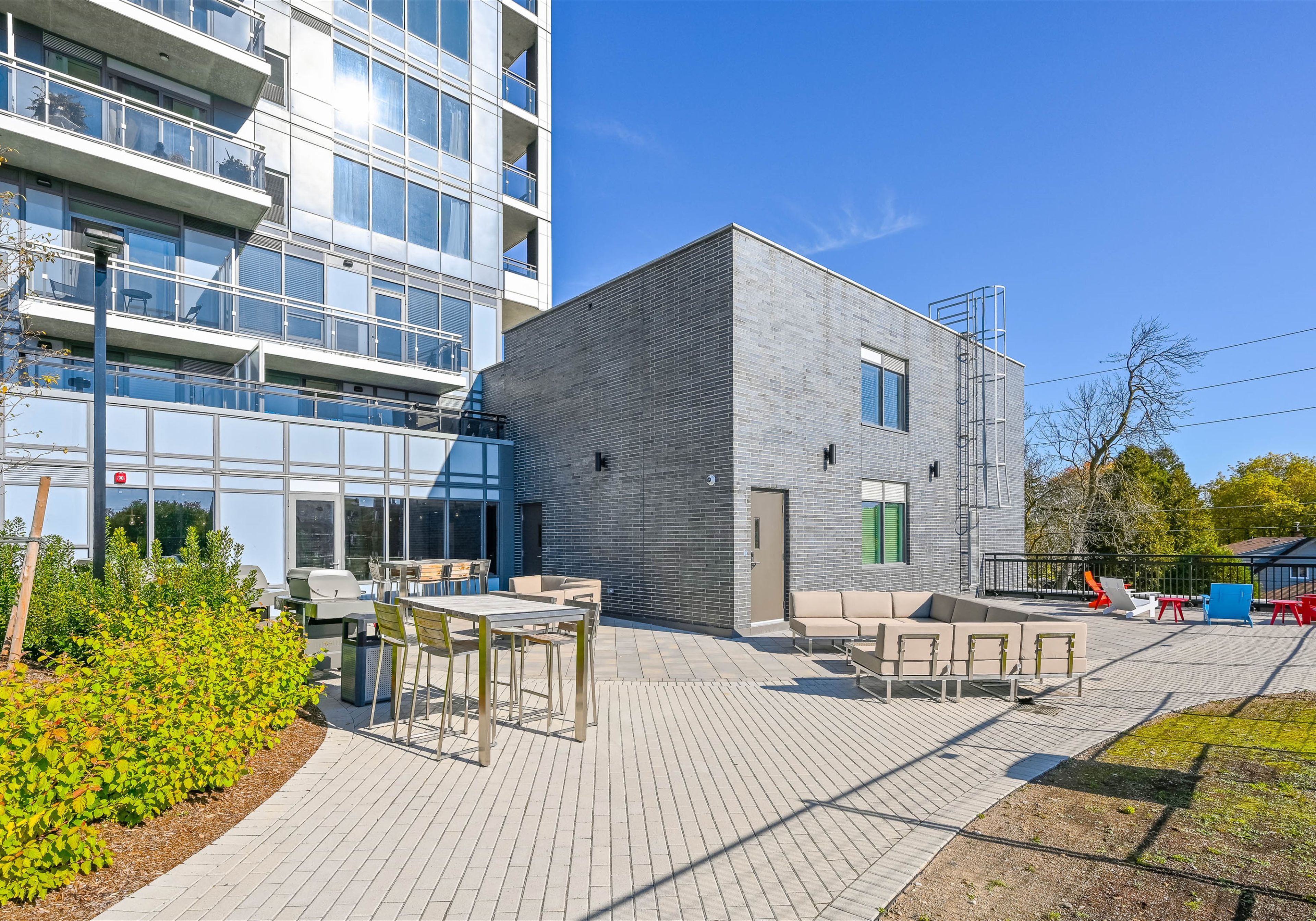 • Private patio with views of the river, courtyard, and downtown.