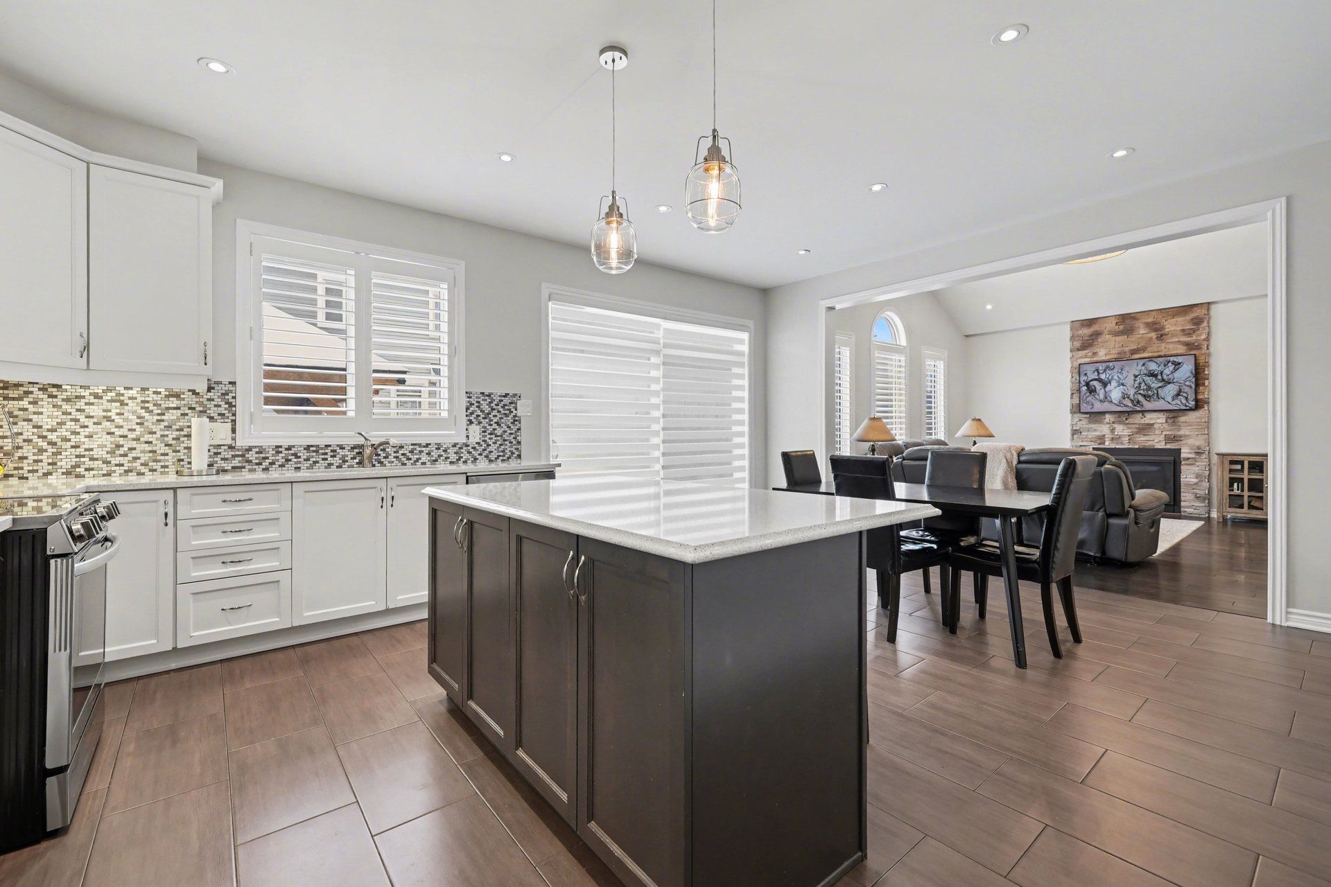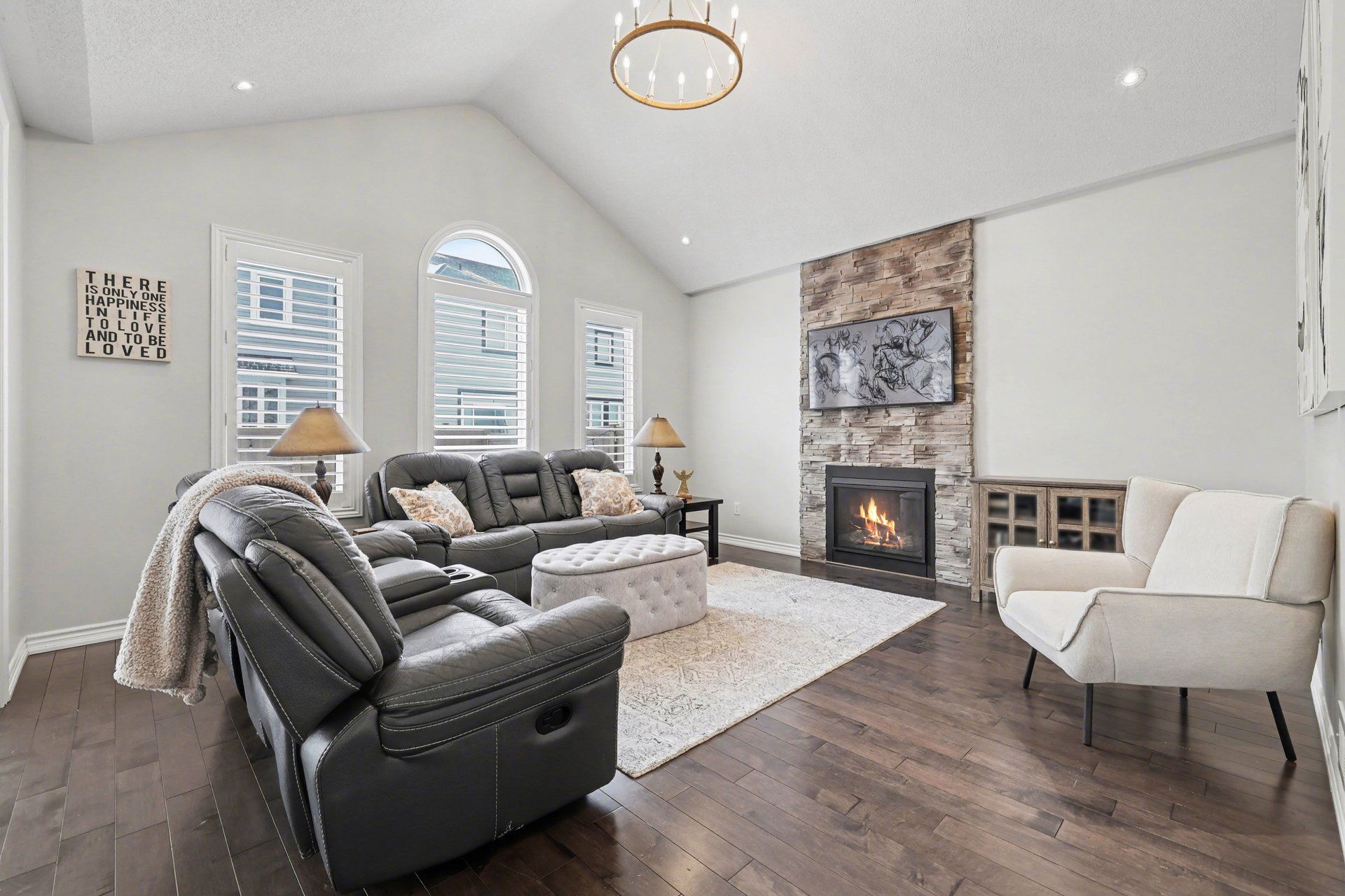 • Cozy family room with a stunning floor-to-ceiling stone fireplace.