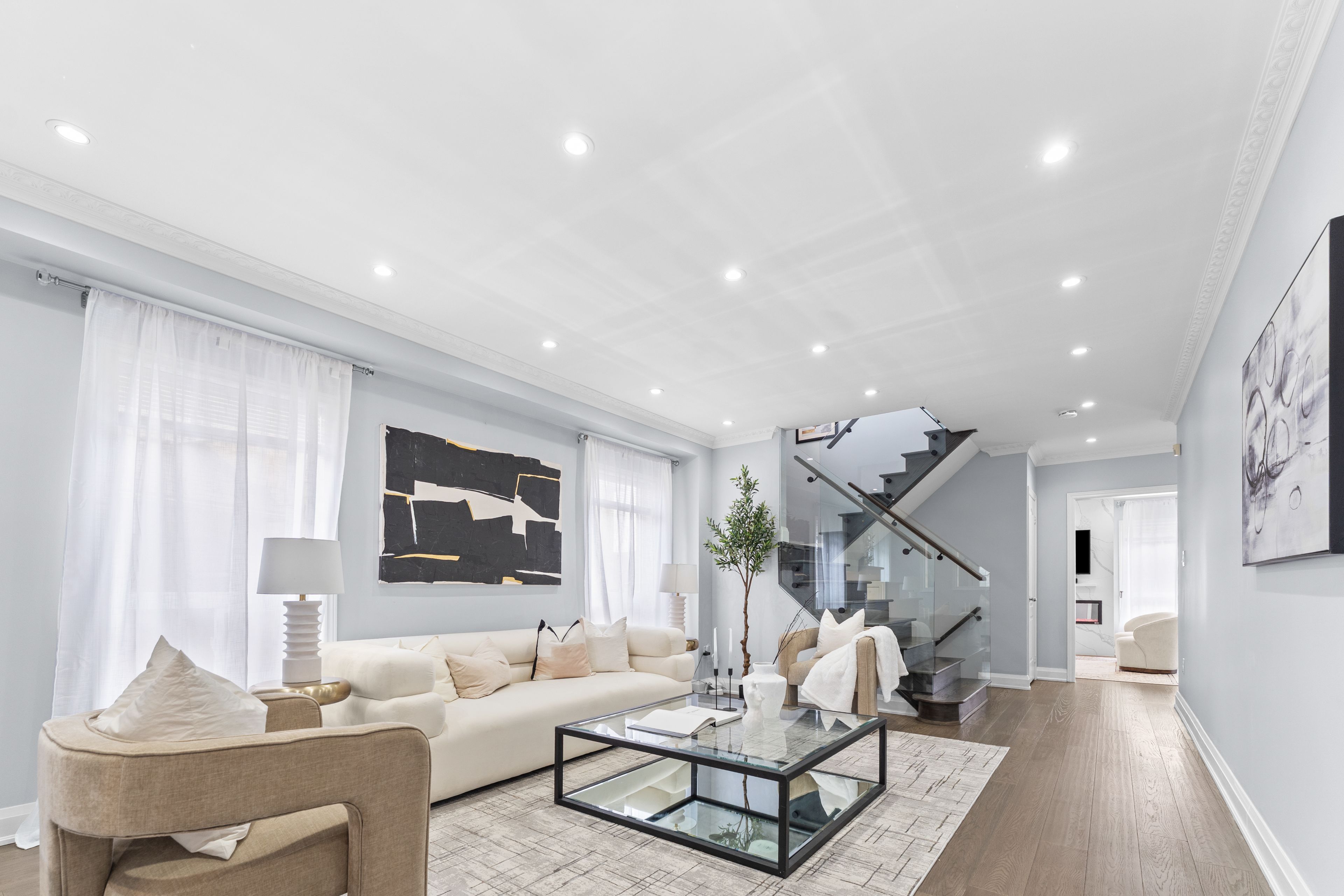 • New hardwood flooring and modern glass railings add a fresh touch.