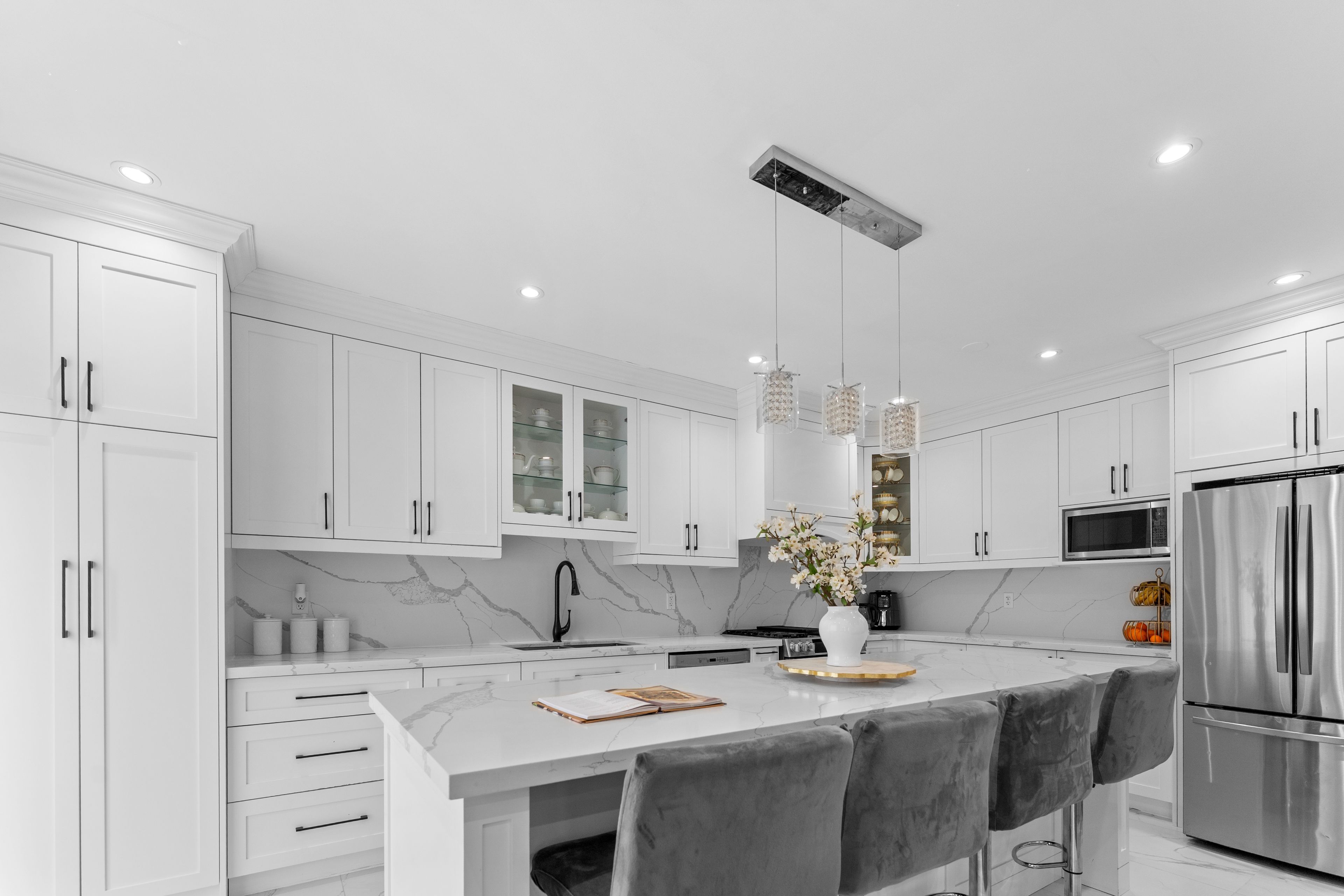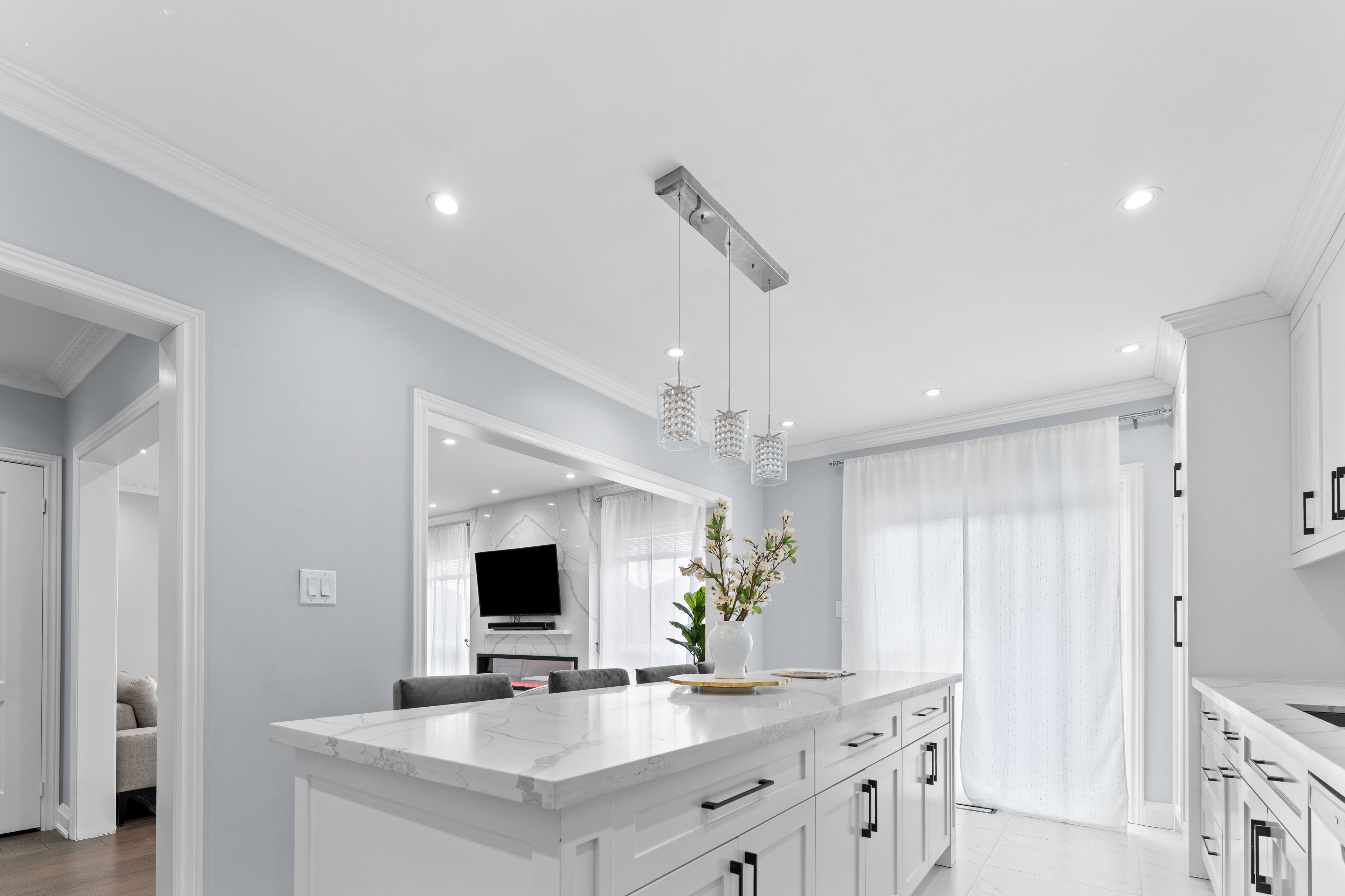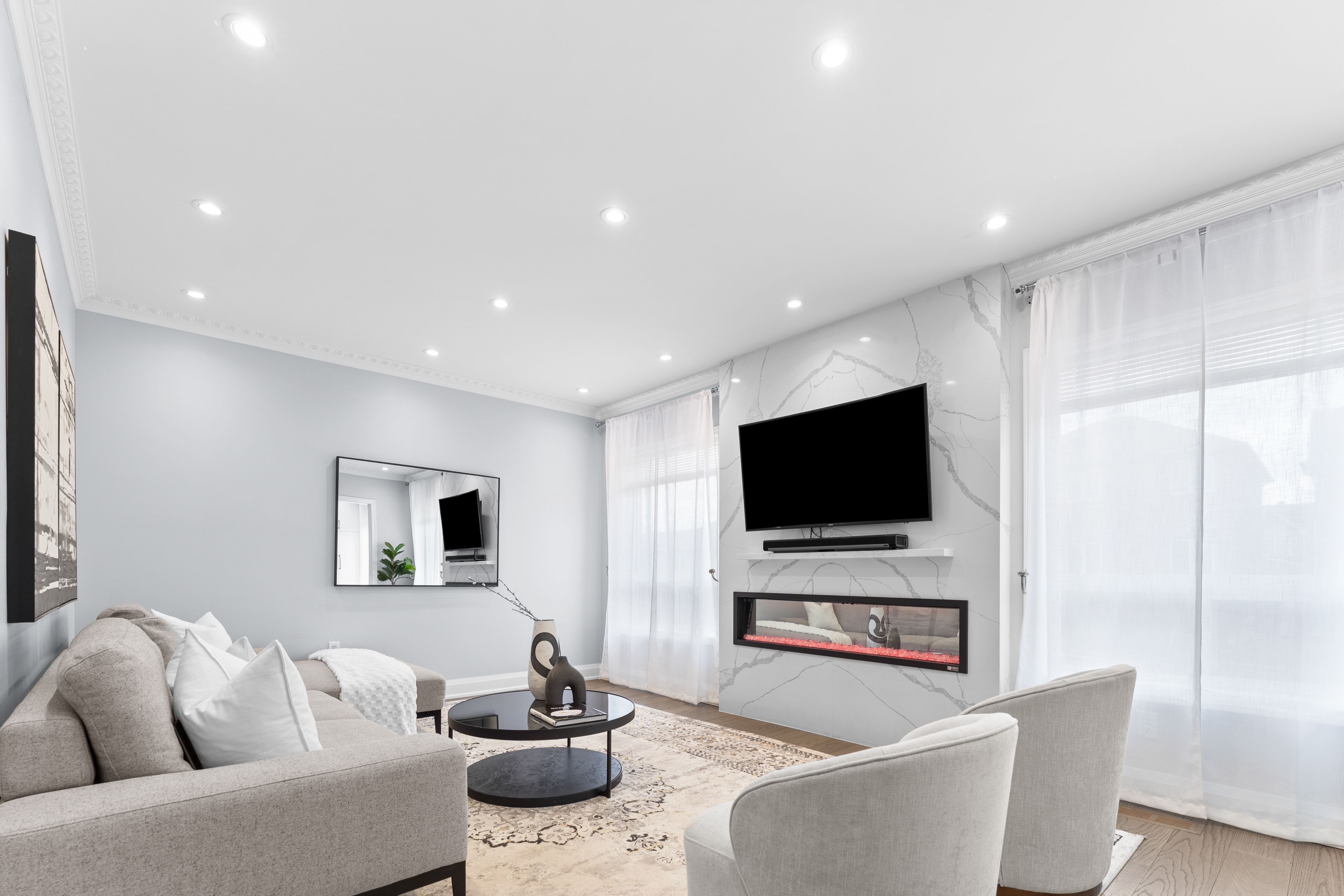 • Custom fireplace with quartz surround creates a striking focal point.