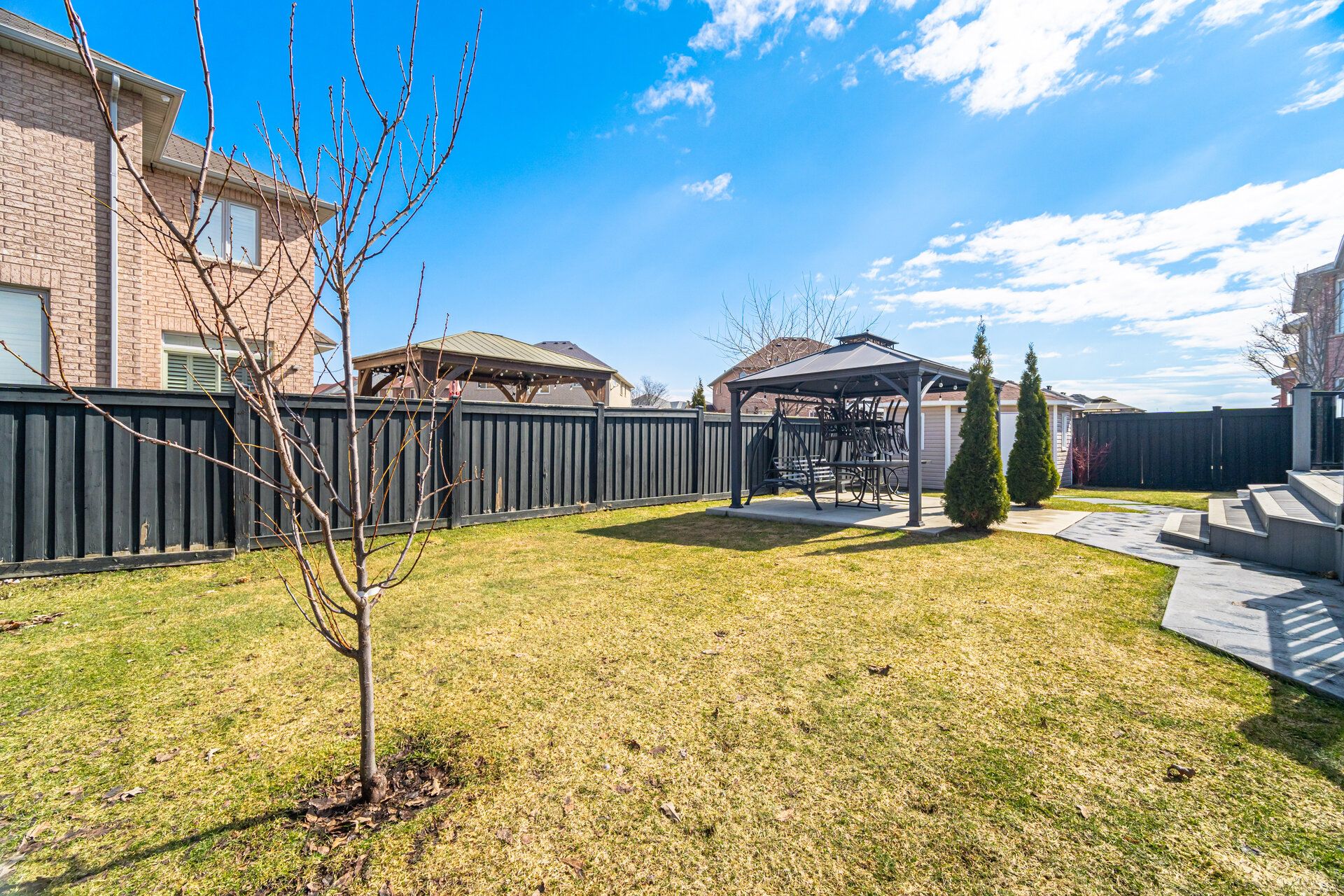 Luxury 3,338 sq. Ft. Home on a premium merged lot in prime brampton location! Beautifully upgraded residence situated on a premium lot formed by merging two lots, offering enhanced outdoor space, privacy, and curb appeal. Boasting $$$ in upgrades, the exterior features exposed aggregate and stamped concrete, a glass-railing porch, designer entry, and modern garage doors. Enjoy 5-ft side clearances with stamped walkways and a full professional sprinkler system. Outdoor living is elevated by a custom-built deck and an integrated gourmet kitchen with a direct natural gas bbq line. This elite space further features a large gazebo set on a stamped concrete floor alongside a specialized concrete-floor storage shed with an asphalt shingle roof. Inside, a raised ceiling foyer and curved architectural staircase create a strong first impression. The home offers 4 bedrooms, 3 full bathrooms upstairs, and a large upper-level den. The primary suite includes a walk-in closet and private ensuite, while a second bedroom features semi-ensuite access, with two additional bedrooms sharing a full bath. Interior highlights include smooth ceilings, plaster moulding on the main floor, crown moulding throughout, hardwood flooring, boxed pot lights, and designer feature walls, along with california shutters, zebra blinds, and tinted front windows. Convenient main floor laundry. The kitchen features high-end wood cabinetry, a matching pantry, granite surfaces, and a canadian-made island range hood (950 cfm) with high-velocity ventilation. An expansive unspoiled basement with a large open layout, cold room, and enclosed storage space offers excellent future potential. Additional features include a 200 amp panel, 360 8-camera security system, high-efficiency furnace (2025), owned water heaters, and an upgraded city water line (approx. 10k) designed to support future basement development or a secondary suite.
