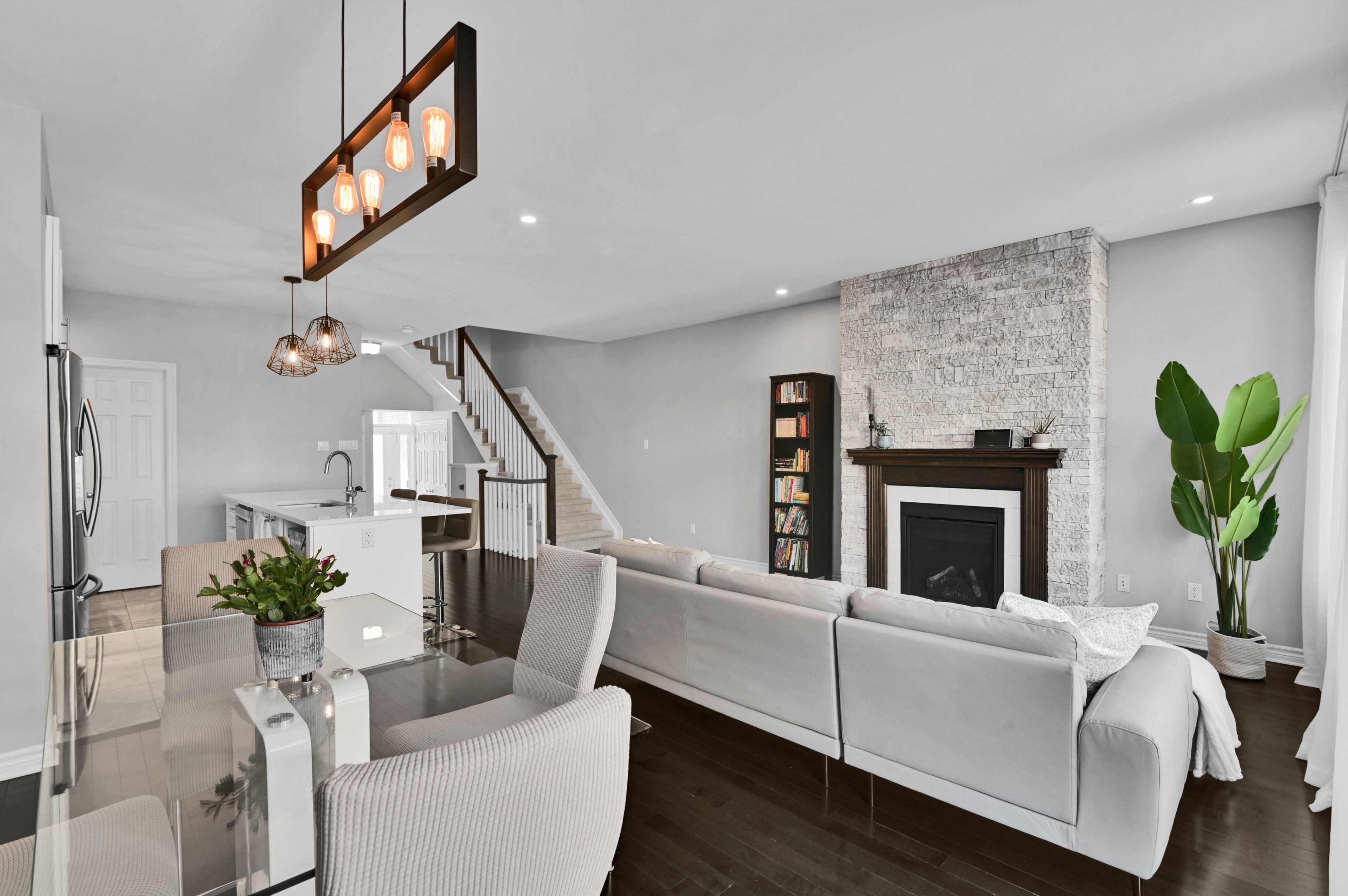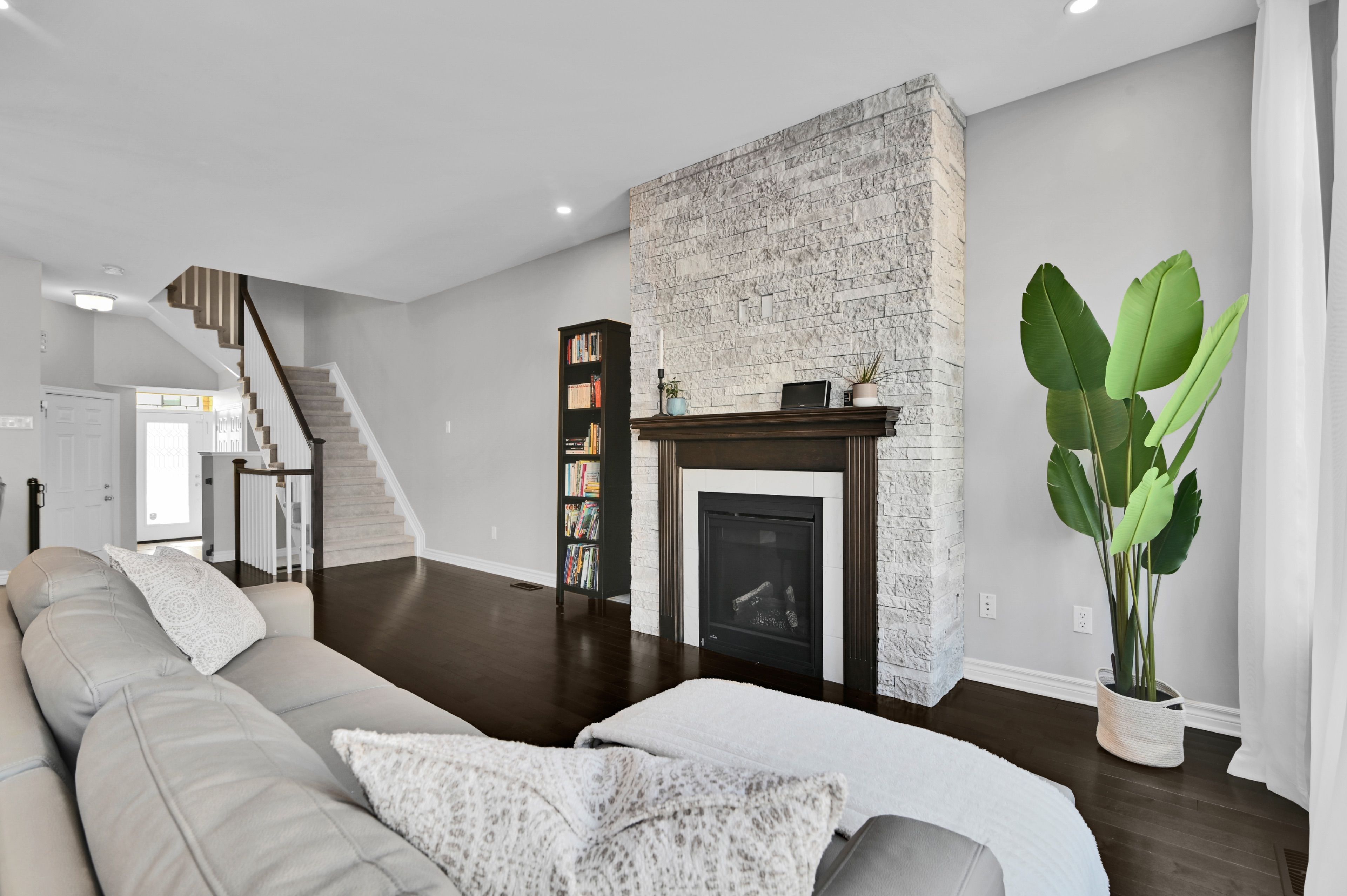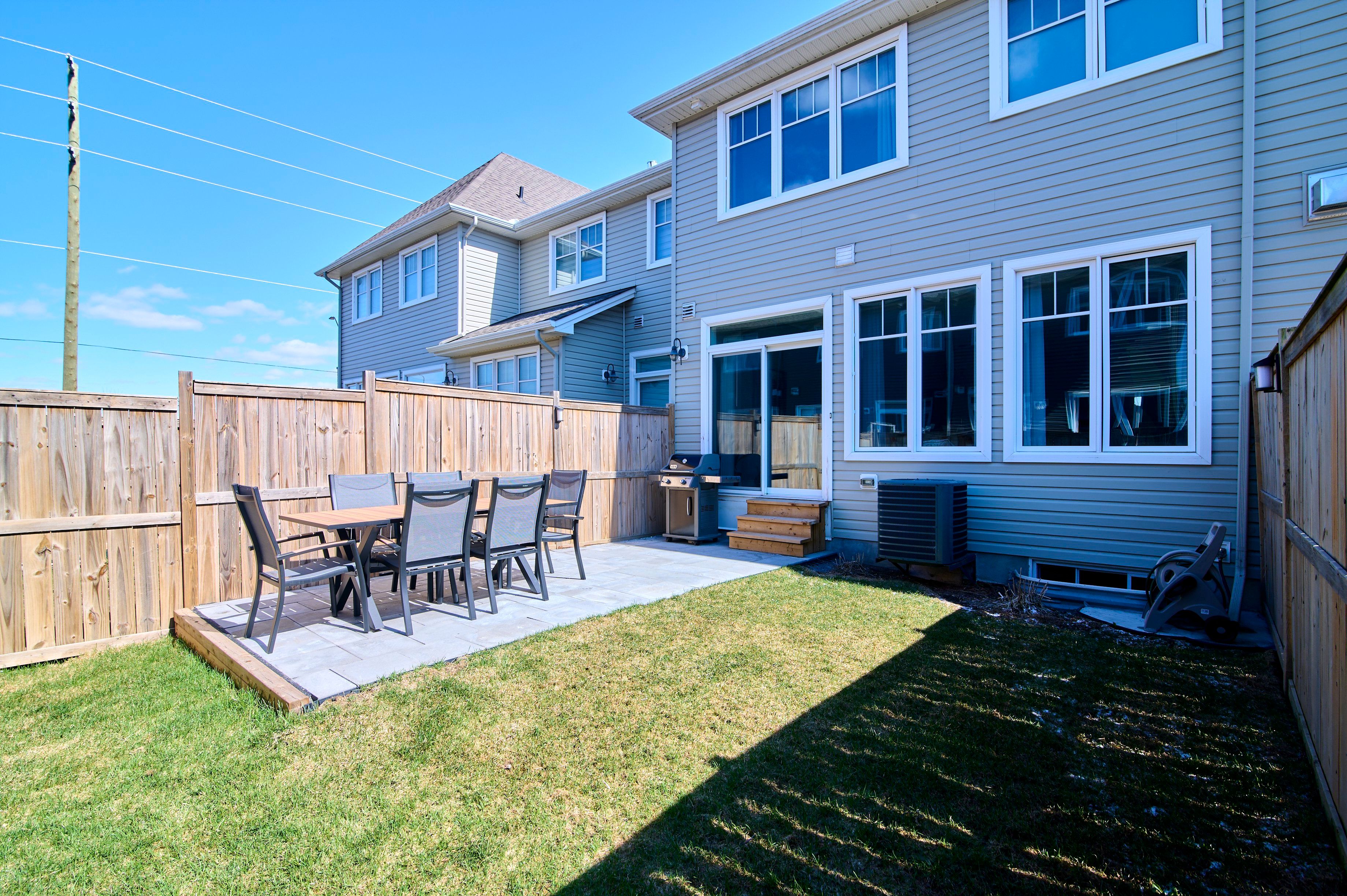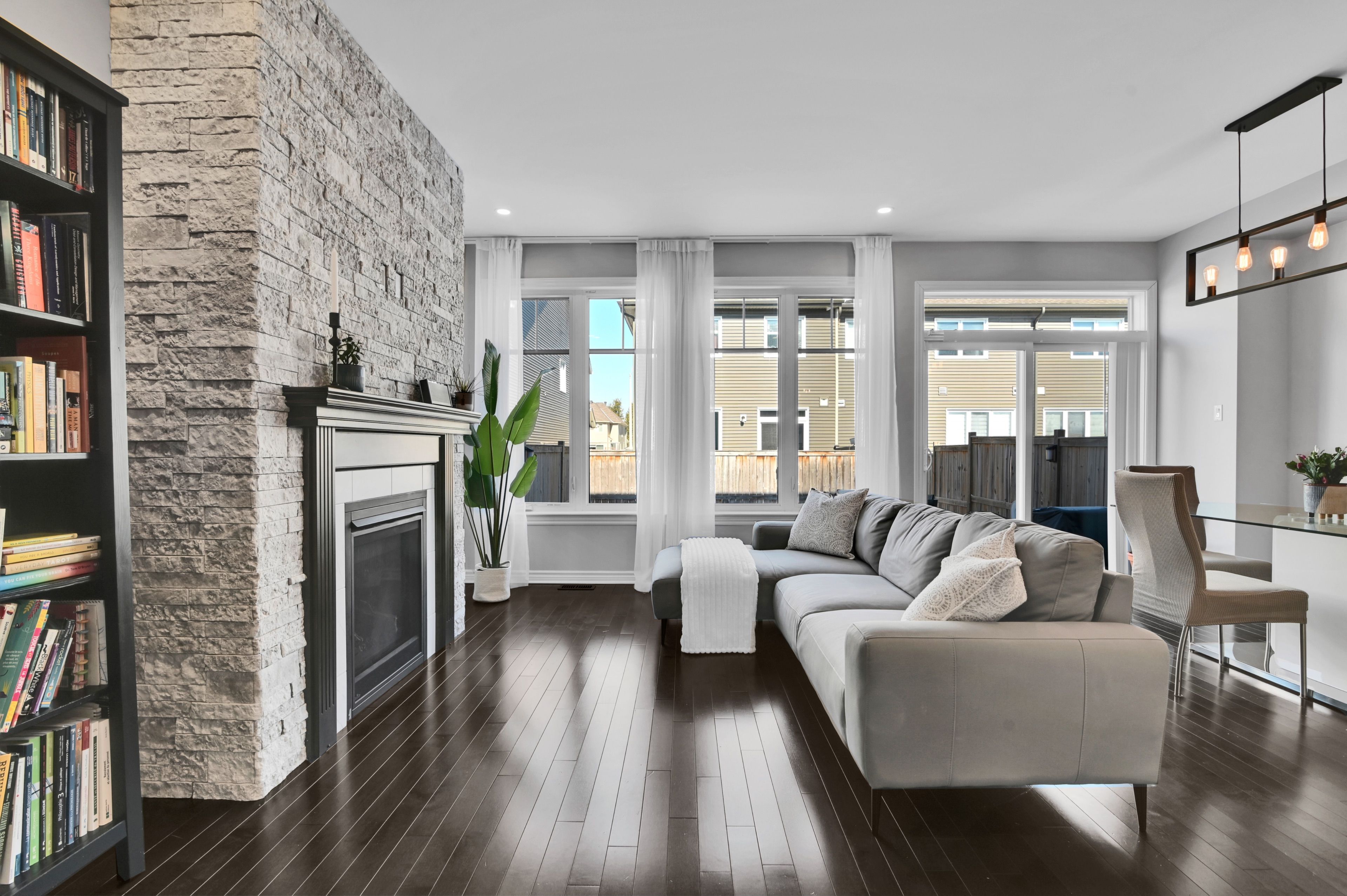 Welcome to this beautifully appointed chelsea model townhome by tamarack, offering an exceptional blend of space, style, and functionality. The main level impresses with soaring 9-foot ceilings and stunning hardwood floors that flow seamlessly throughout. The modern kitchen is designed for both everyday living and entertaining, featuring stainless steel appliances, a large island with granite counters, and large pantry for ample storage. The inviting living room is anchored by a striking gas fireplace with a stone tile surround and elegant mantle - perfect for cozy evenings at home. Upstairs, you'll find three generously sized bedrooms, including a spacious primary retreat complete with his and hers walk-in closets and a modern 4-piece ensuite with glass shower. The convenience of second-floor laundry and an additional full bathroom enhances the home's practical layout. The fully finished lower level offers a versatile rec room ideal for a home theatre, gym, or play space, while still having space for a potential home office and plenty of additional storage. Step outside to enjoy the fully fenced backyard, featuring a beautifully finished interlock patio completed last year - perfect for outdoor dining and relaxation. This thoughtfully designed home delivers outstanding square footage in one of tamarack's most sought-after layouts - ideal for families and professionals alike.