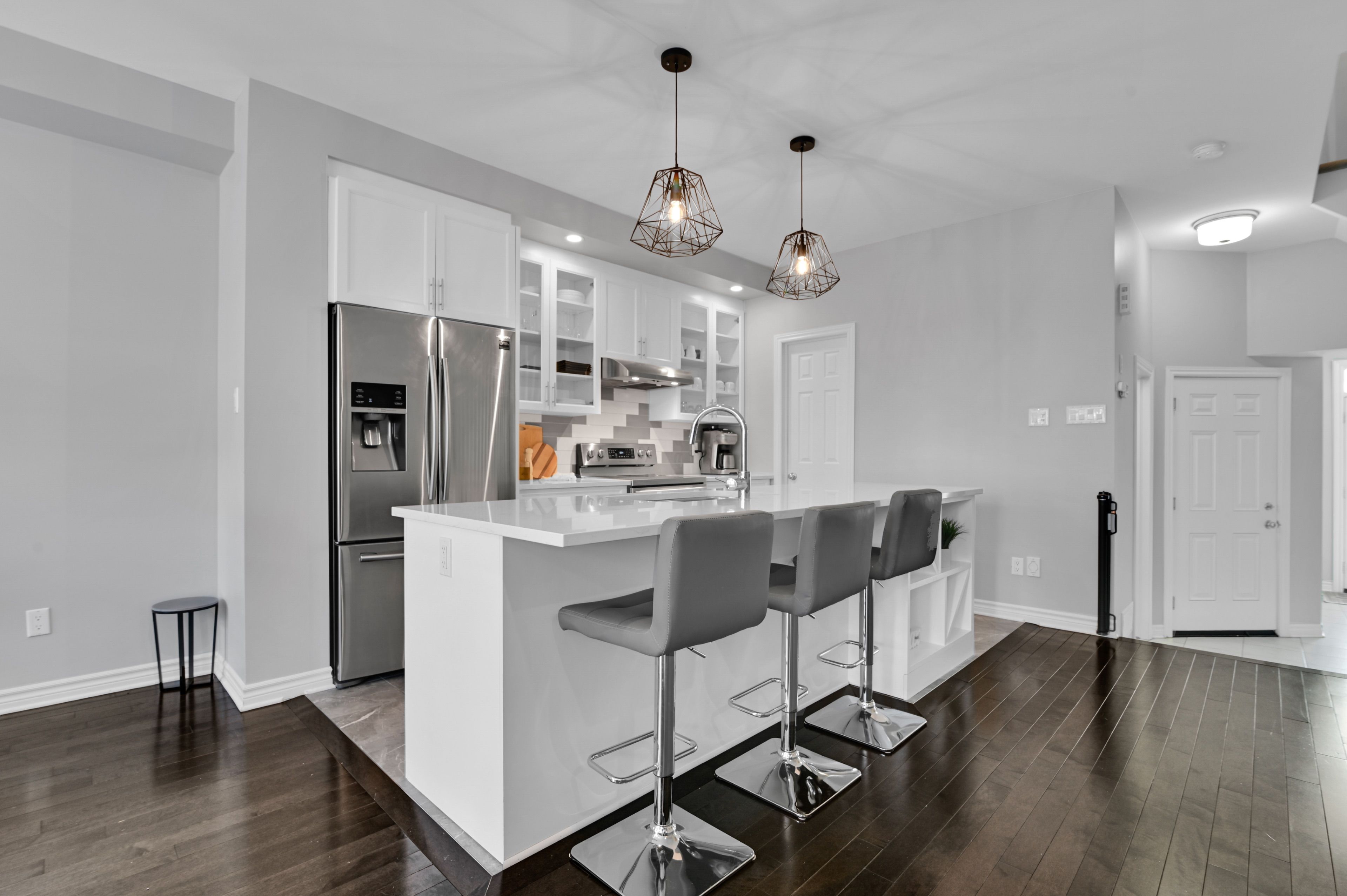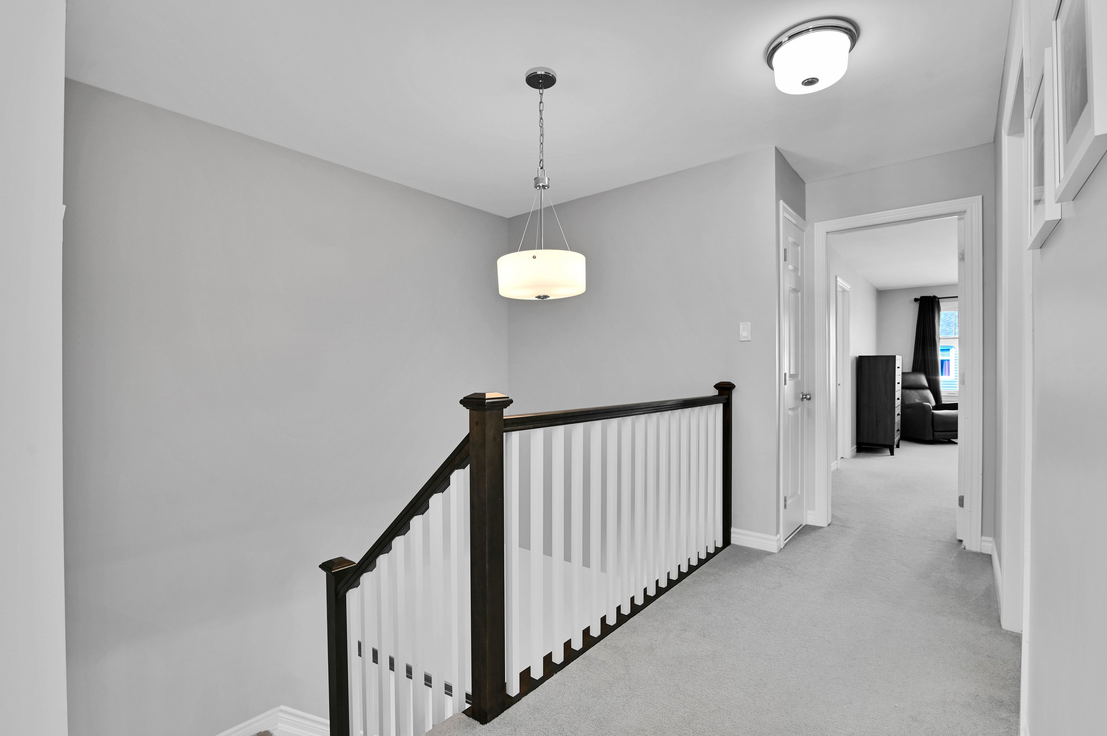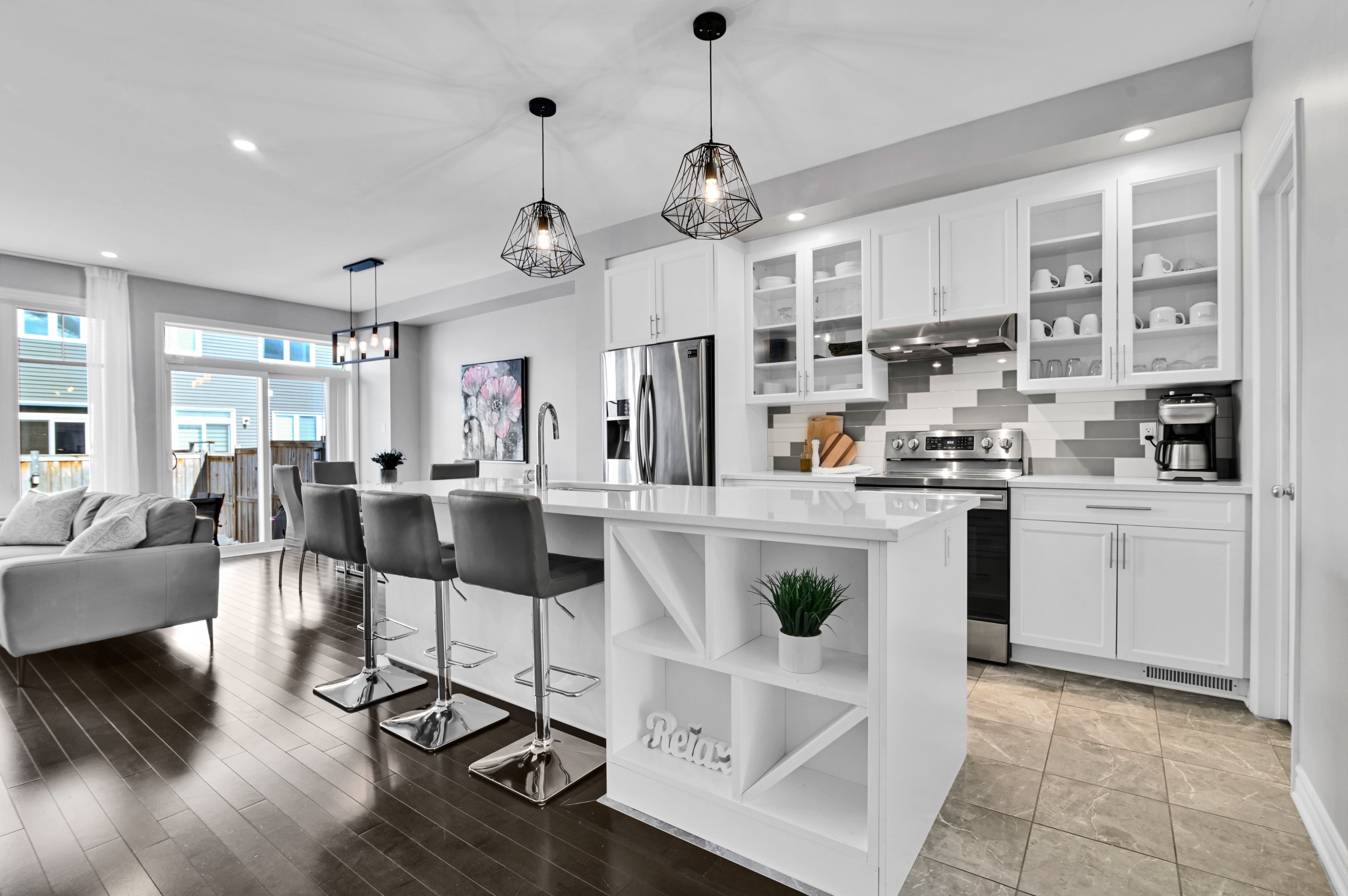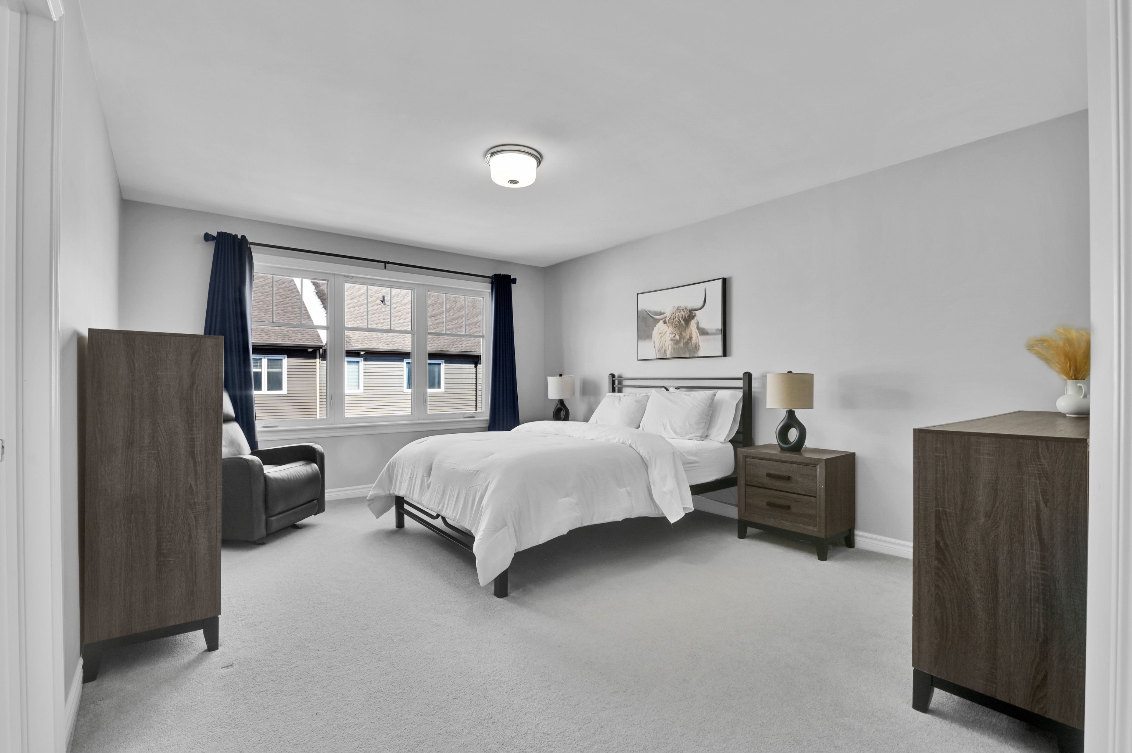 Welcome to this beautifully appointed chelsea model townhome by tamarack, offering an exceptional blend of space, style, and functionality. The main level impresses with soaring 9-foot ceilings and stunning hardwood floors that flow seamlessly throughout. The modern kitchen is designed for both everyday living and entertaining, featuring stainless steel appliances, a large island with granite counters, and large pantry for ample storage. The inviting living room is anchored by a striking gas fireplace with a stone tile surround and elegant mantle - perfect for cozy evenings at home. Upstairs, you'll find three generously sized bedrooms, including a spacious primary retreat complete with his and hers walk-in closets and a modern 4-piece ensuite with glass shower. The convenience of second-floor laundry and an additional full bathroom enhances the home's practical layout. The fully finished lower level offers a versatile rec room ideal for a home theatre, gym, or play space, while still having space for a potential home office and plenty of additional storage. Step outside to enjoy the fully fenced backyard, featuring a beautifully finished interlock patio completed last year - perfect for outdoor dining and relaxation. This thoughtfully designed home delivers outstanding square footage in one of tamarack's most sought-after layouts - ideal for families and professionals alike.