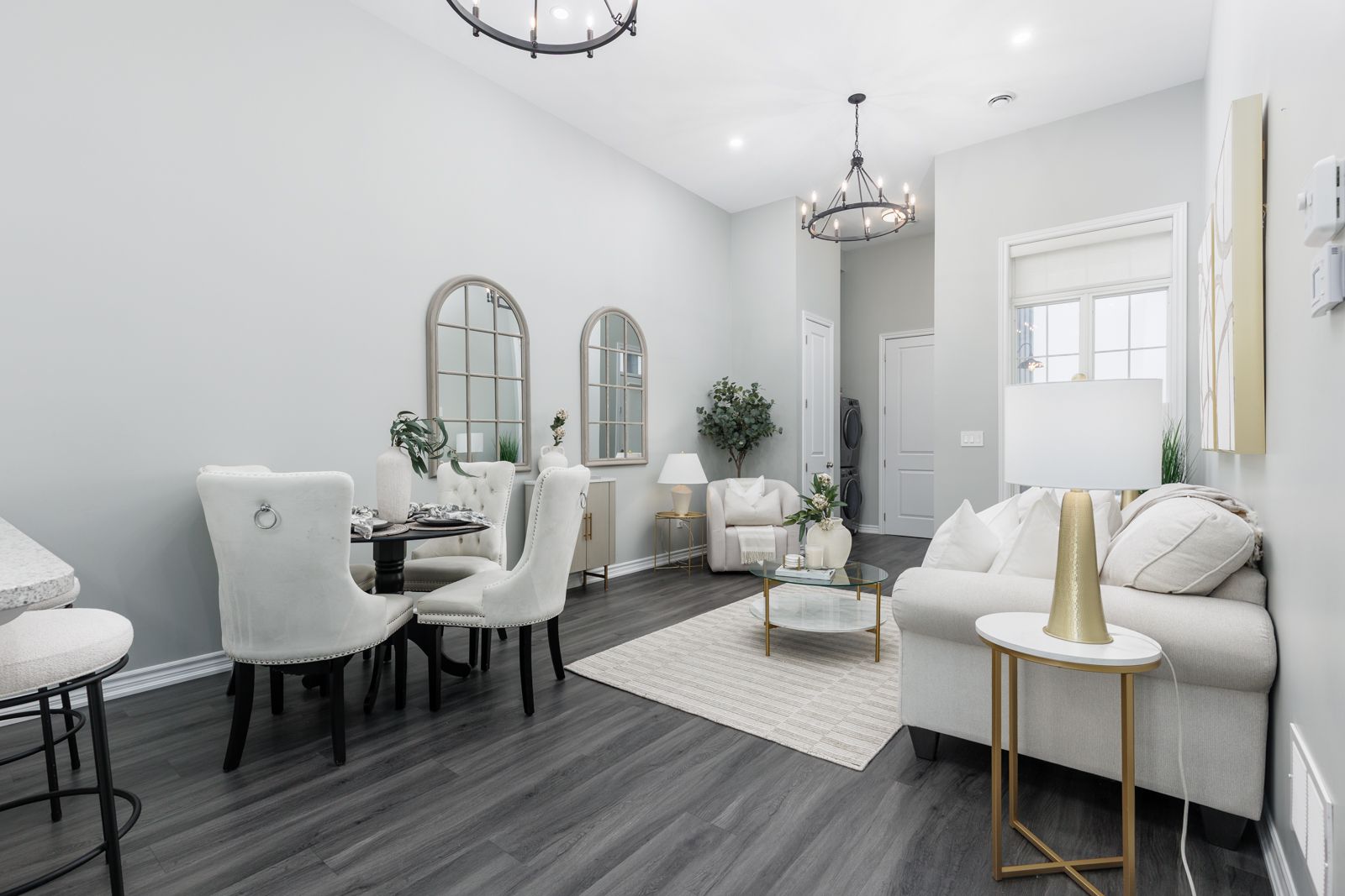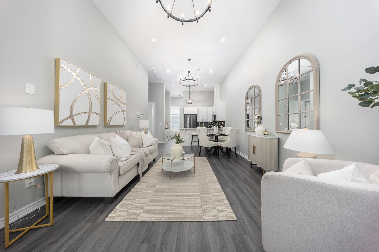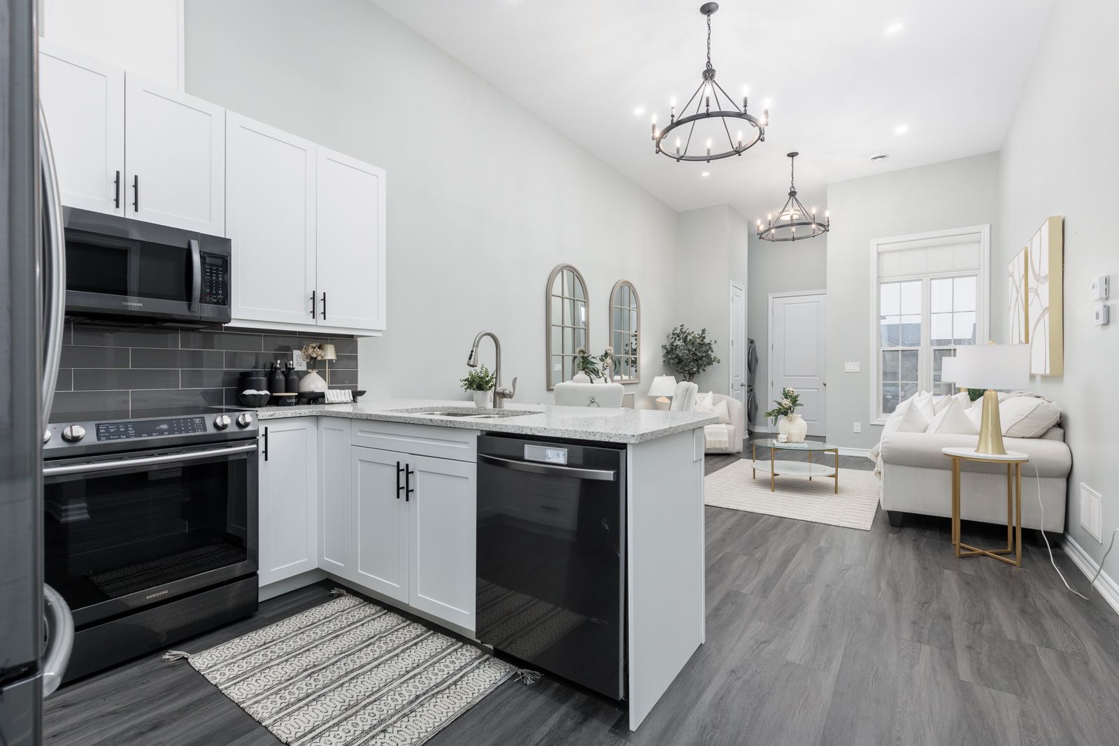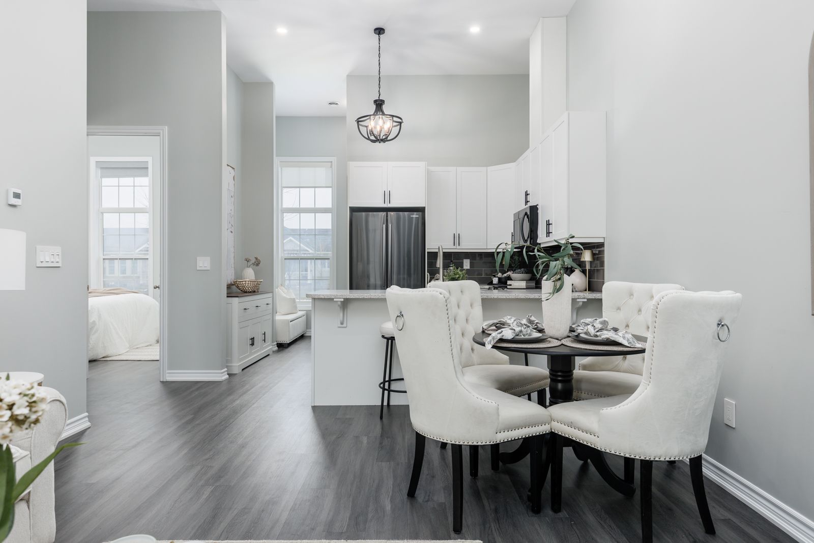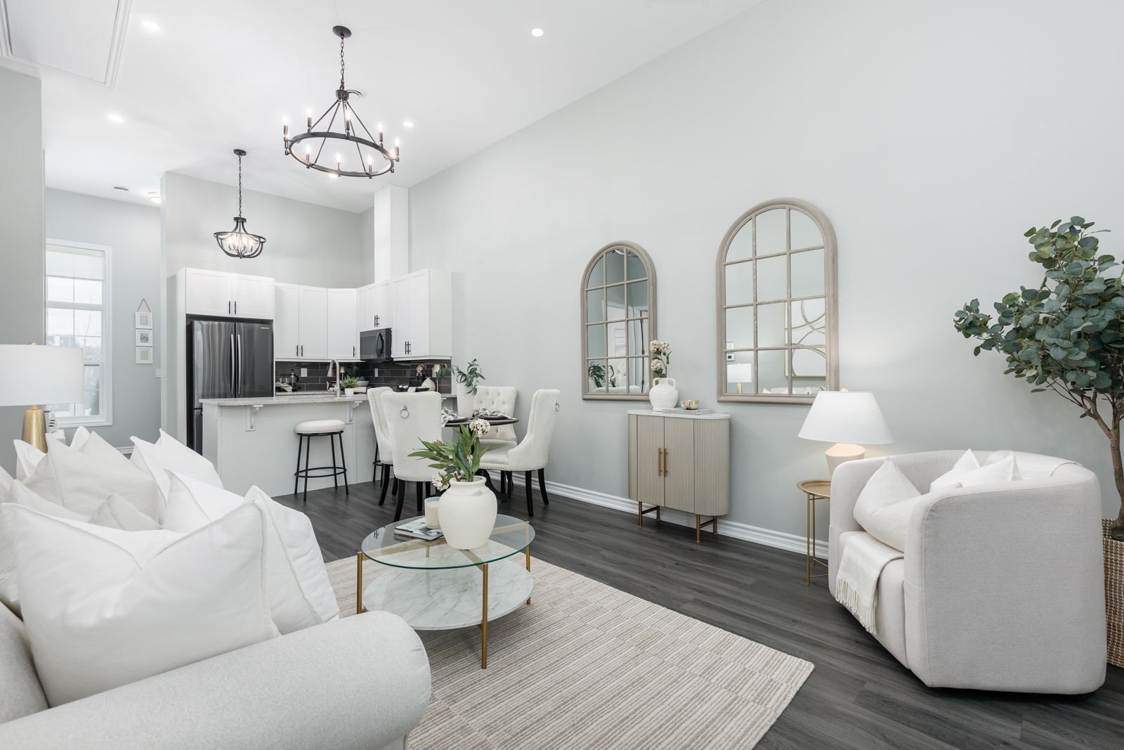 • Open concept design with high ceilings and large windows for brightness.