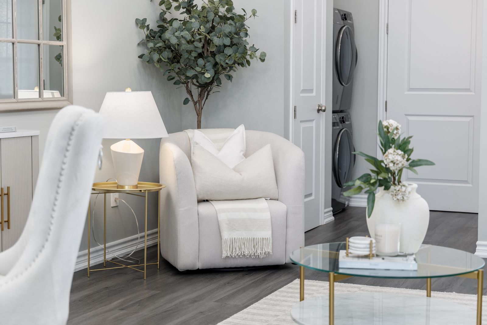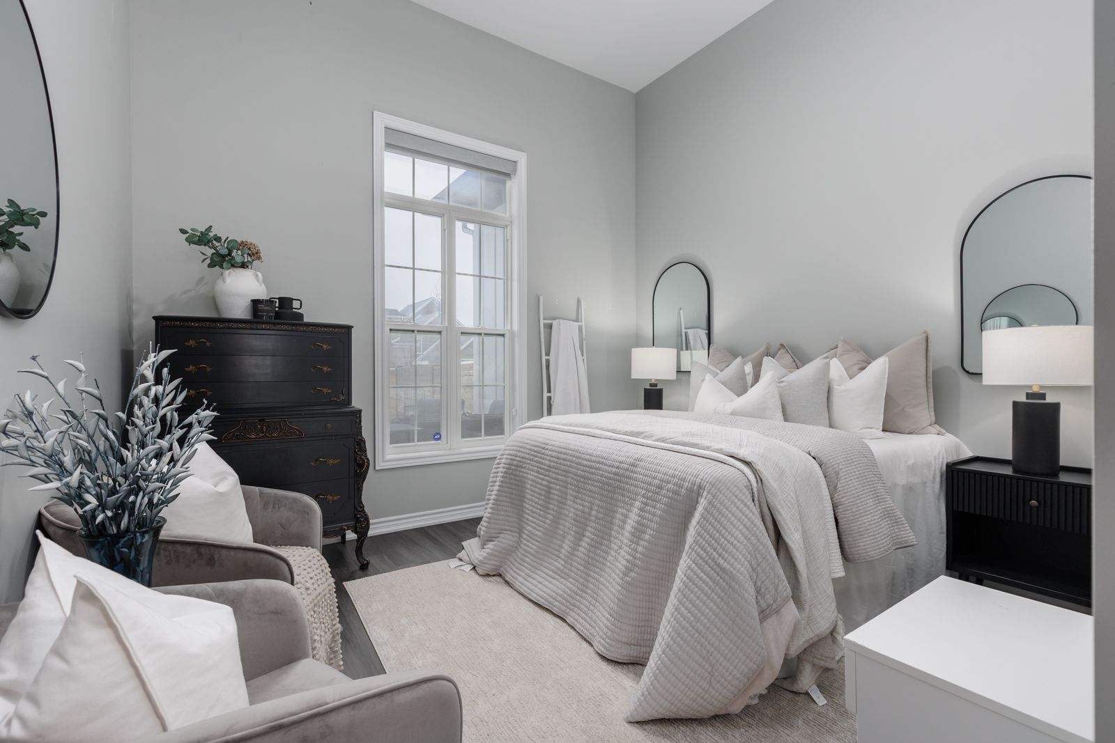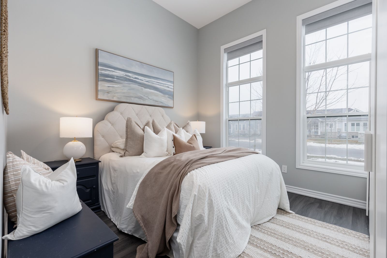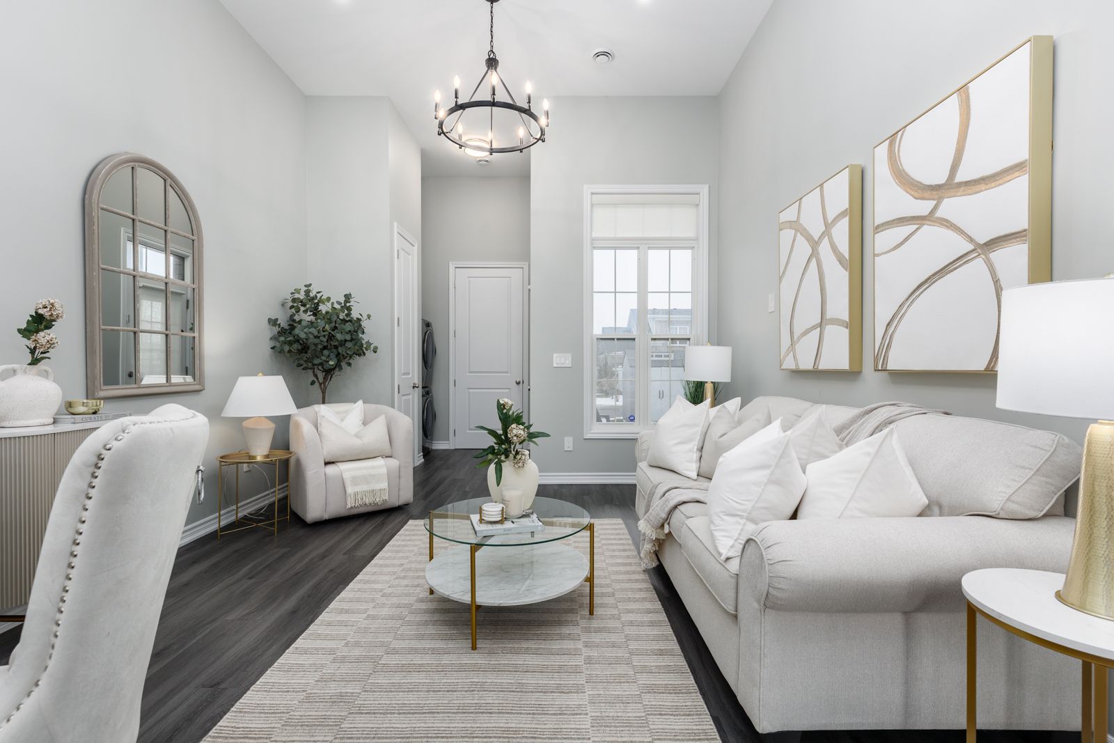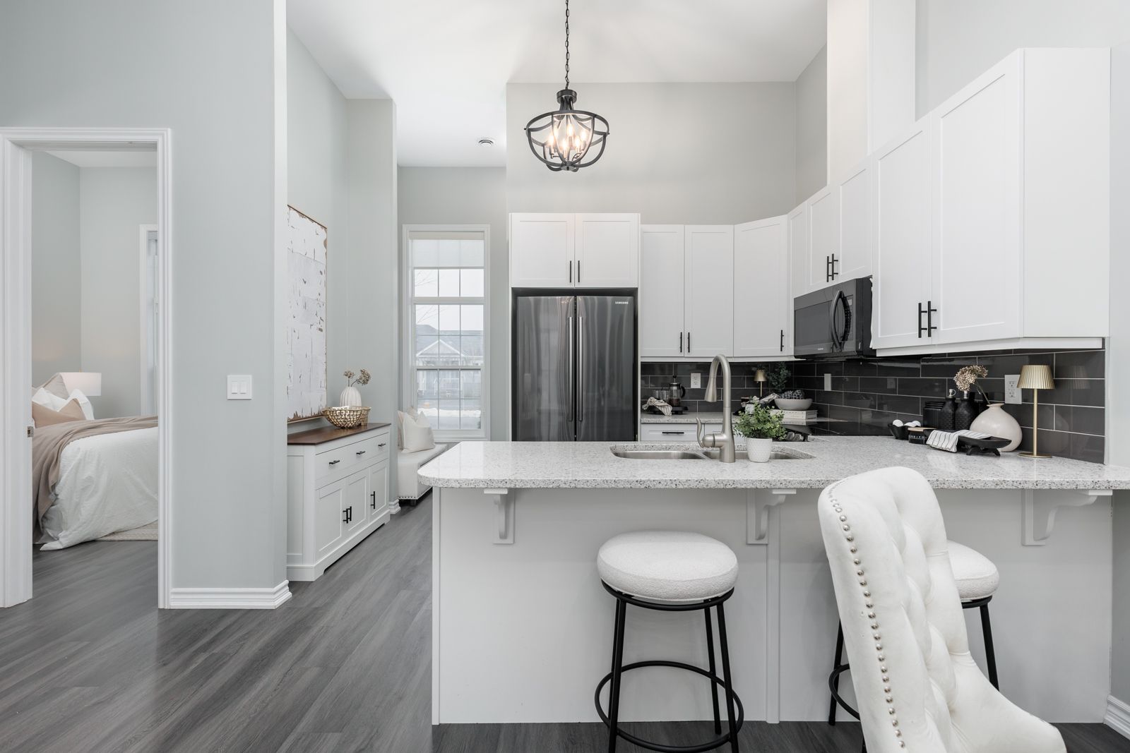 • Open concept design with high ceilings and large windows for brightness.