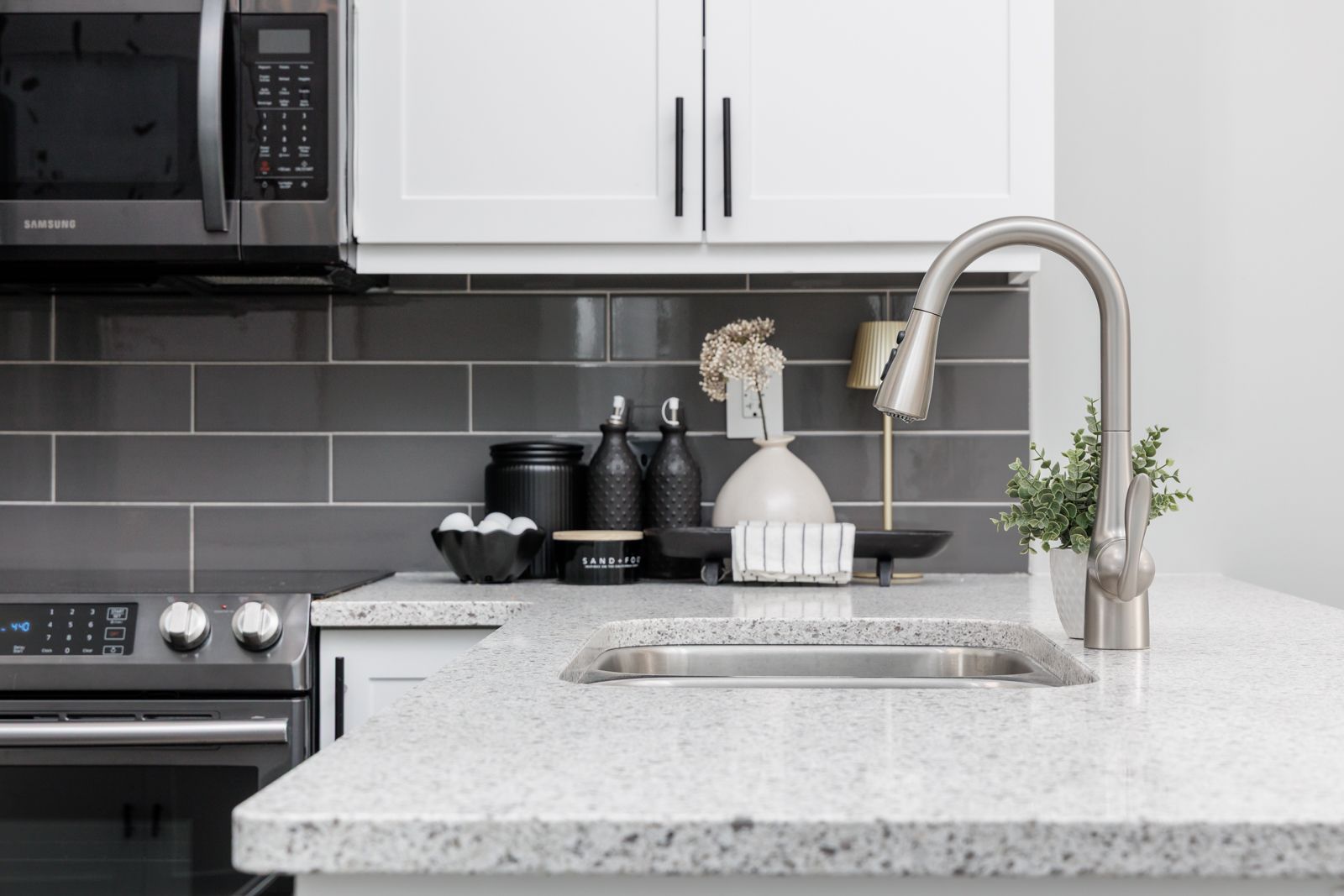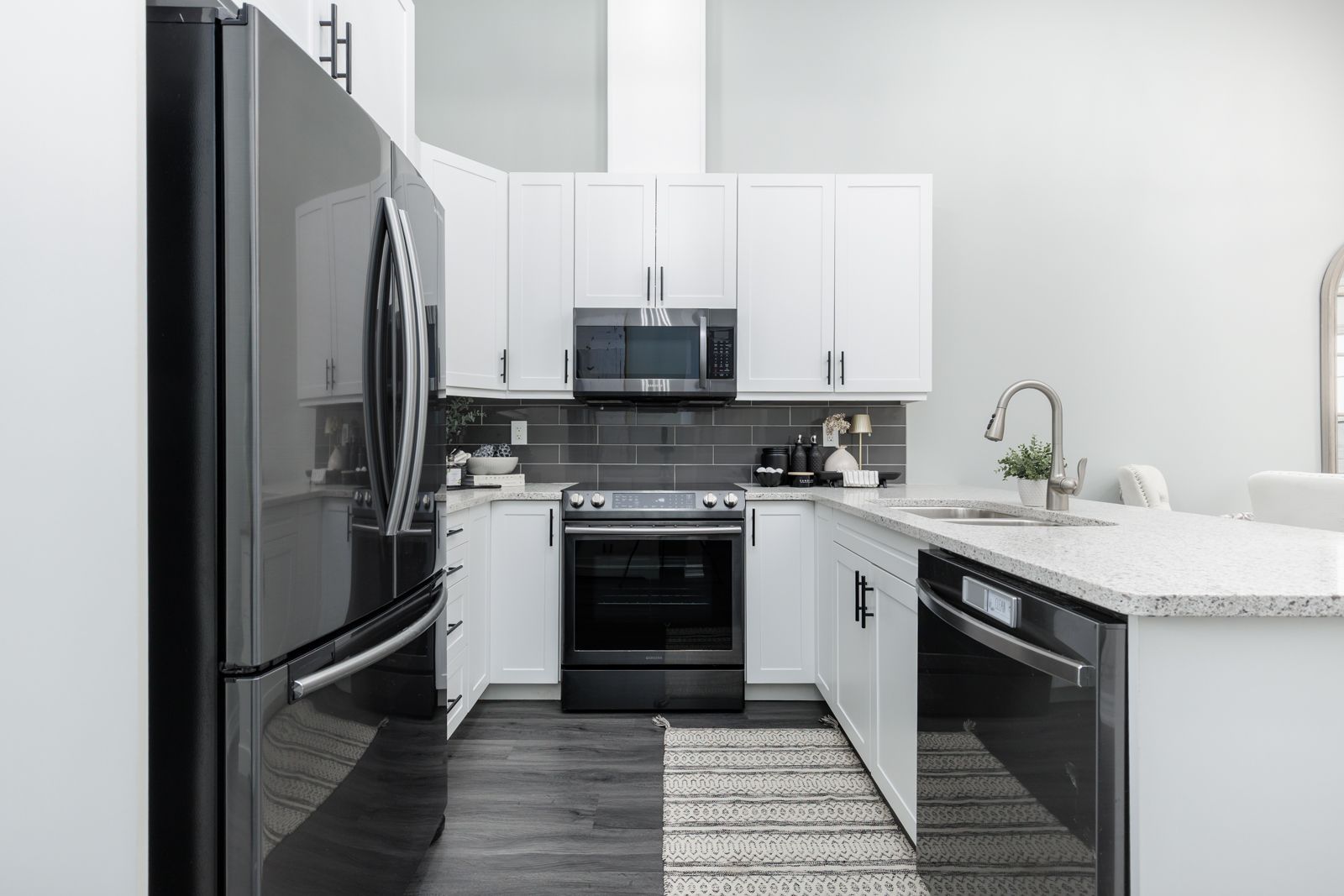 • Well-equipped kitchen features stainless steel appliances and granite countertops.