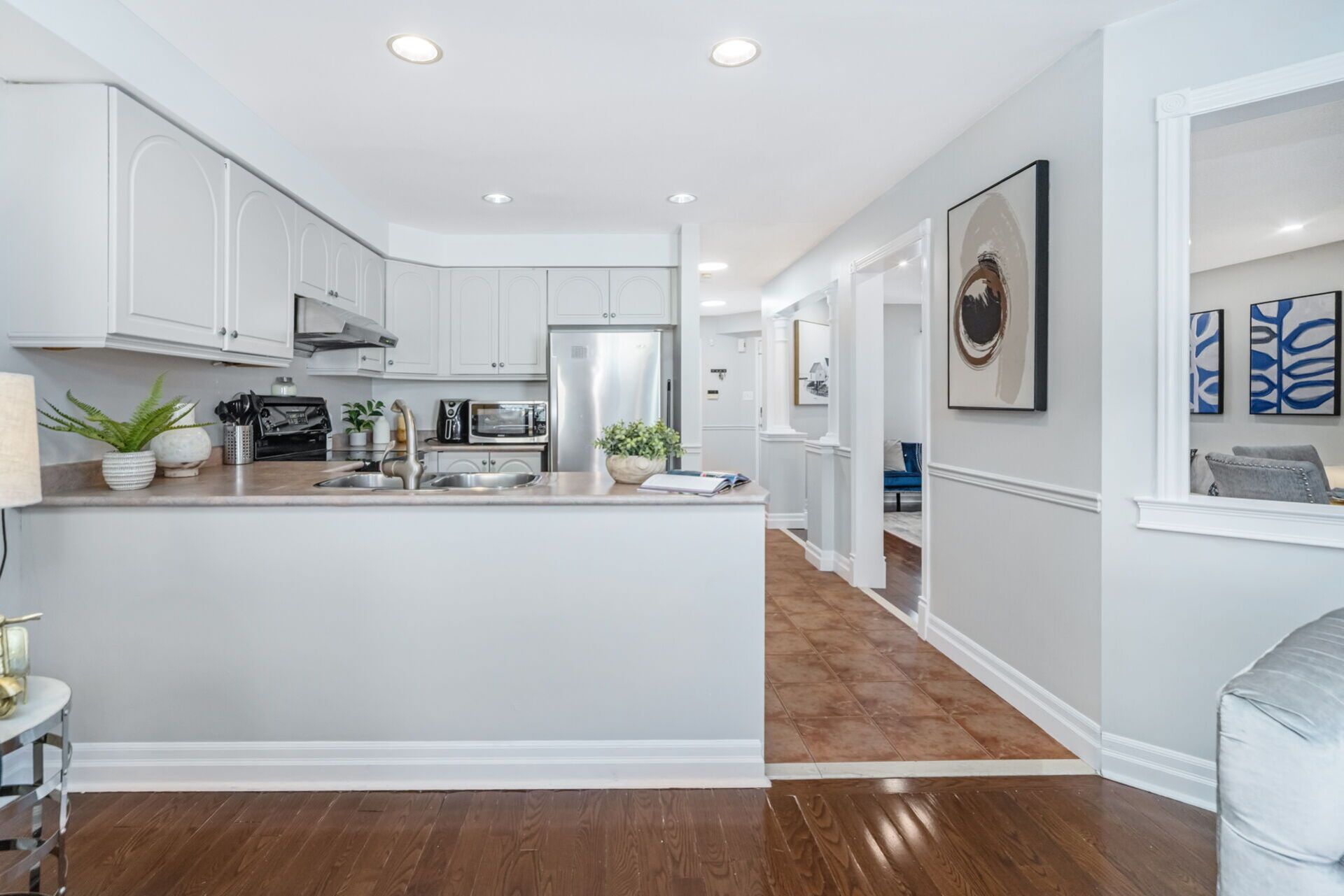 • Open-concept main floor with hardwood flooring and modern kitchen.