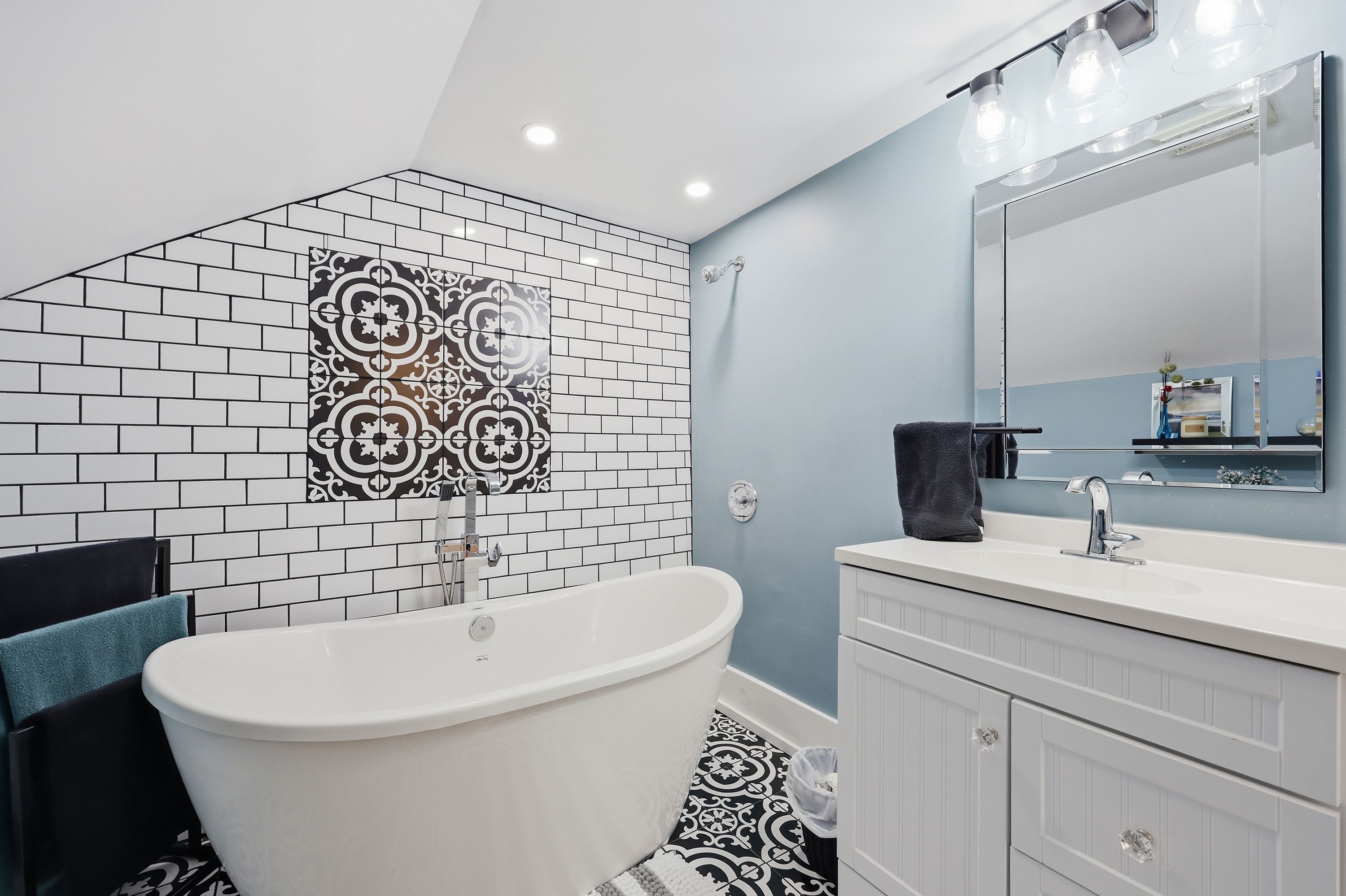 • Upstairs features a primary bedroom, two more bedrooms, and a spa-like bathroom.