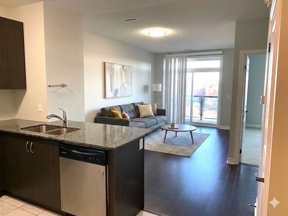 Beautiful 1-bedroom + den condo located in a highly sought-after neighborhood. This bright and modern suite features an open-concept layout with stainless steel appliances and quartz countertops in the kitchen. Elegant laminate flooring and 9-foot ceilings add a stylish, contemporary feel throughout the space. Enjoy the convenience of in-suite laundry and step out onto a spacious private balcony, perfect for relaxing or entertaining. This lease also includes 1 underground parking space and a storage locker for added convenience. Residents have access to excellent building amenities, including a fully equipped fitness centre and a welcoming party room. Ideally situated with easy access to public transit, schools, and shopping, and just minutes from highways 401 and 407, offering exceptional connectivity across the gta.